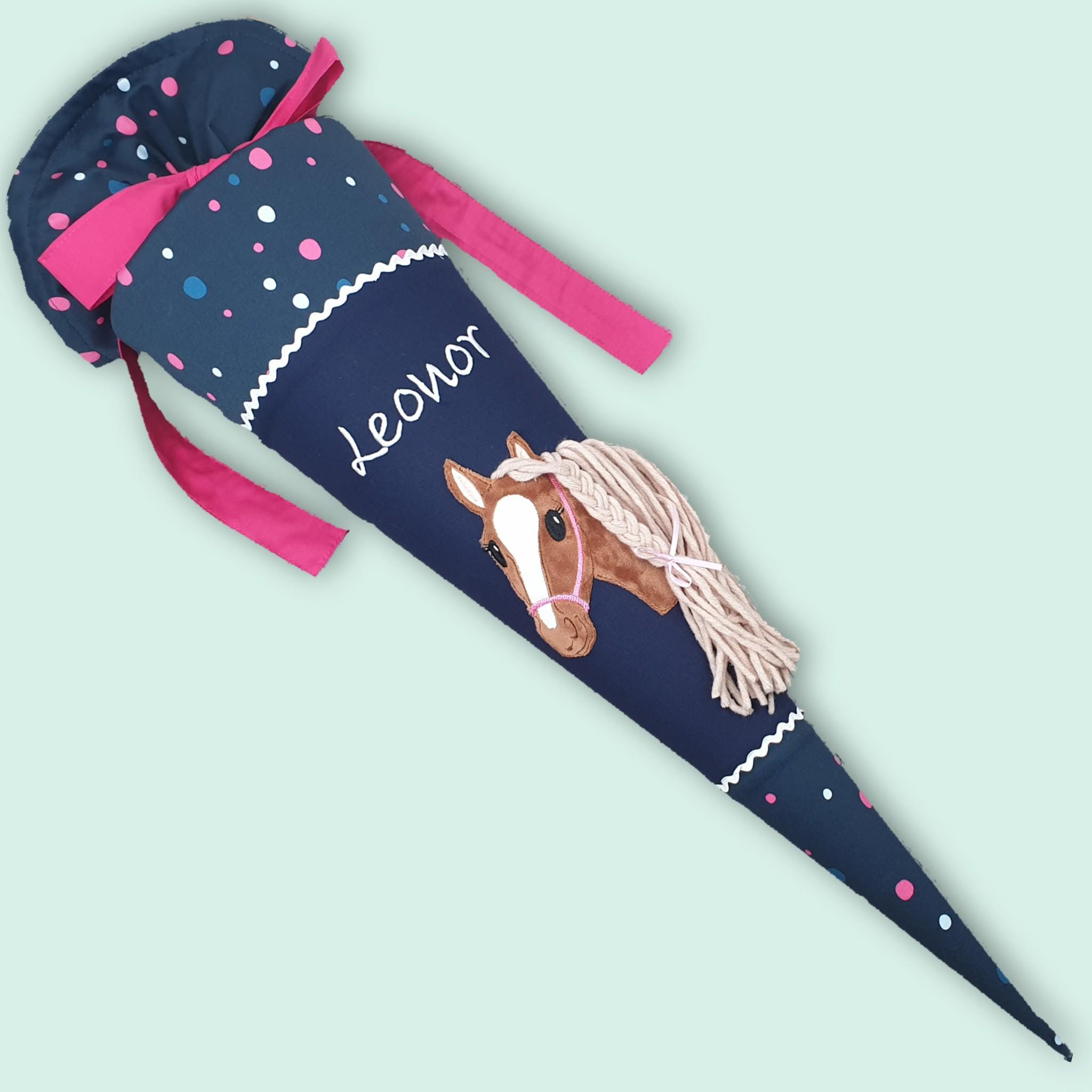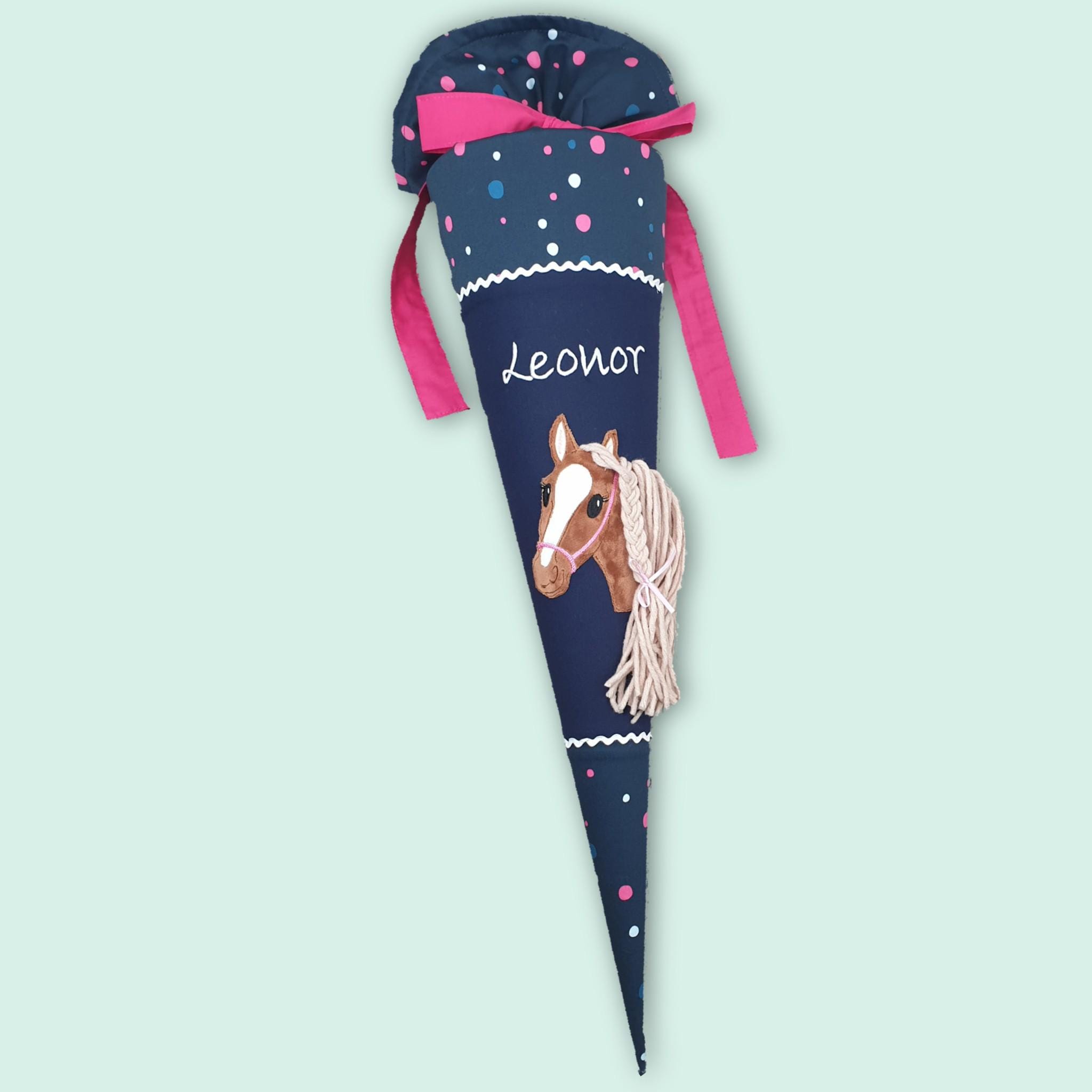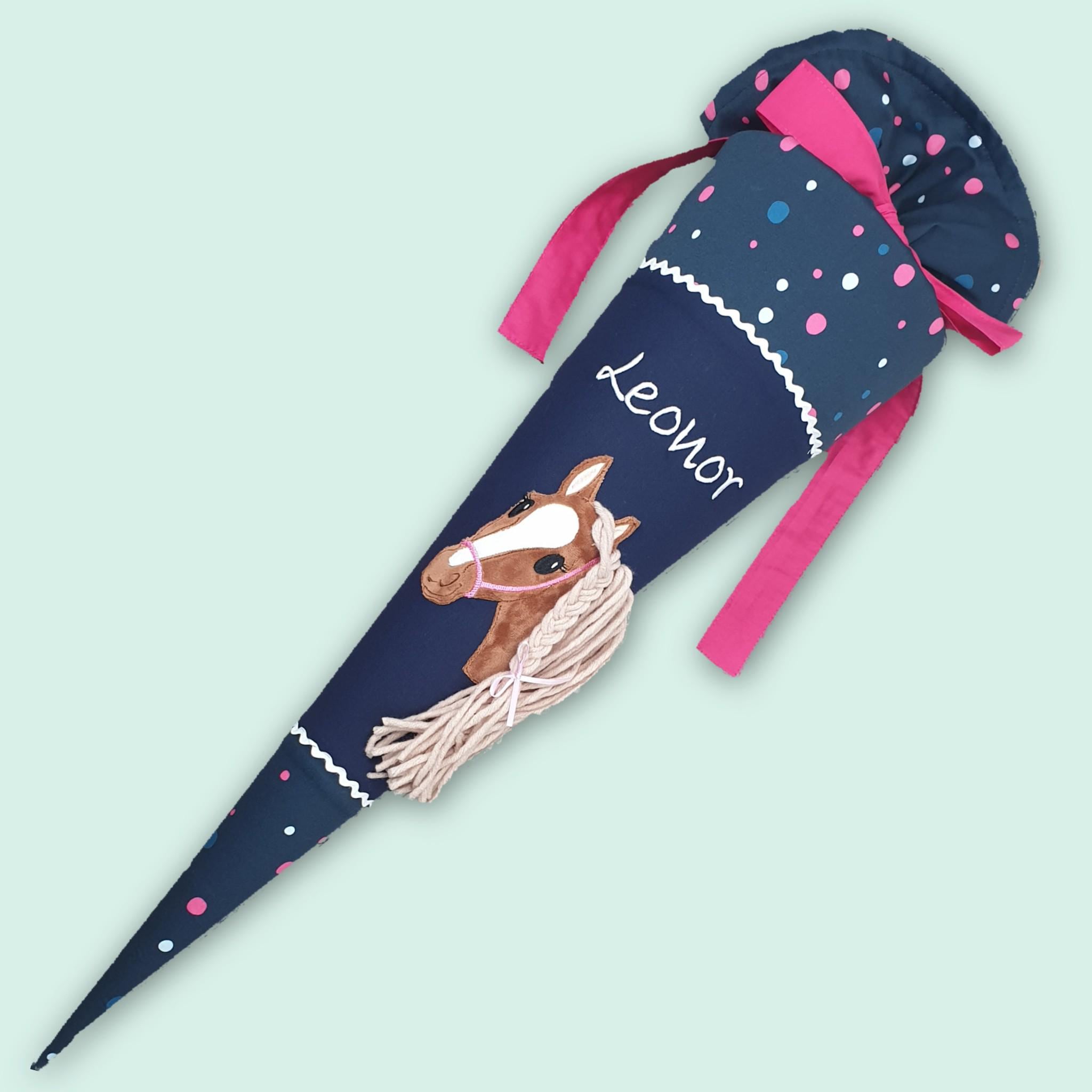 Schultüte mit Pferd und Namen farblich auf den Ergobag Phantbärsiewelt Schulranzen abgestimmt.