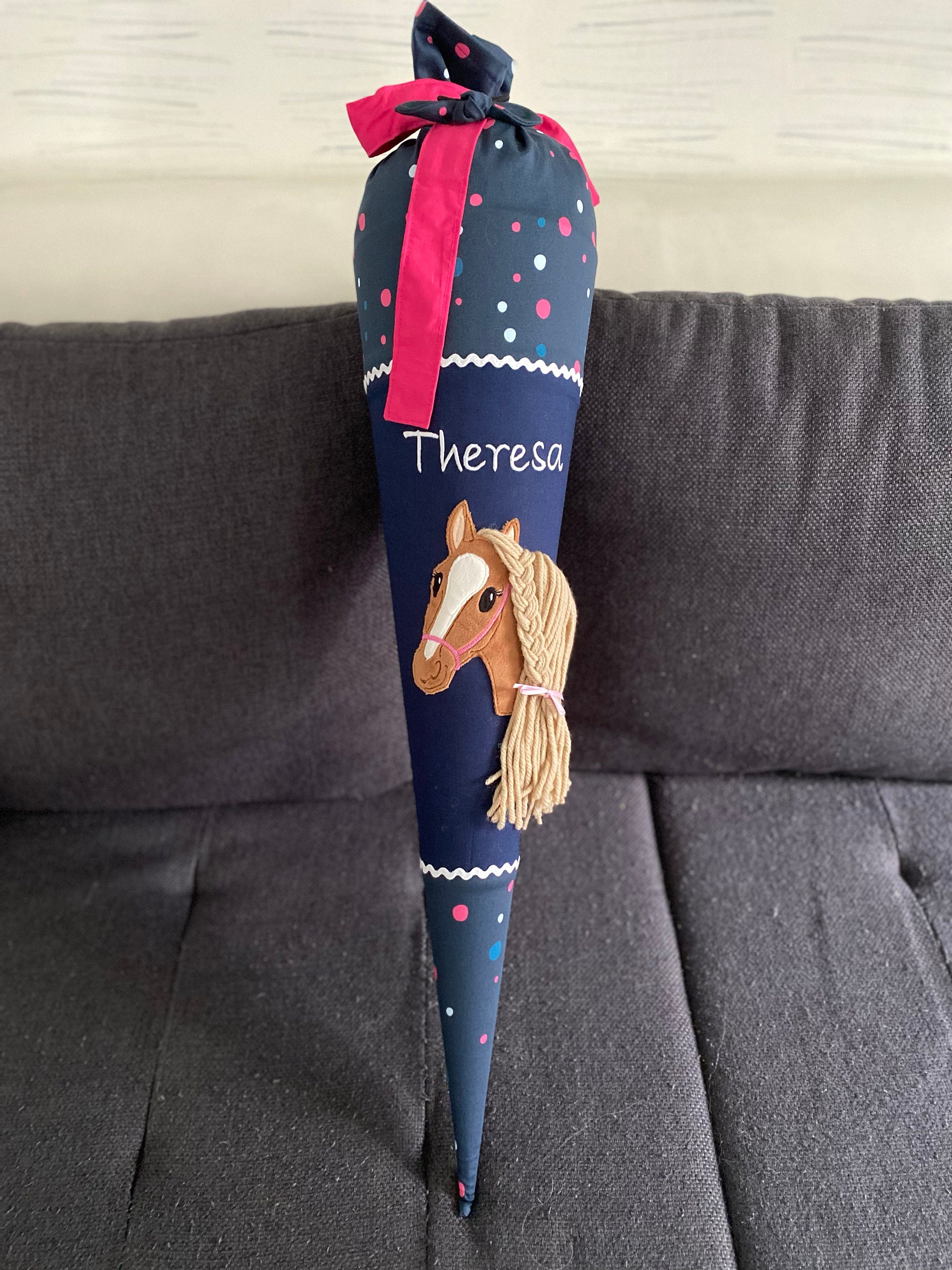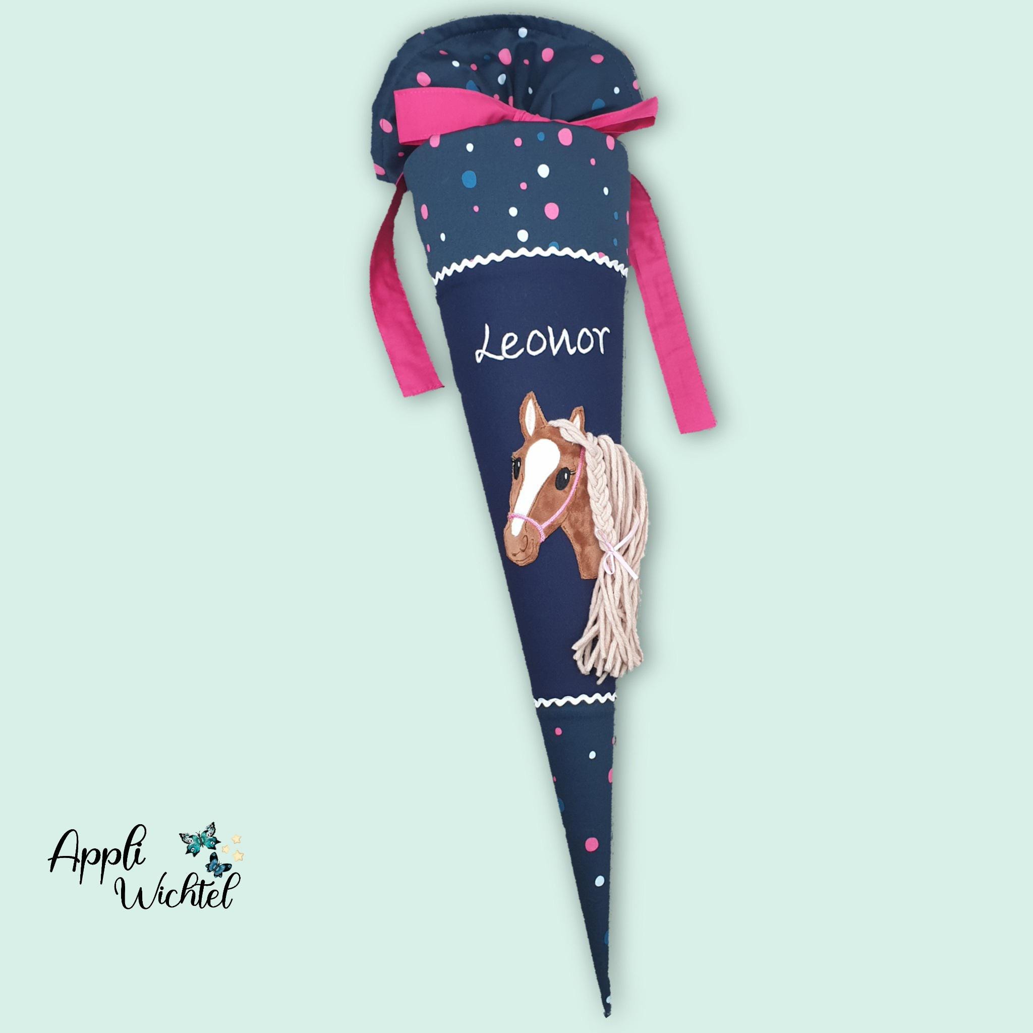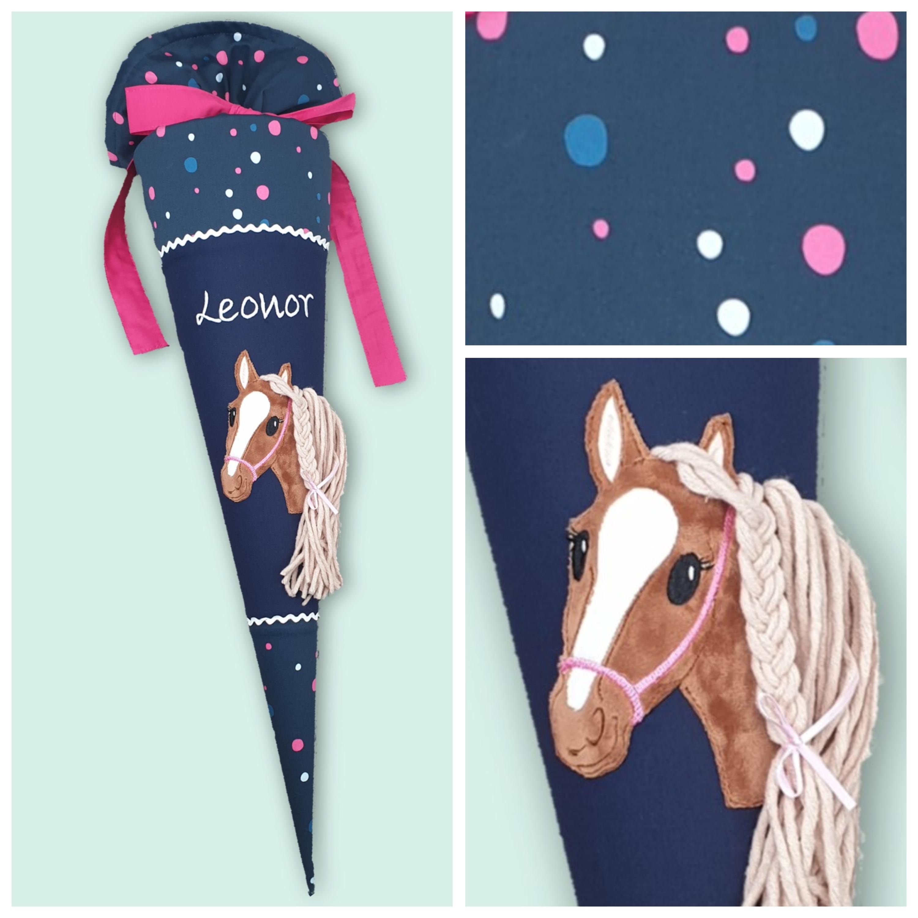 Schultüte mit Pferd und Namen farblich auf den Ergobag Phantbärsiewelt Schulranzen abgestimmt.