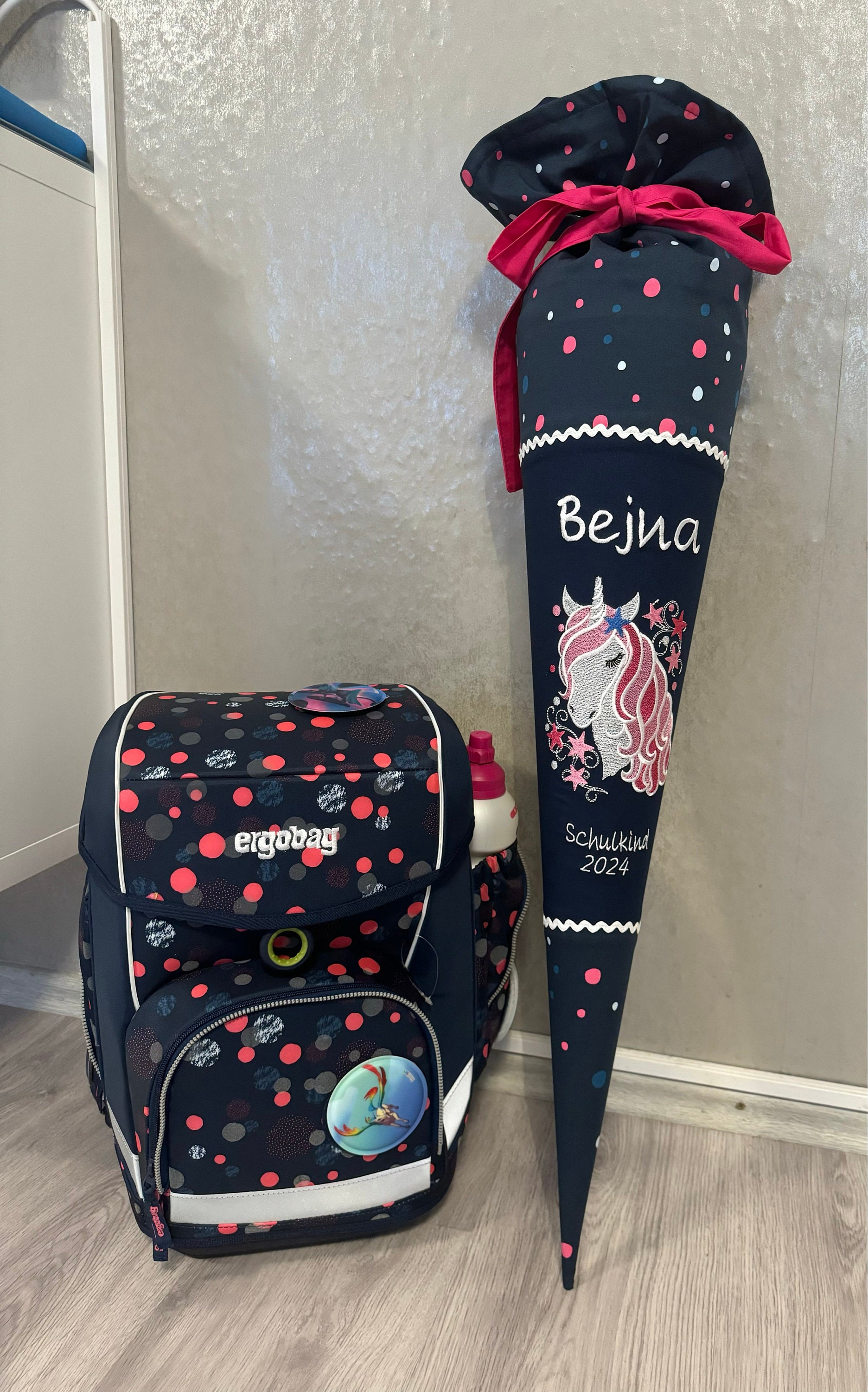 Schultüte mit Einhorn und Namen farblich auf den Ergobag Phantbärsiewelt Schulranzen abgestimmt.