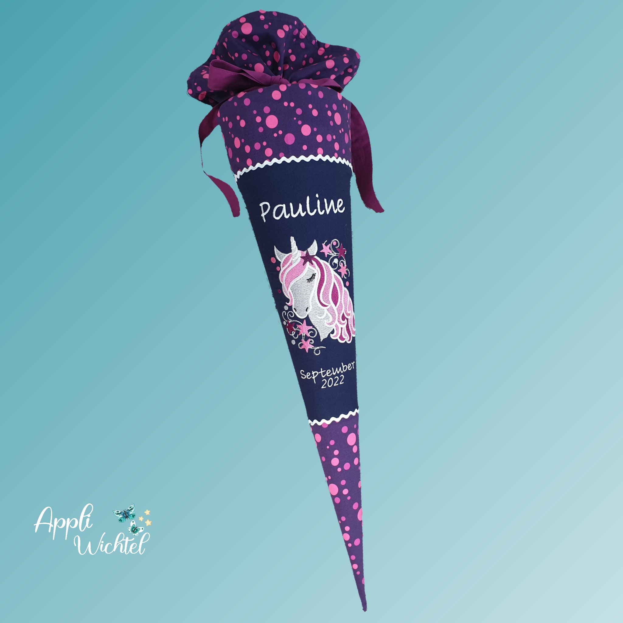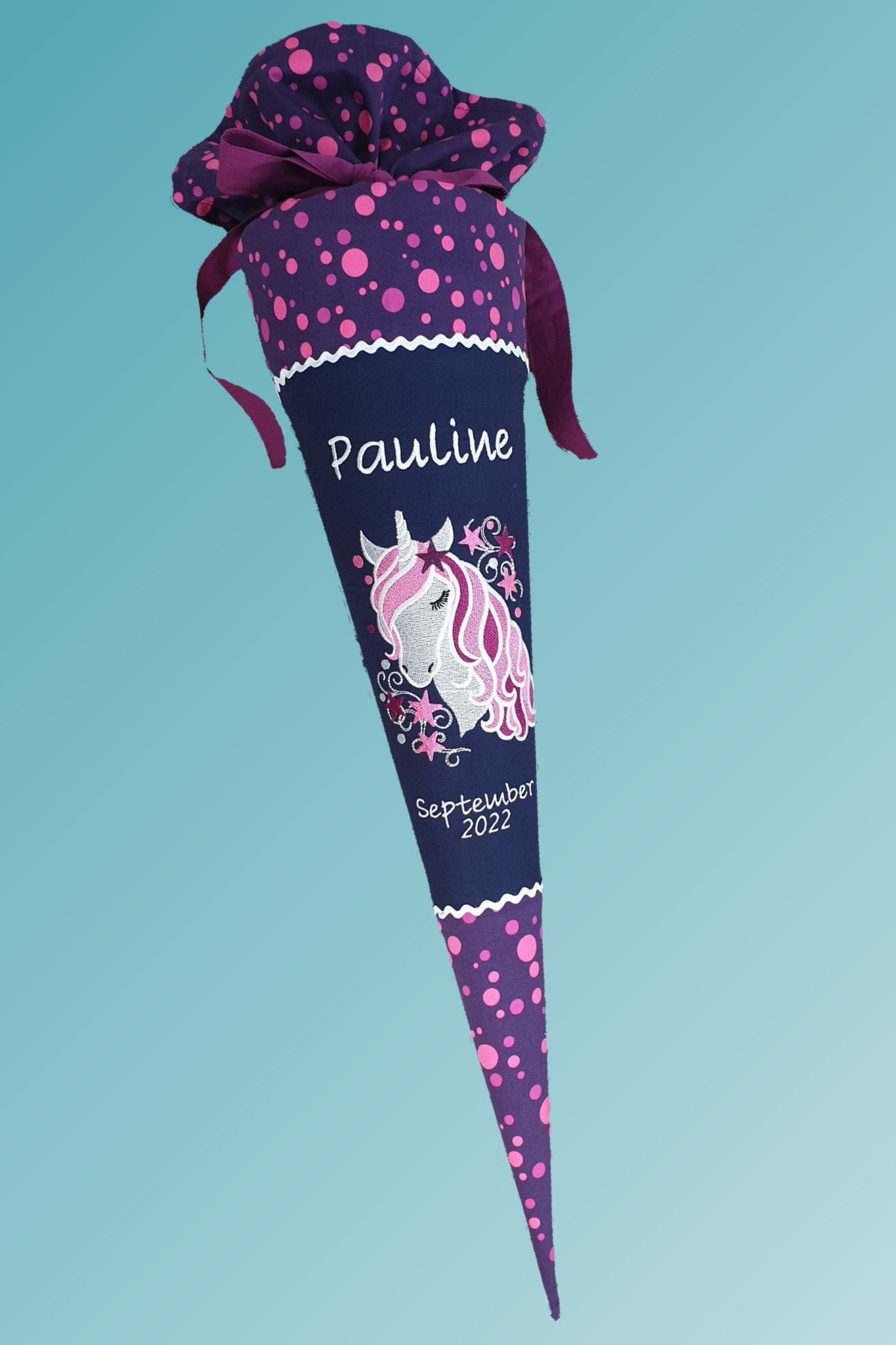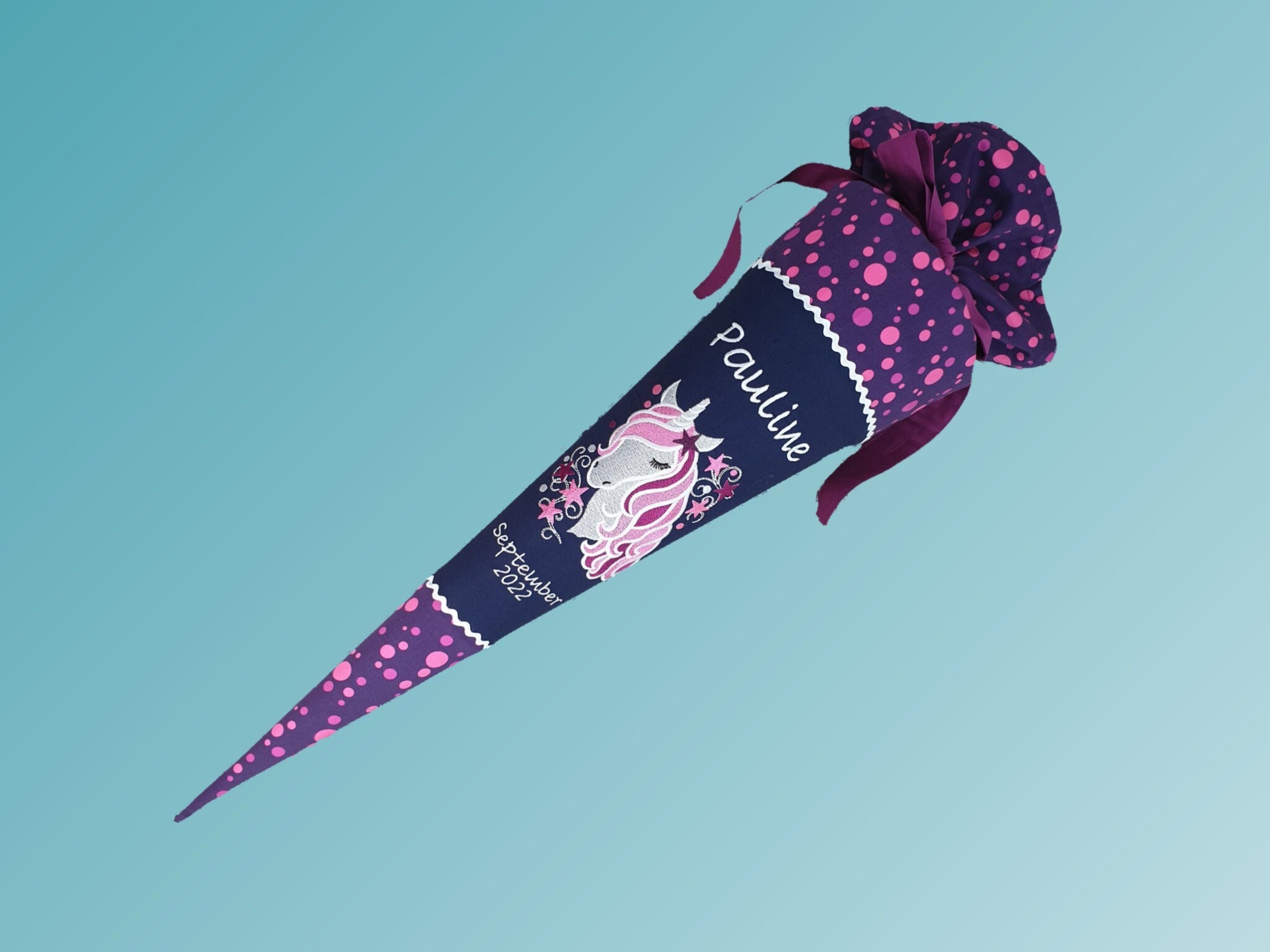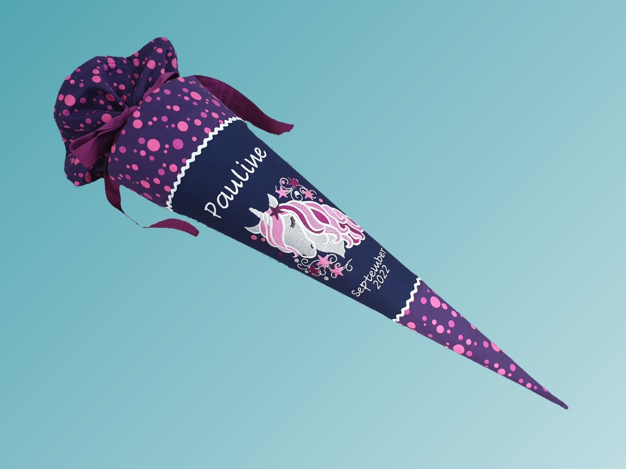 Jede Schultüte wird mit einem gestickten Motiv und dem Namen deines Kindes individuell gestaltet. Auf Wunsch fügen wir auch das Datum des ersten Schultages hinzu.