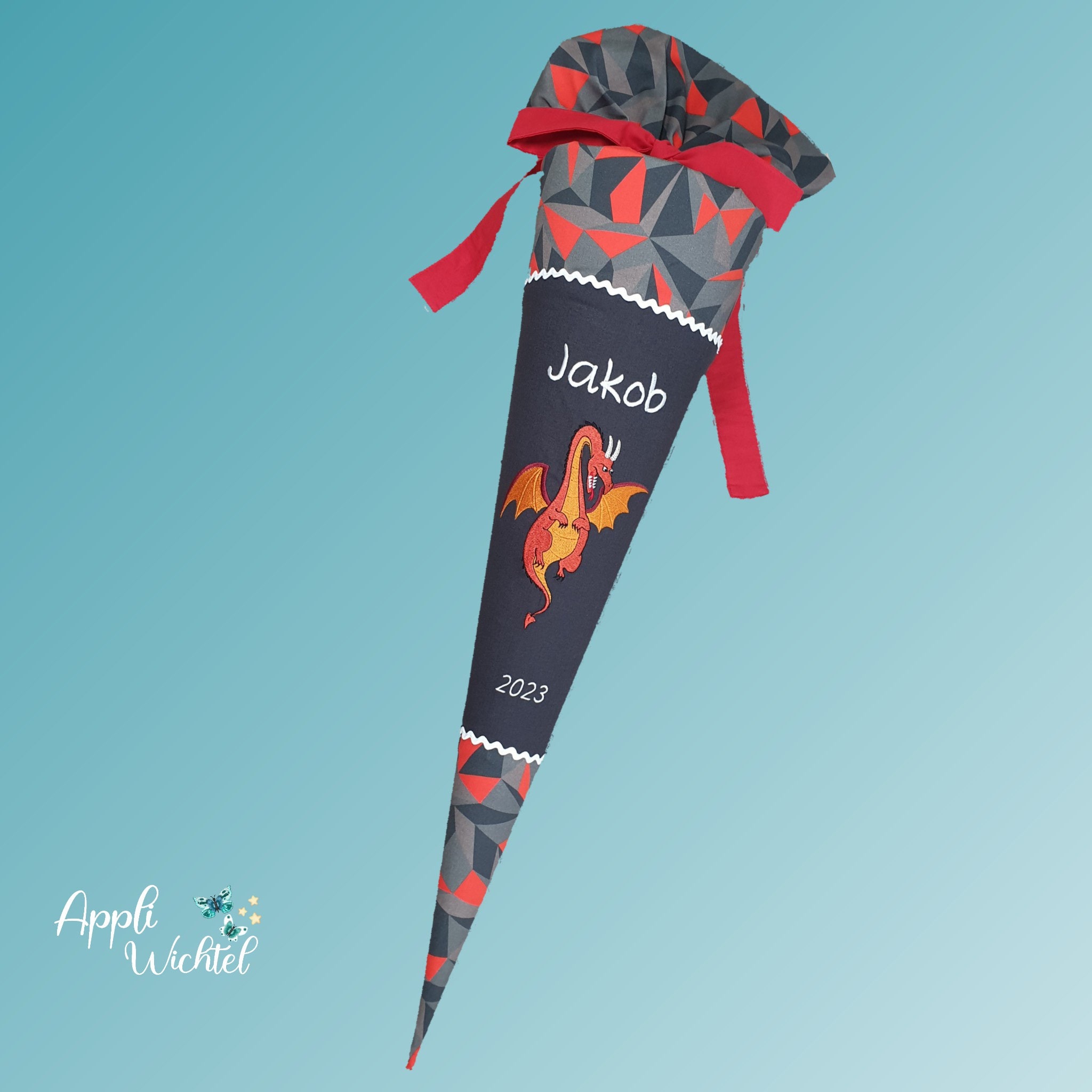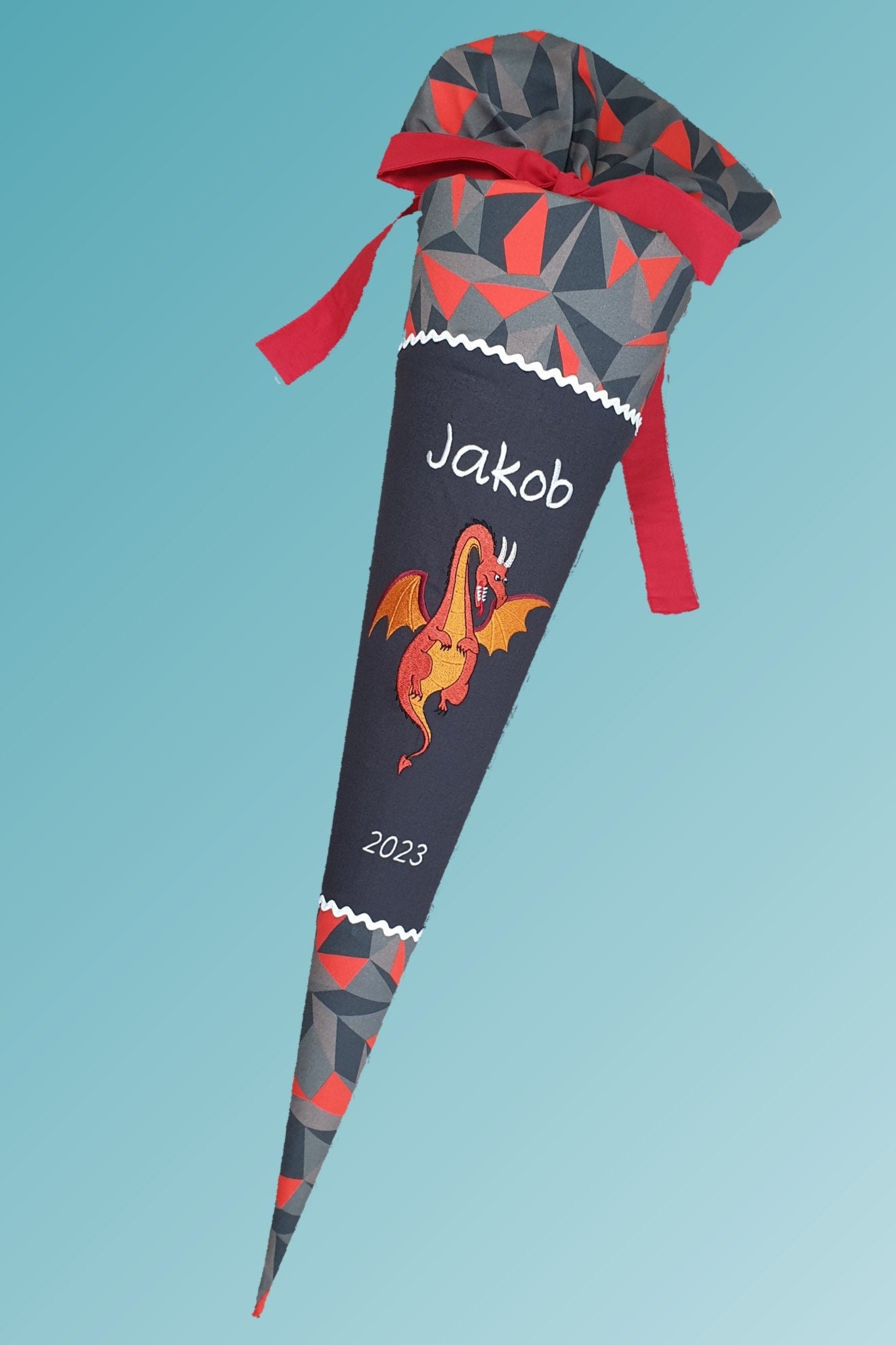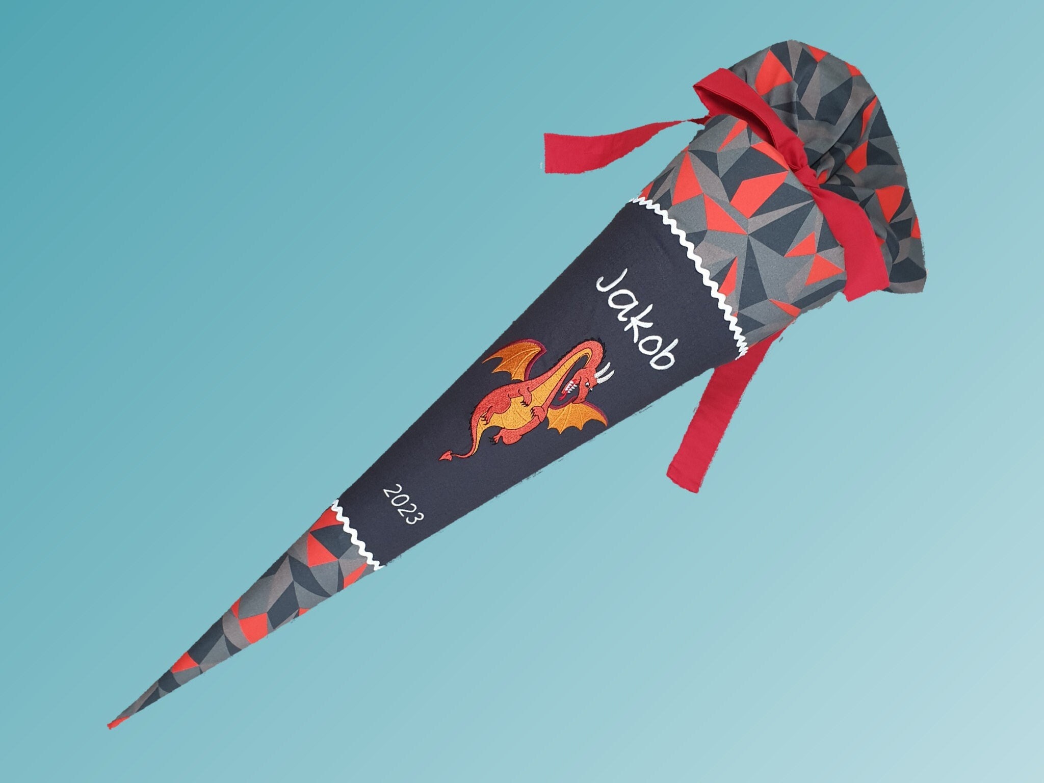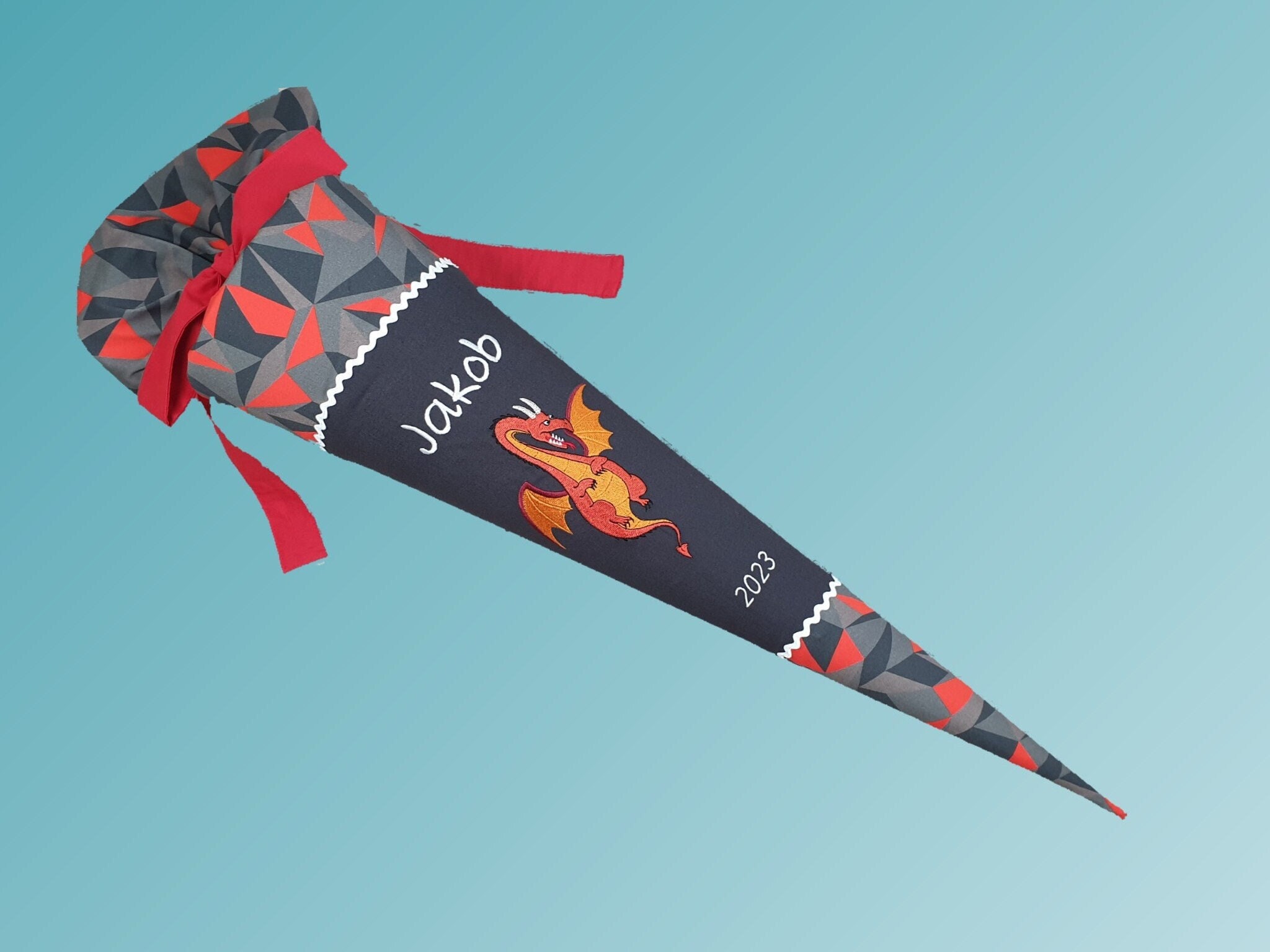 Schultüte mit Drachen und Namen farblich auf den Ergobag TaekBärdo Schulranzen abgestimmt.