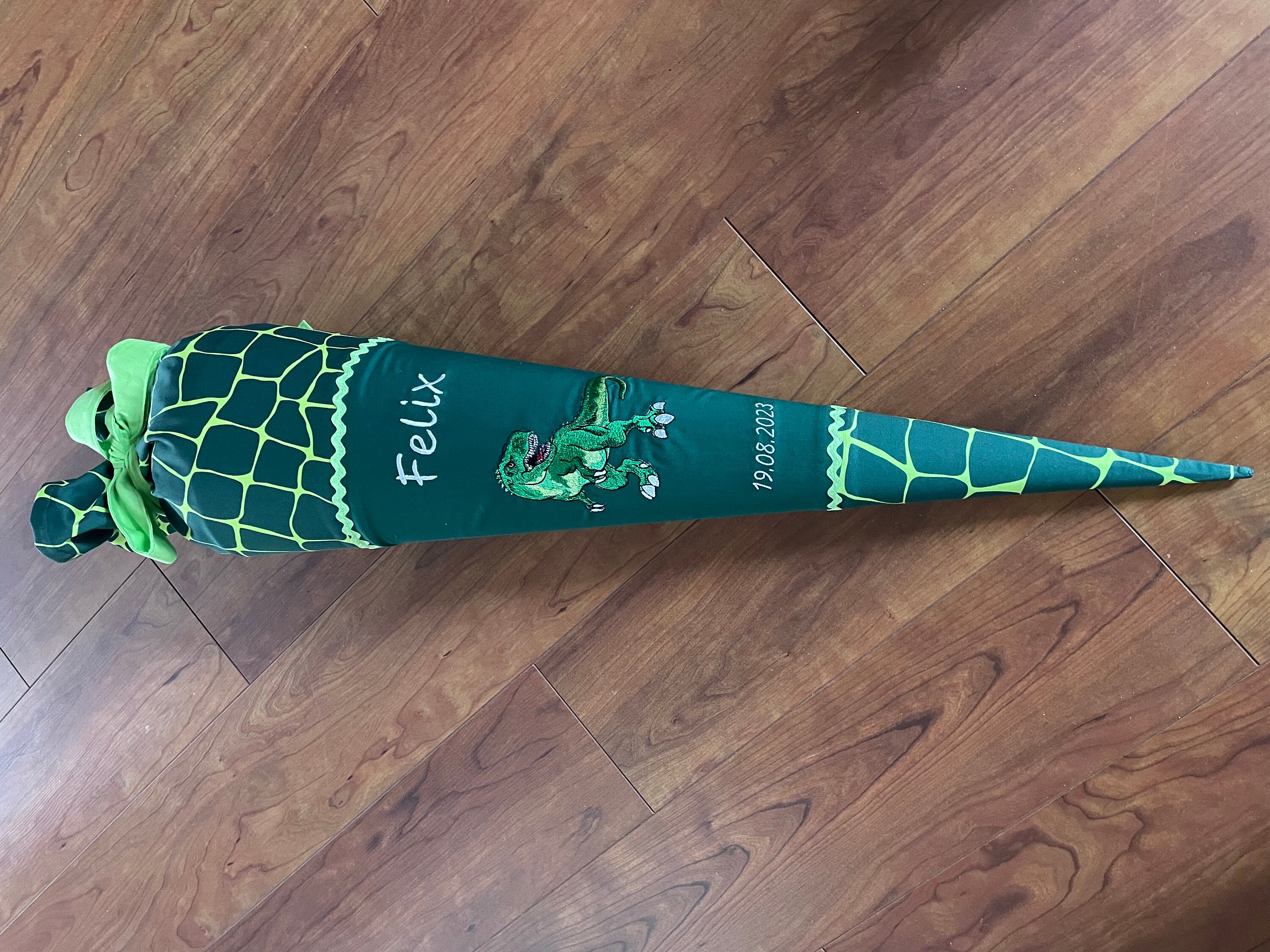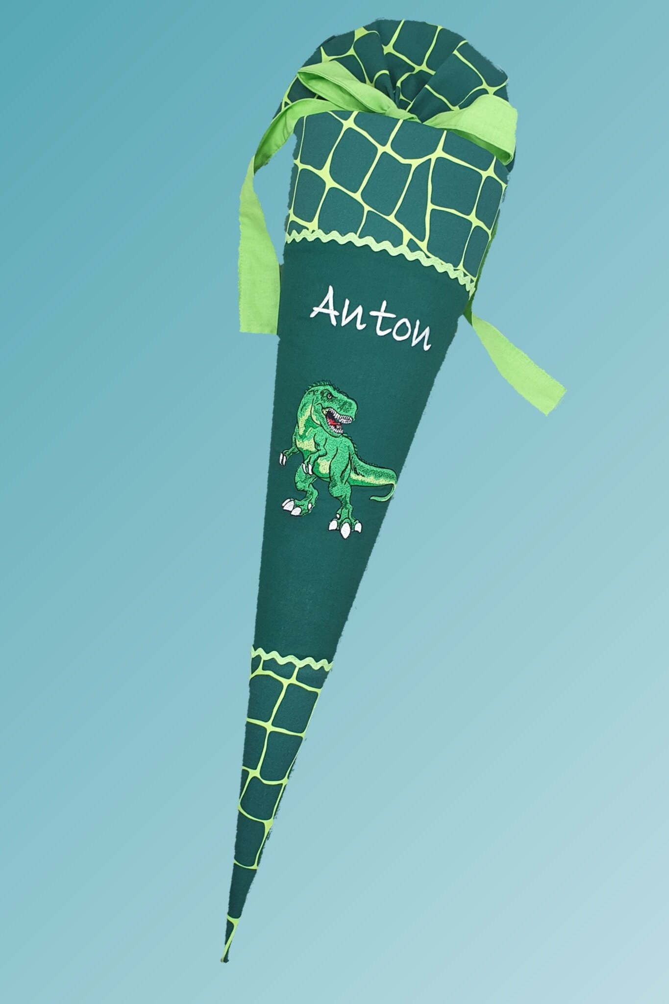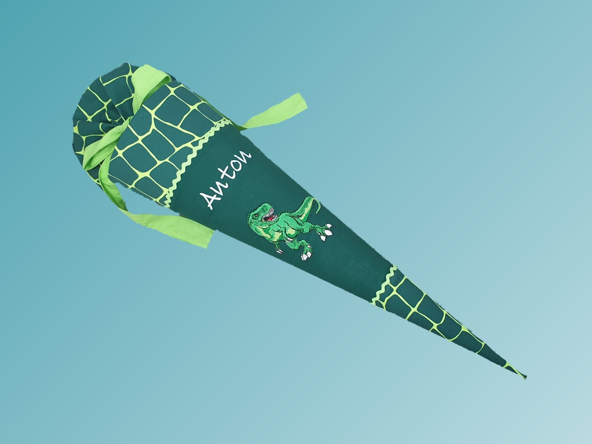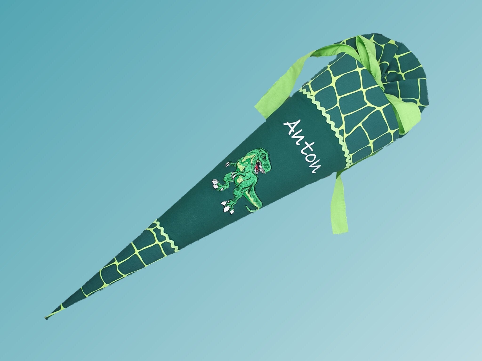 Schultüte mit Dinos und Namen farblich auf den Bärex Schulranzen abgestimmt.