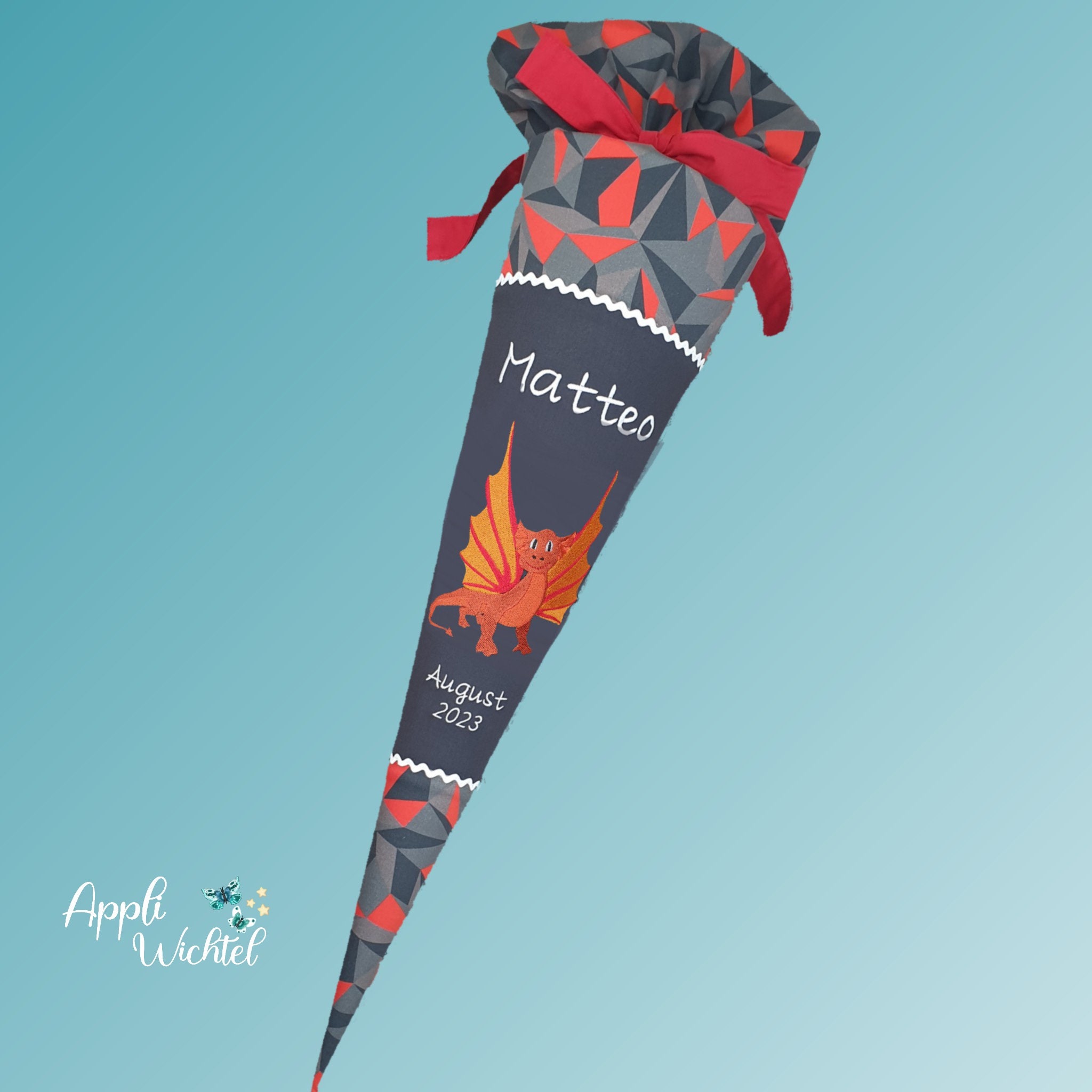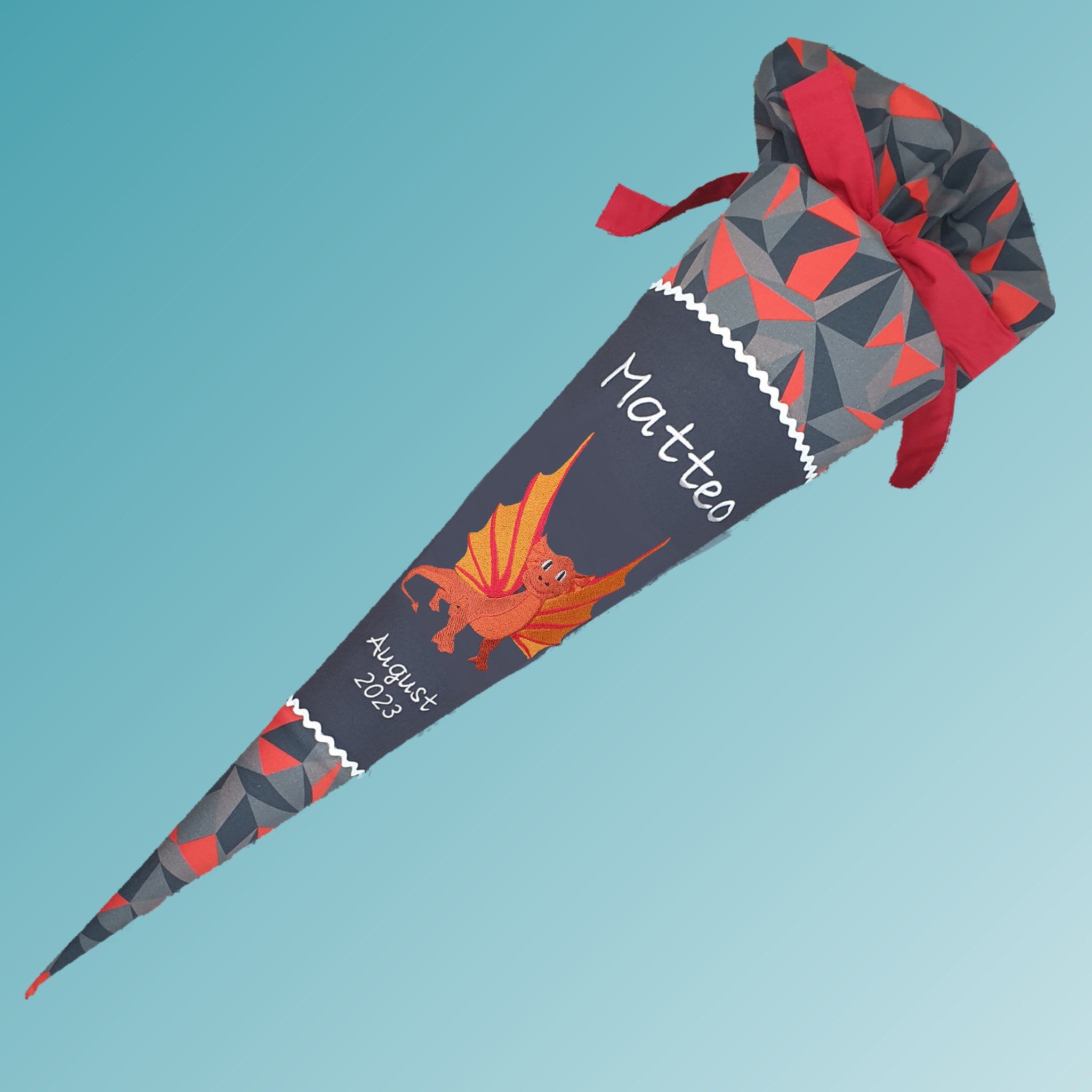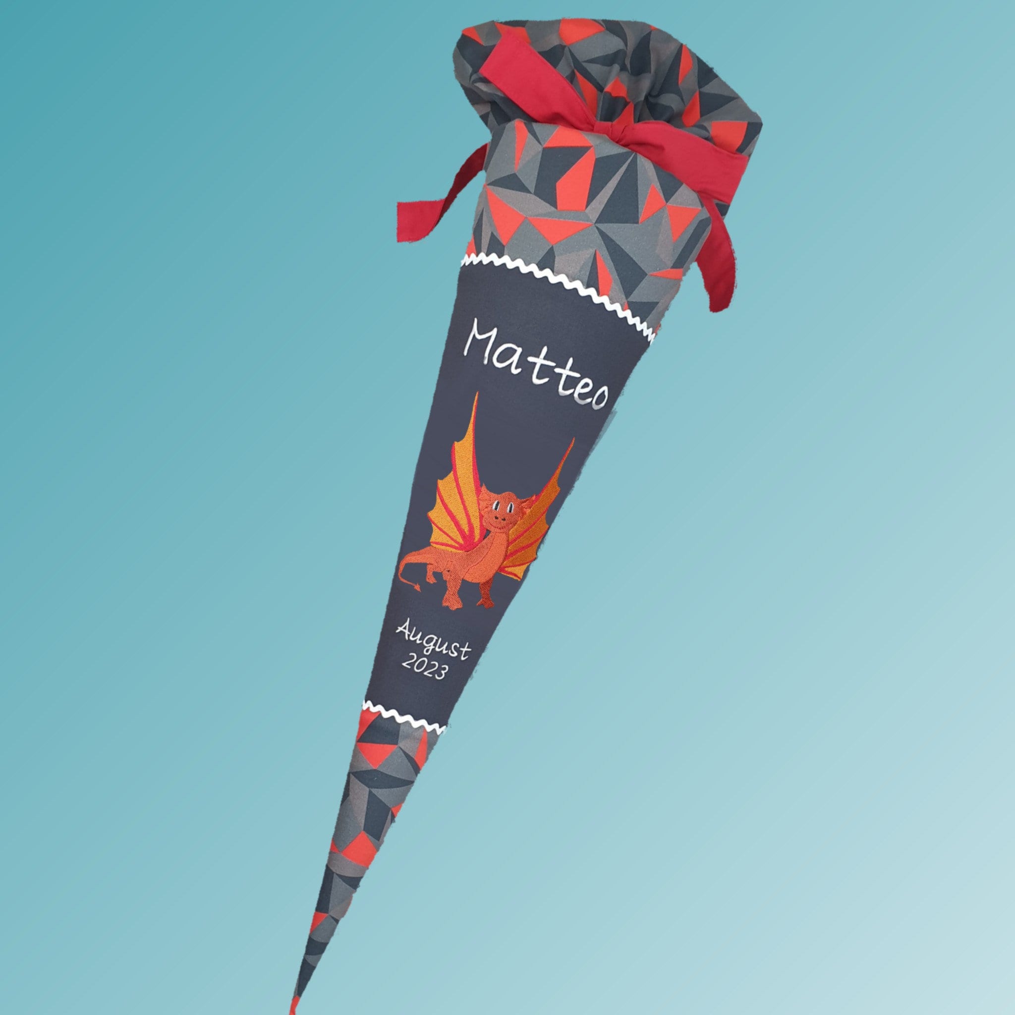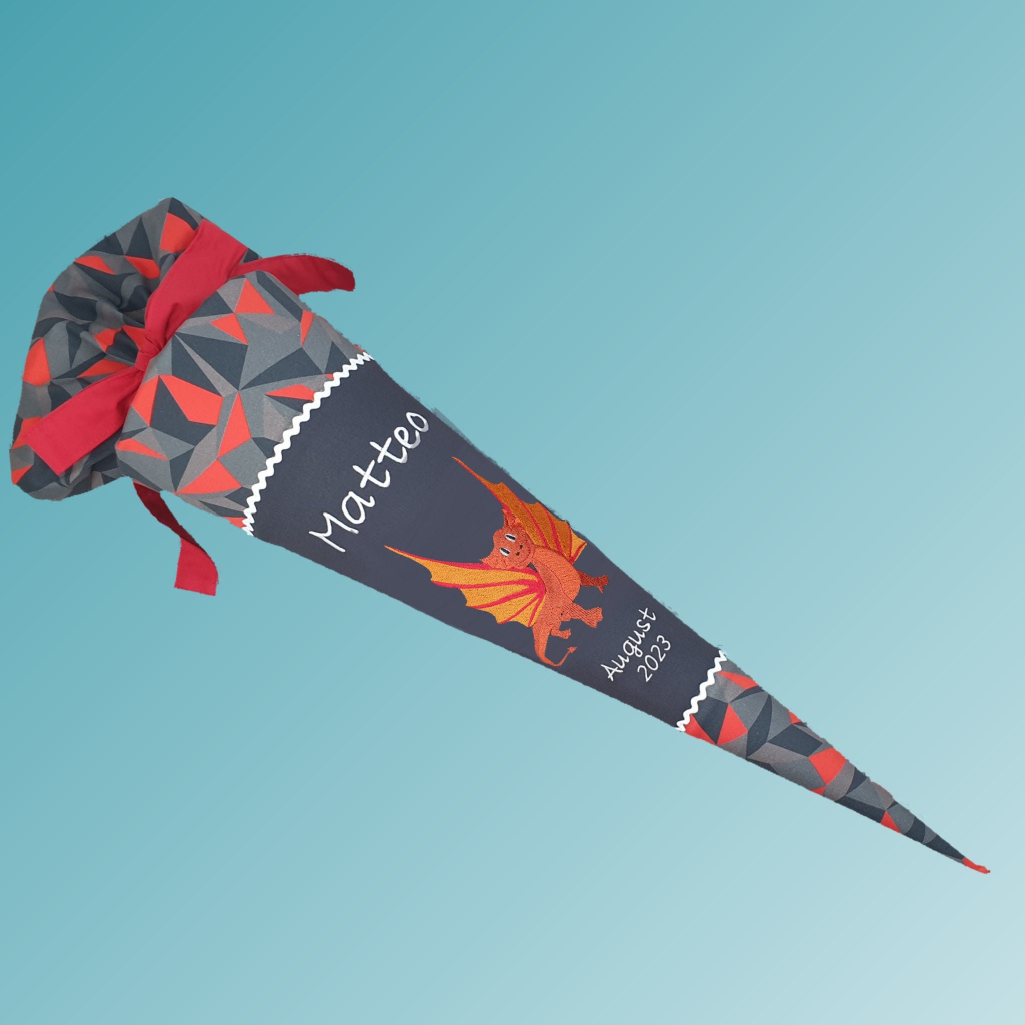 Schultüte mit Drachen und Namen farblich auf den Ergobag TaekBärdo Schulranzen abgestimmt.