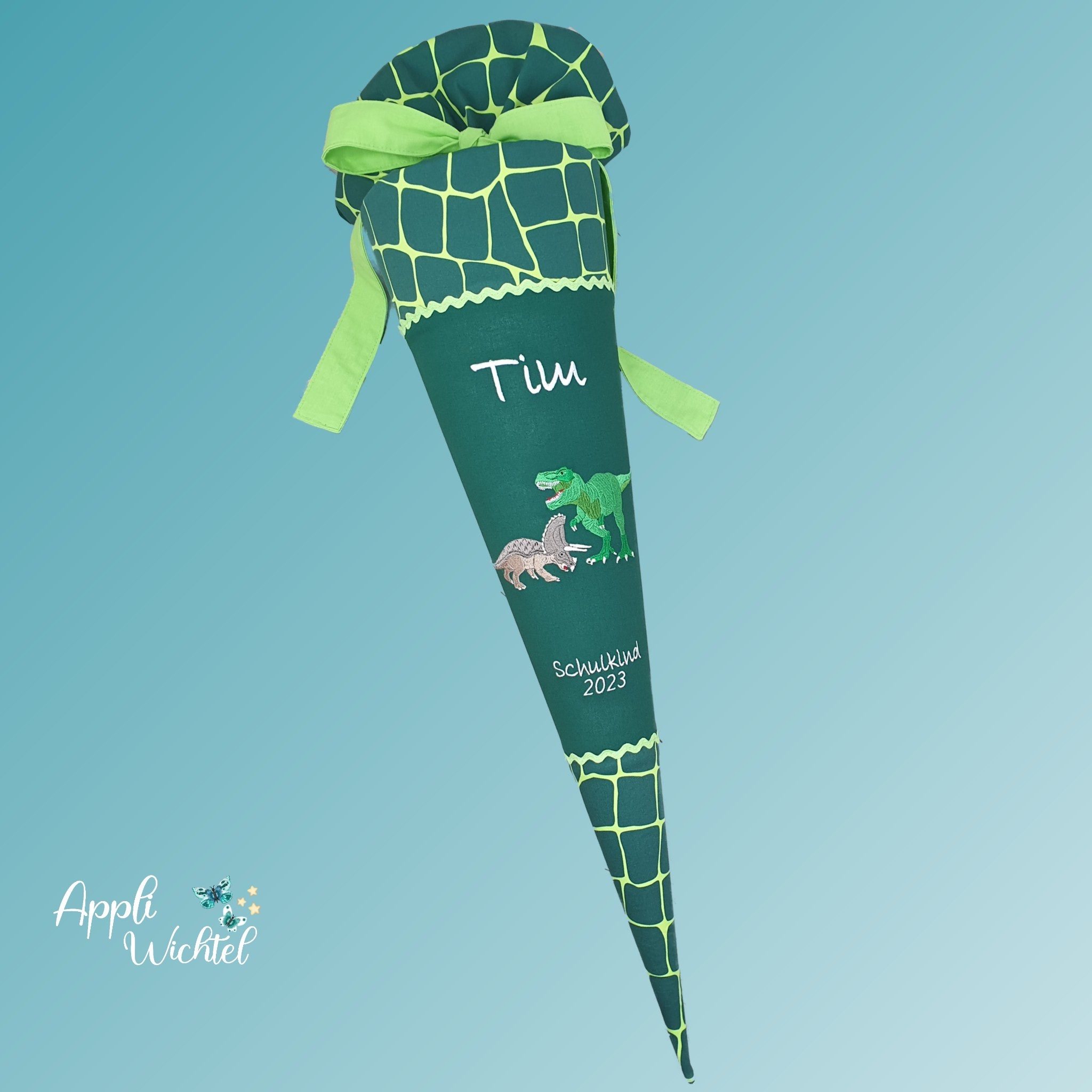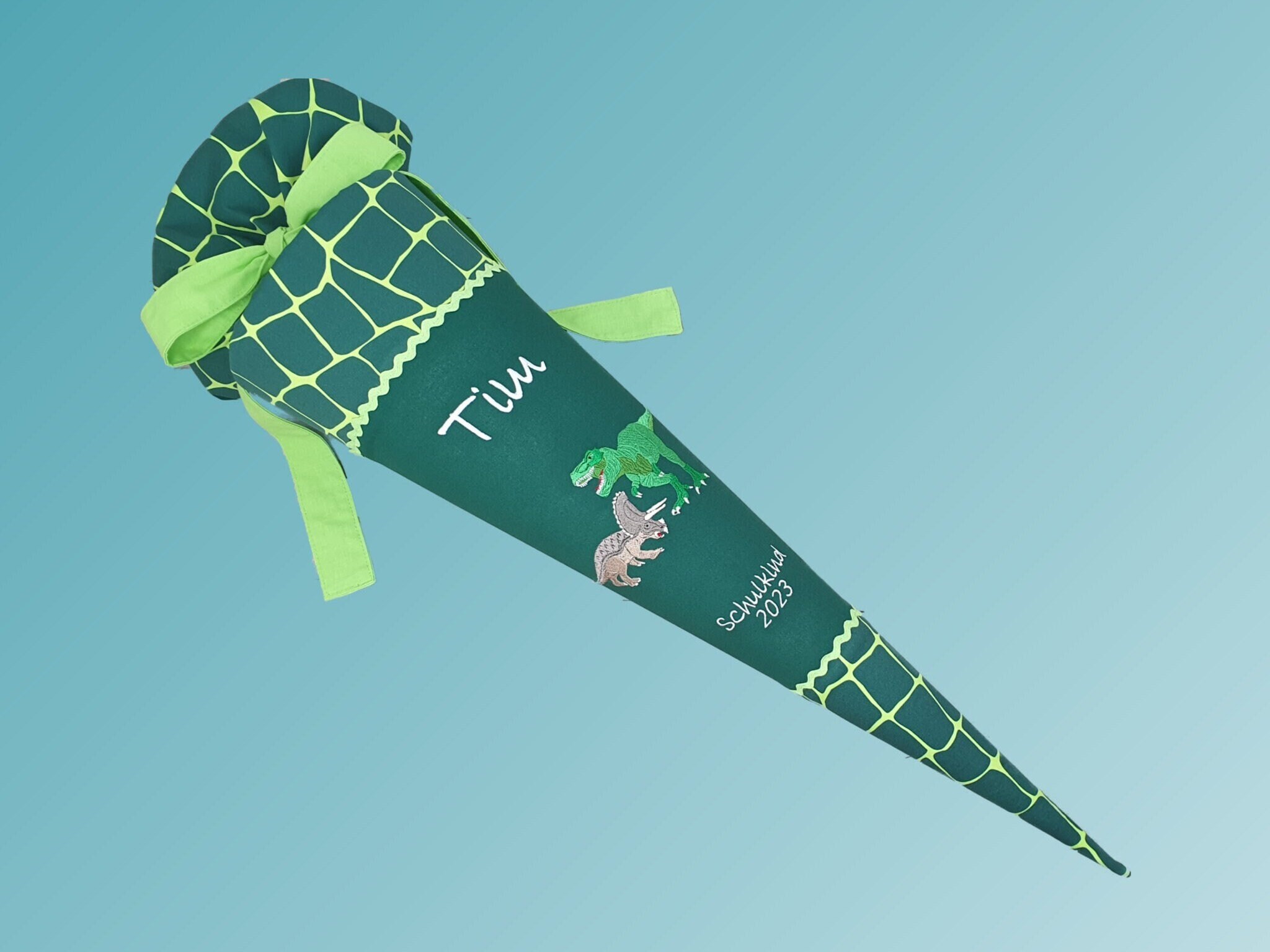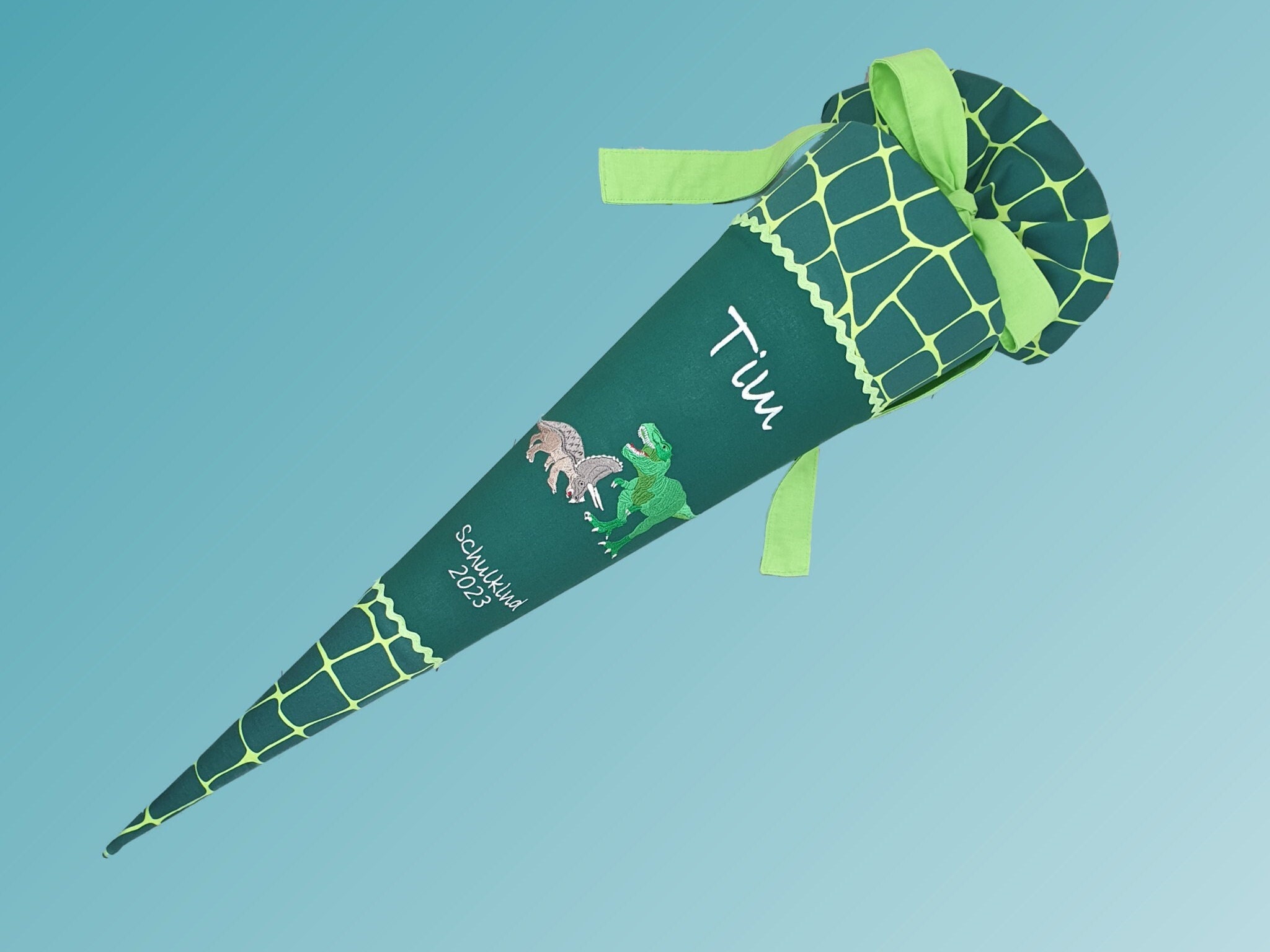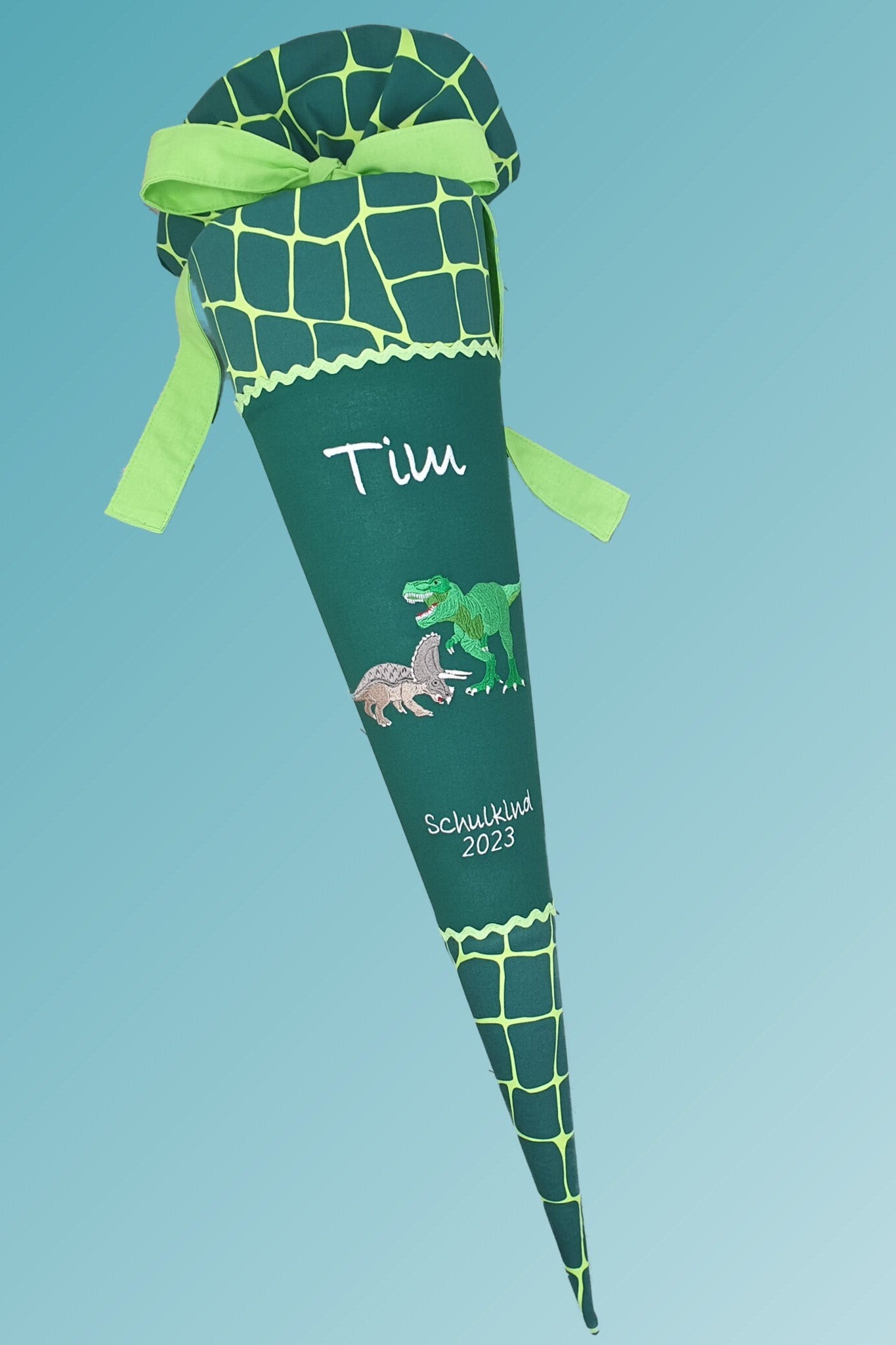 Schultüte mit Dinos und Namen farblich auf den Bärex Schulranzen abgestimmt.