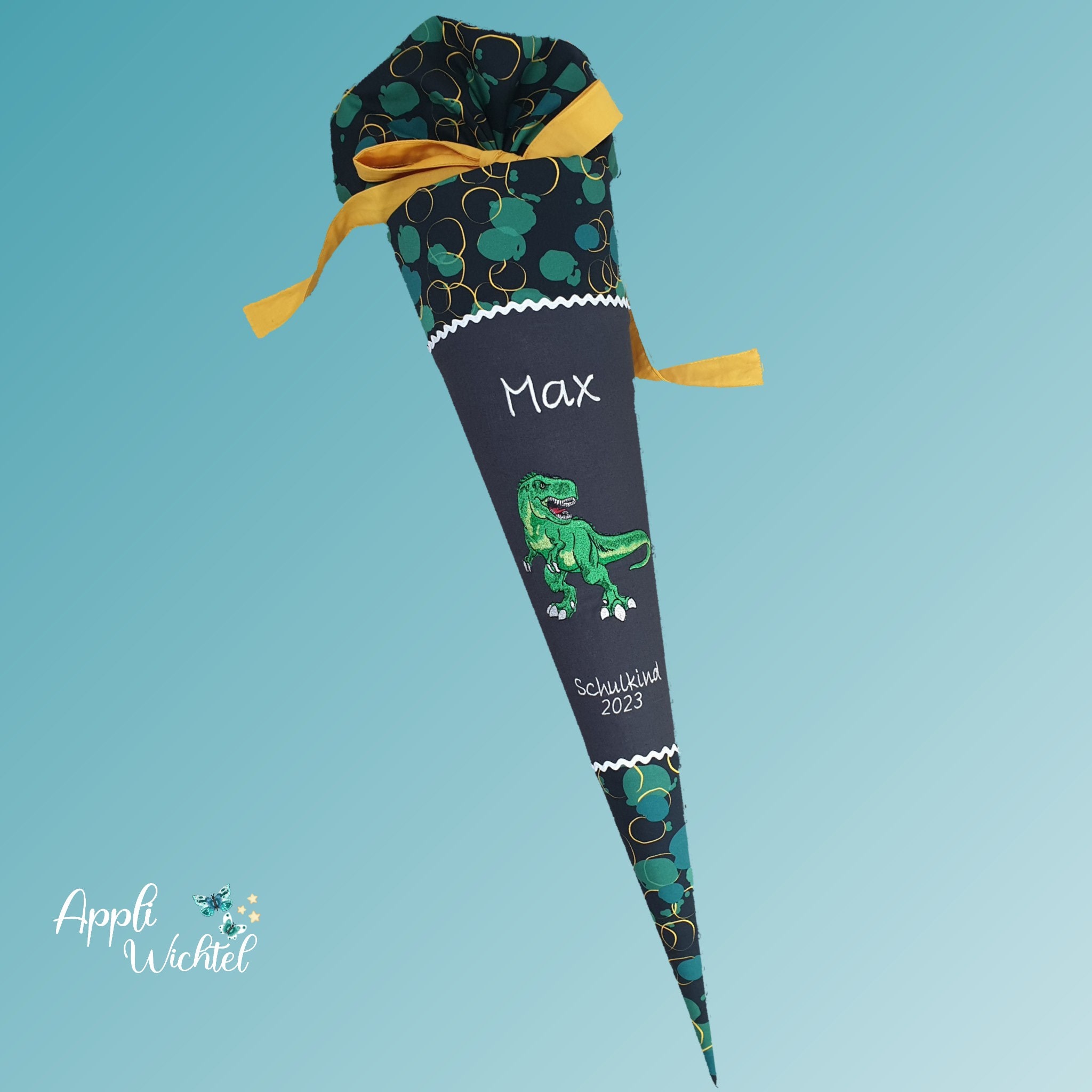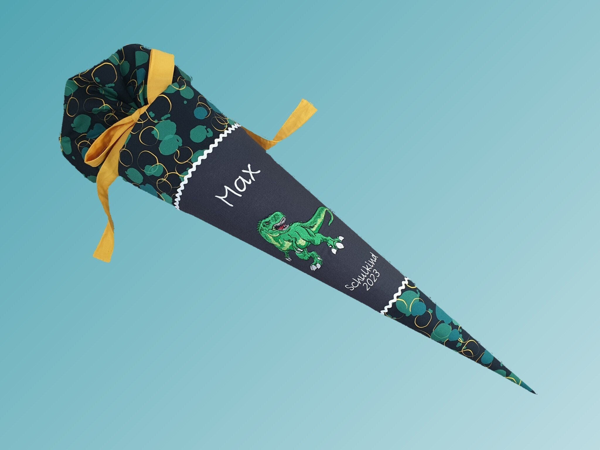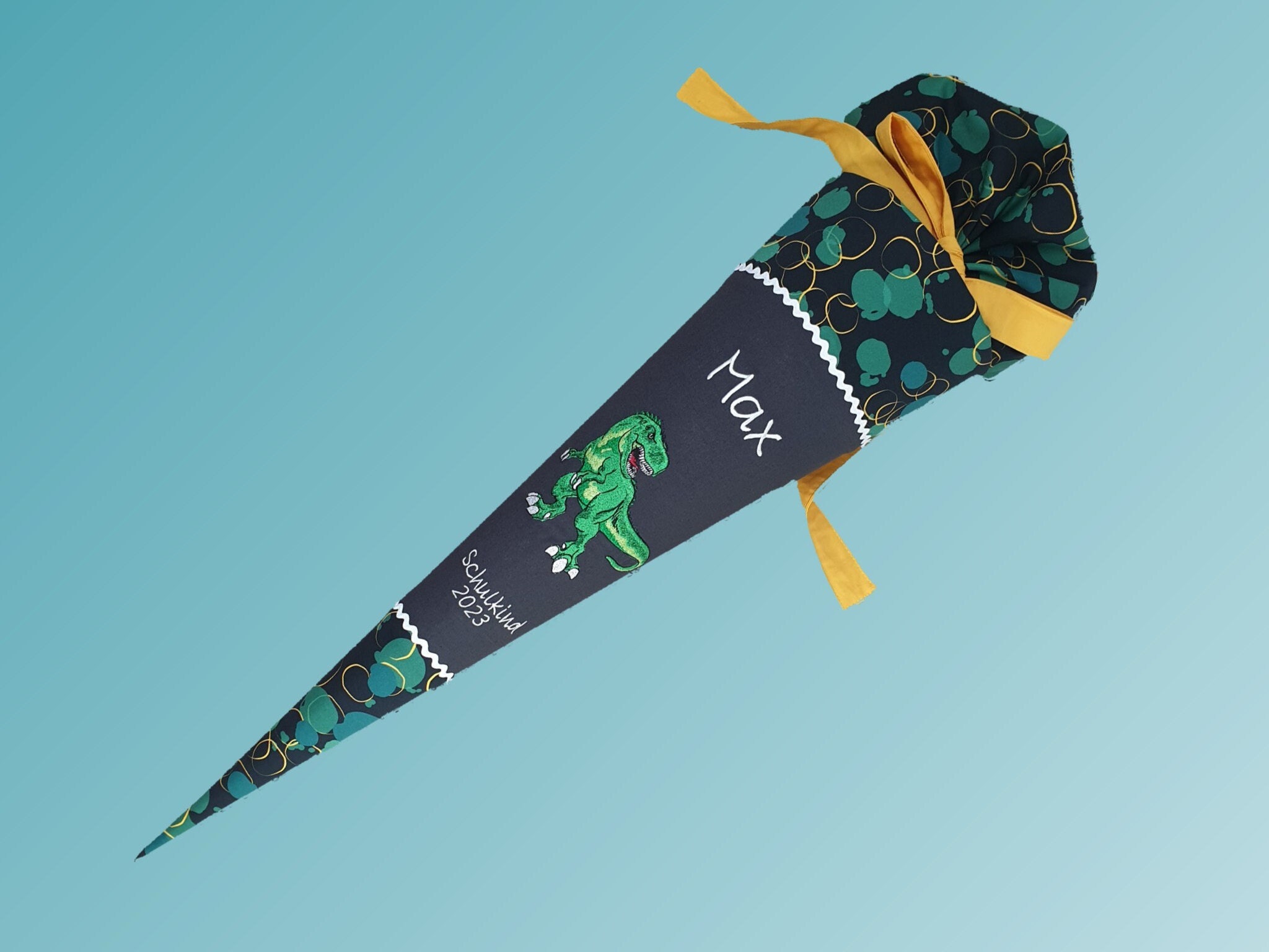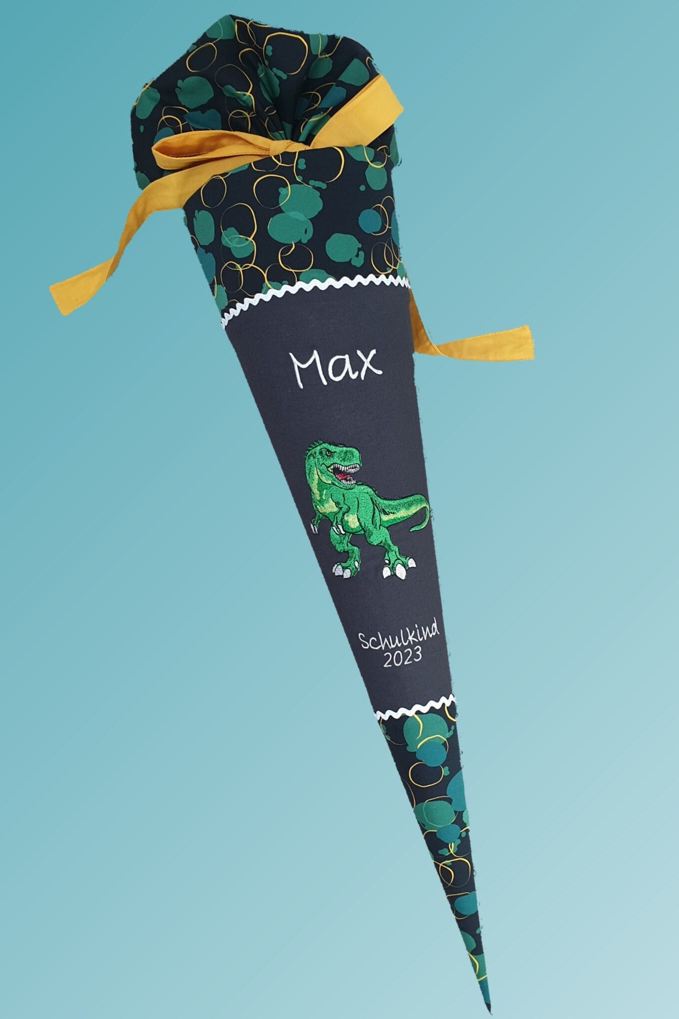 Schultüte mit Dino und Namen farblich auf den Ergobag Tribäratops Schulranzen abgestimmt.