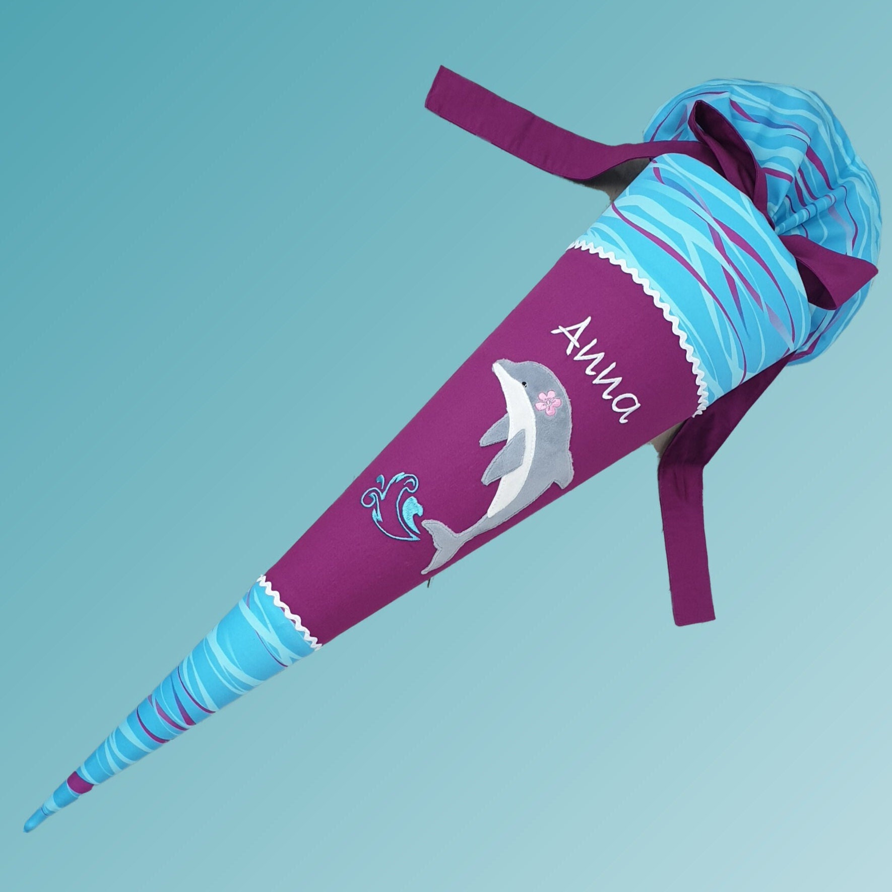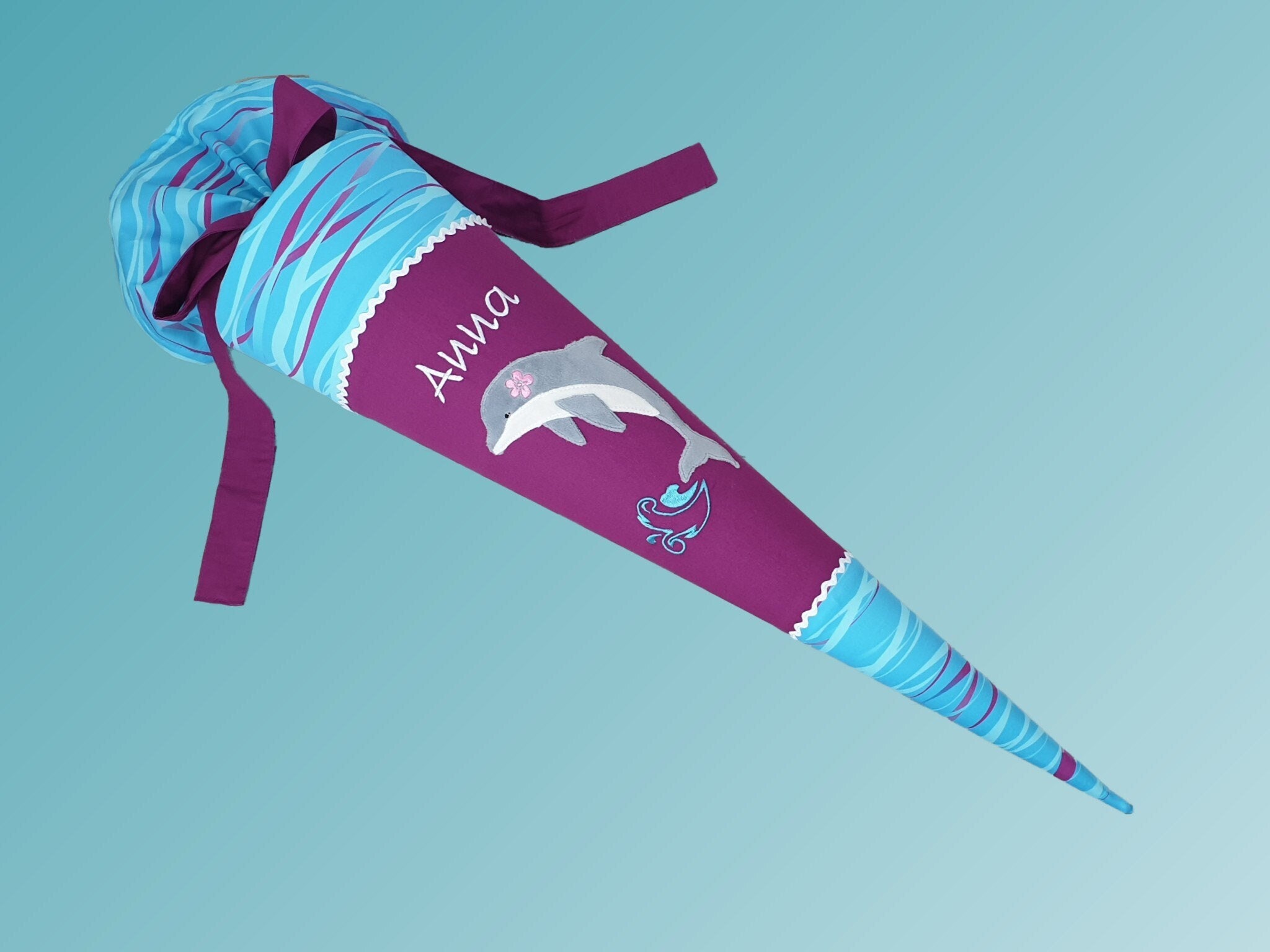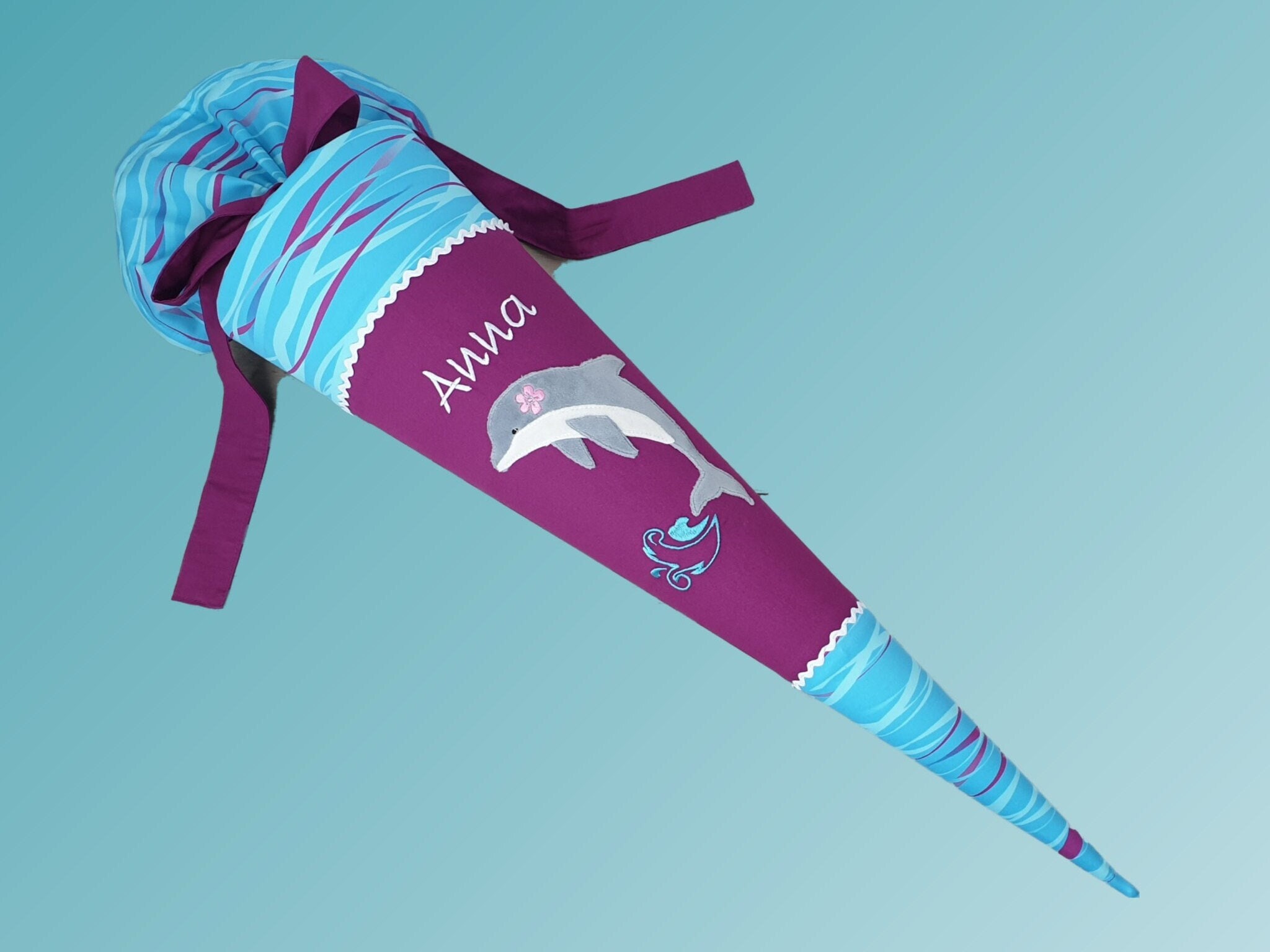 Schultüte mit Delfin und Namen farblich auf den McNeill Finny Schulranzen abgestimmt.