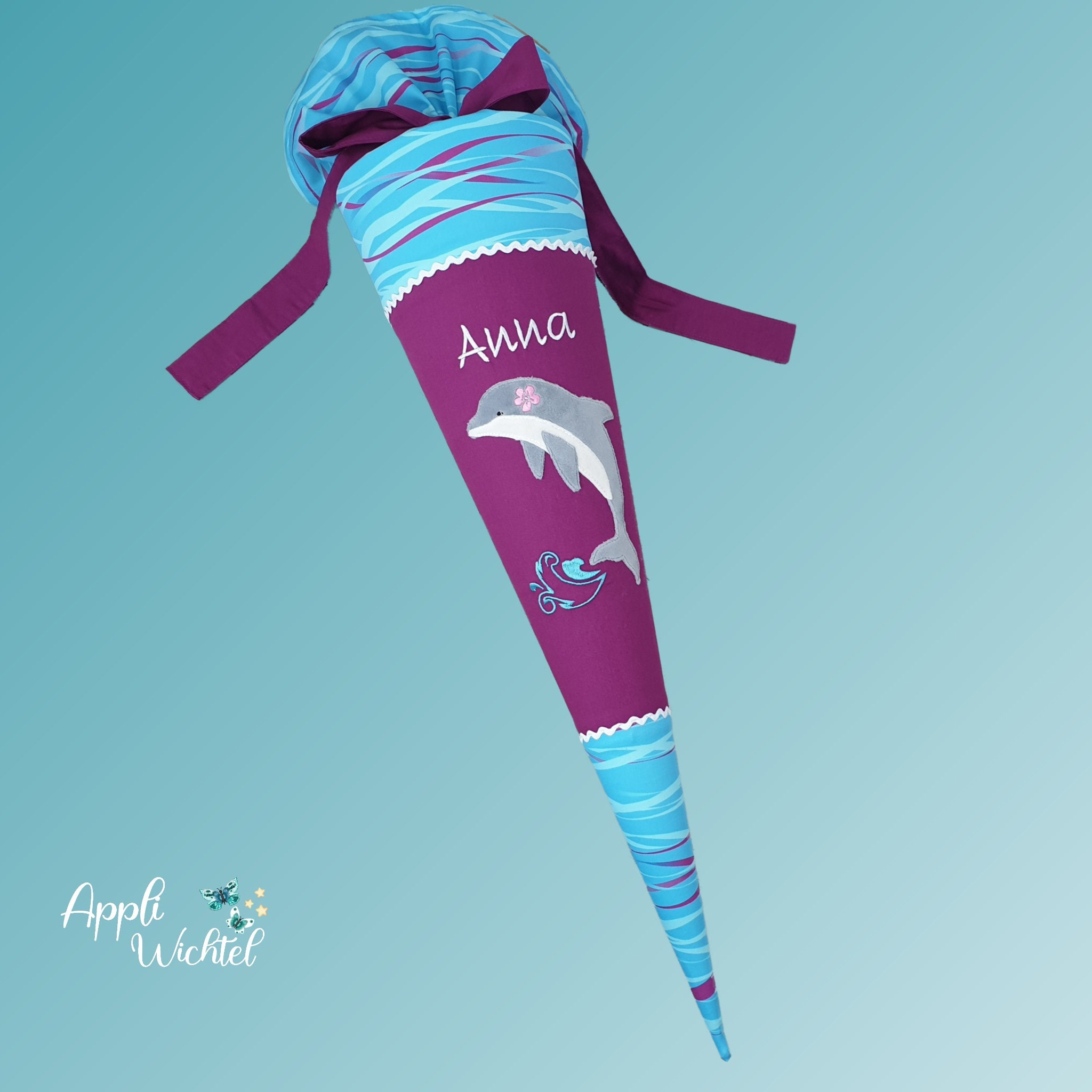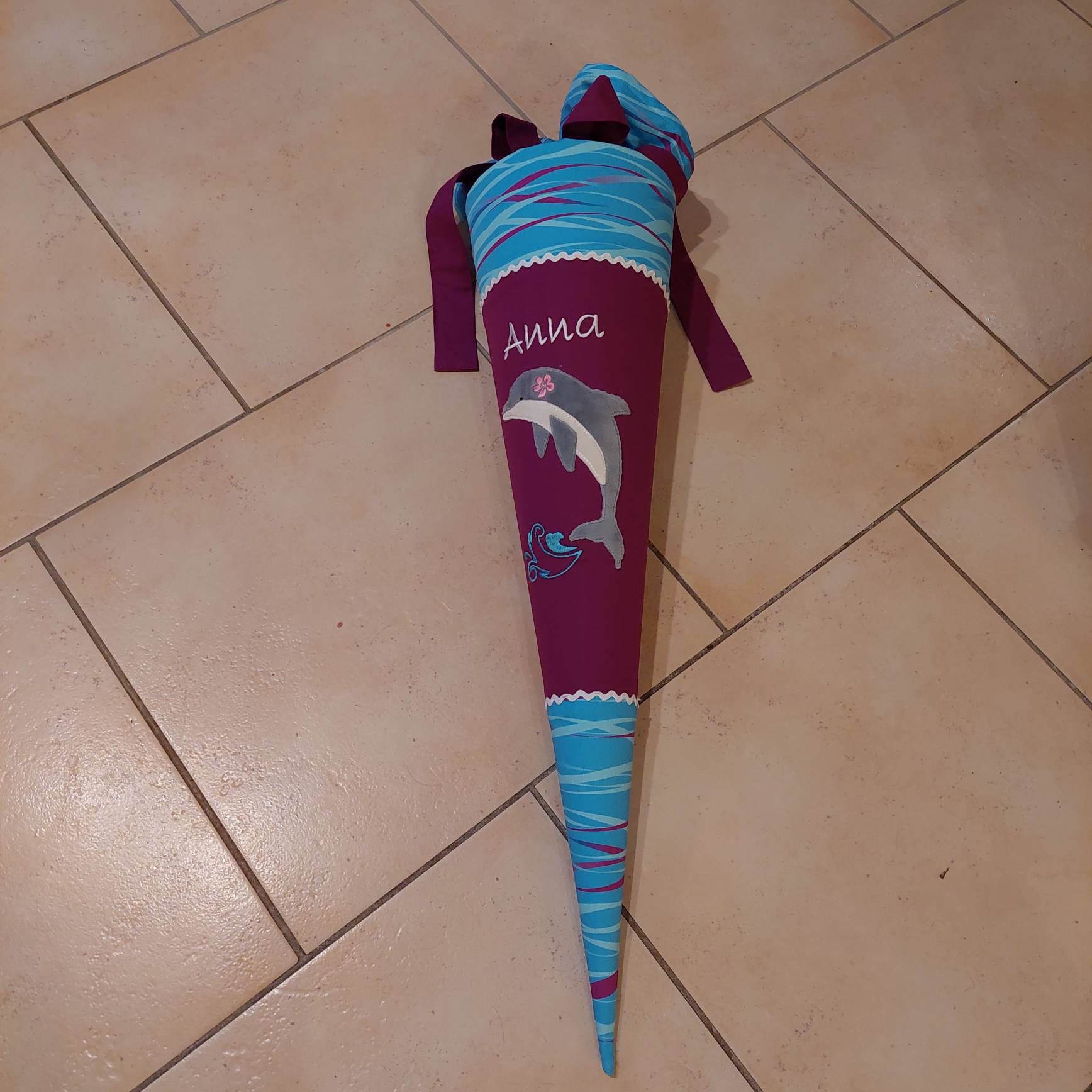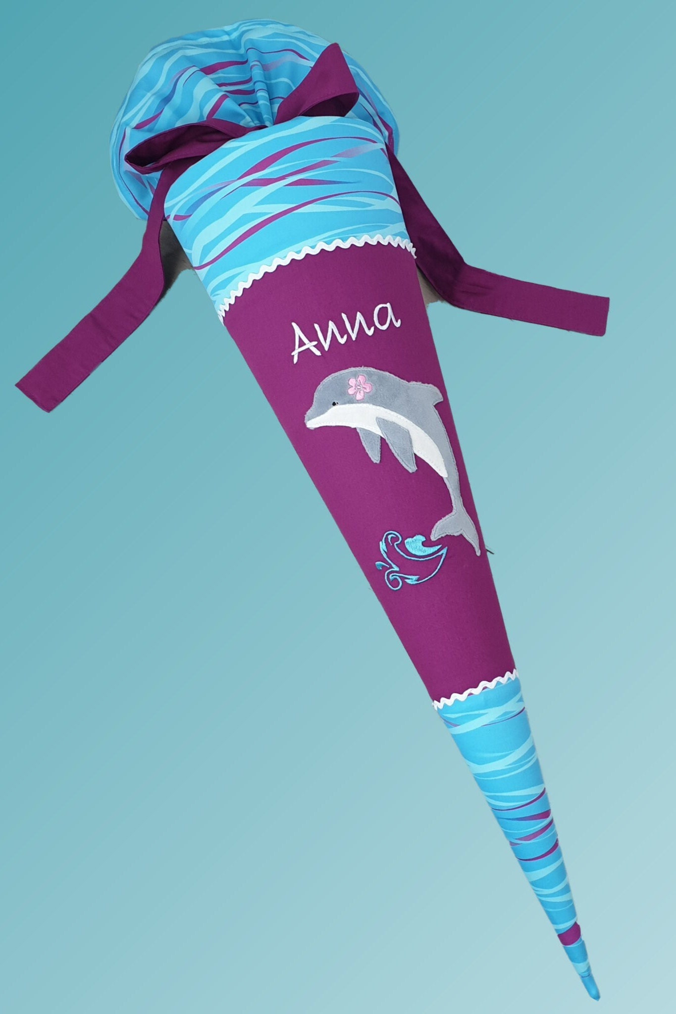 Schultüte mit Delfin und Namen farblich auf den McNeill Finny Schulranzen abgestimmt.