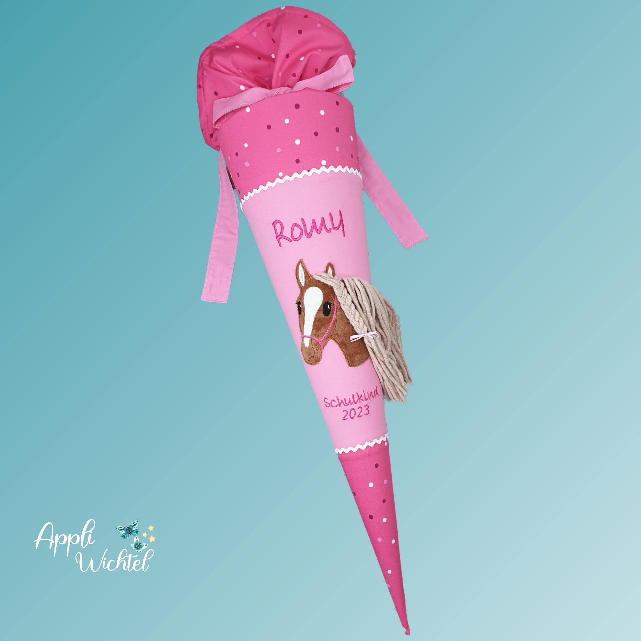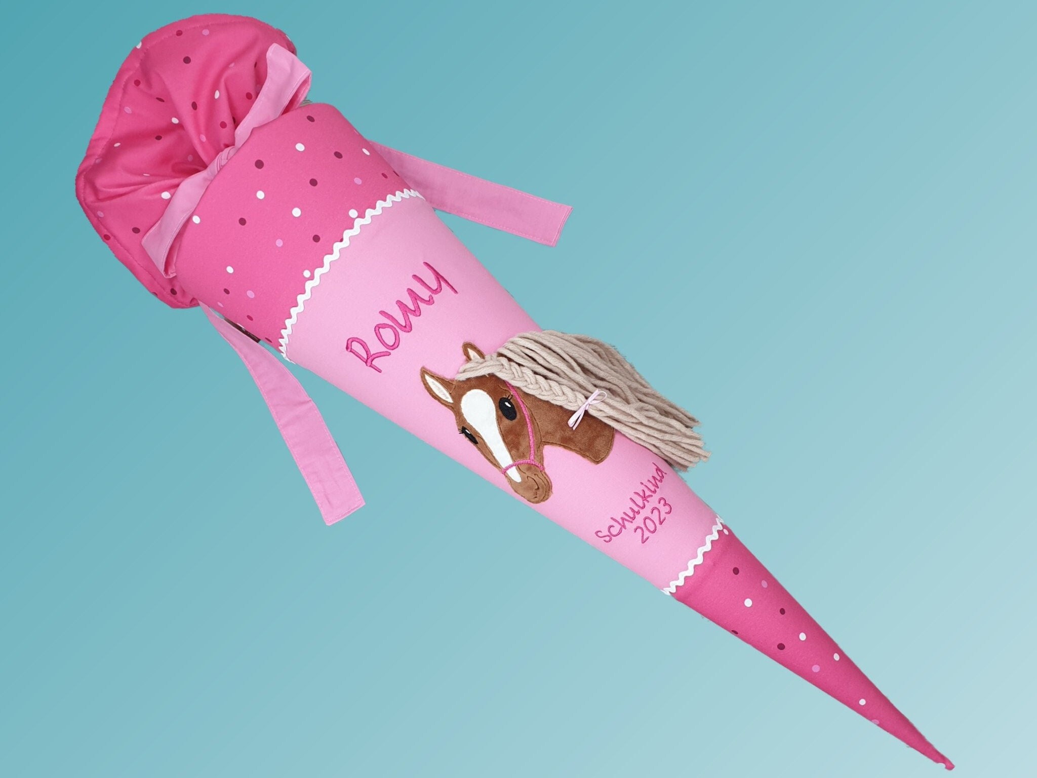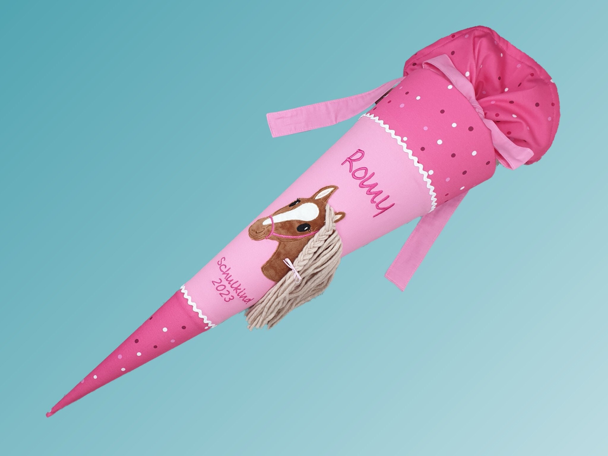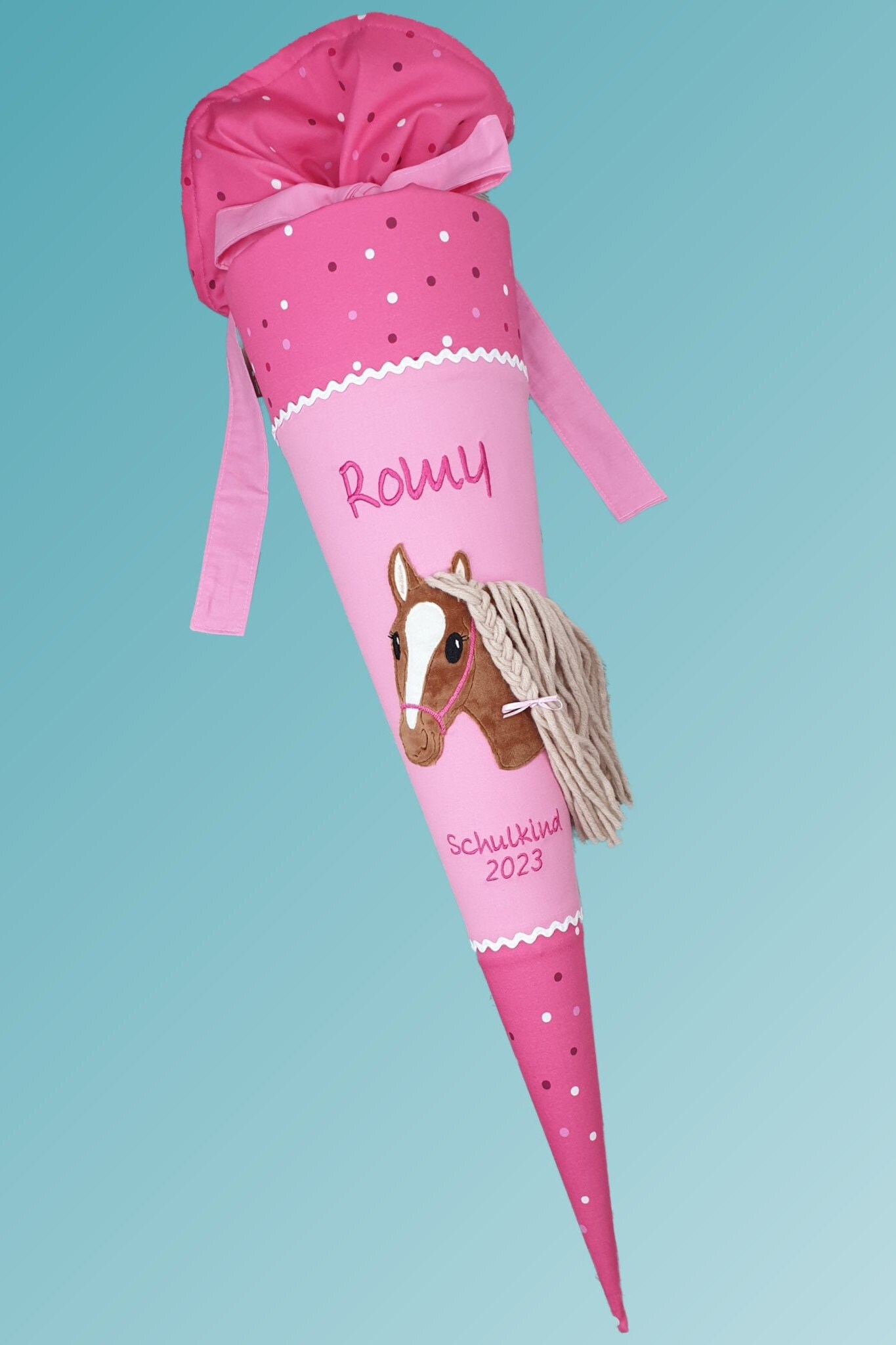 Schultüte mit Pferd und Namen farblich auf den Ergobag Reitbärhof Schulranzen abgestimmt.