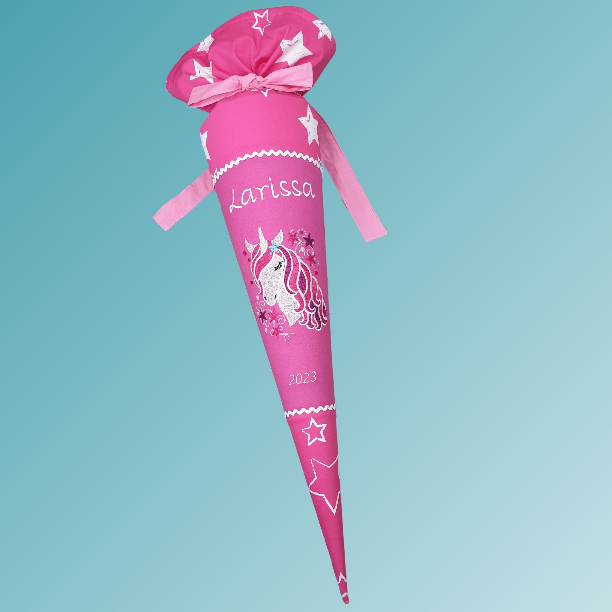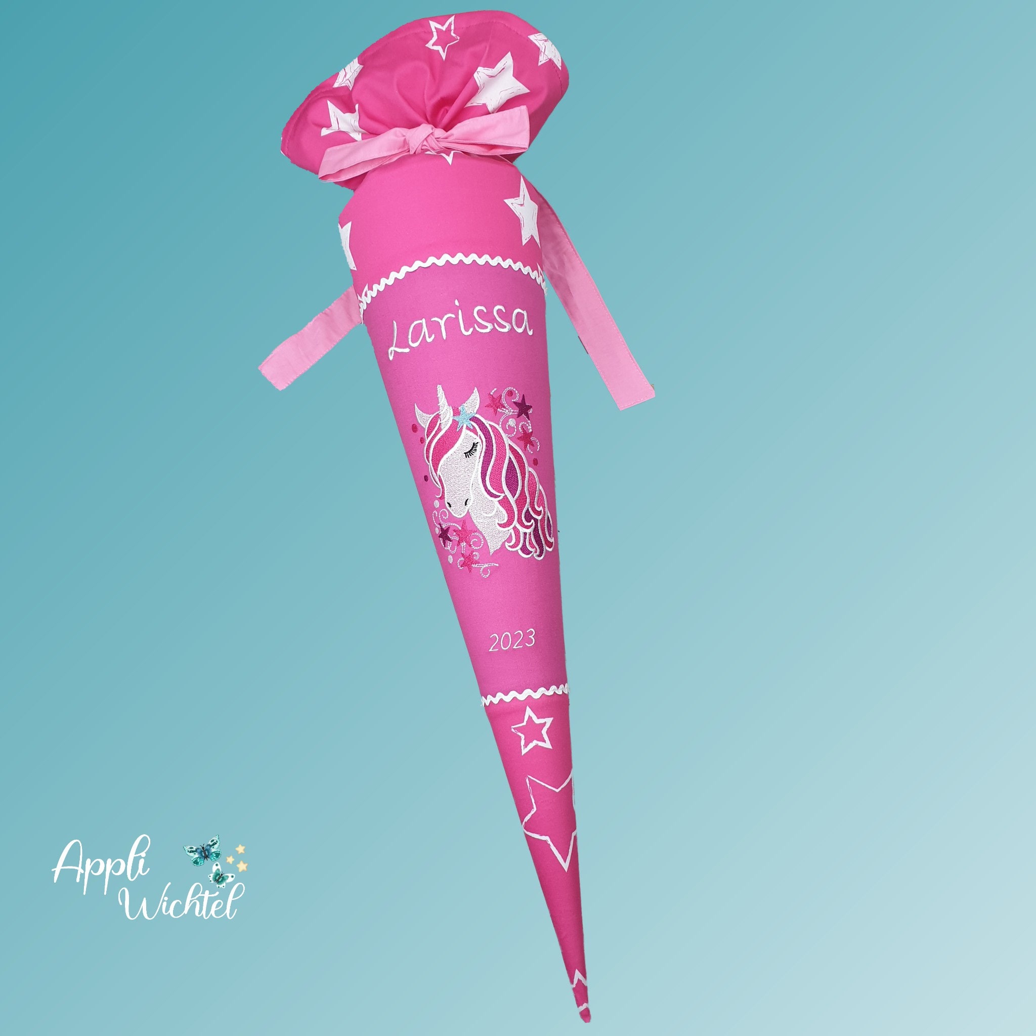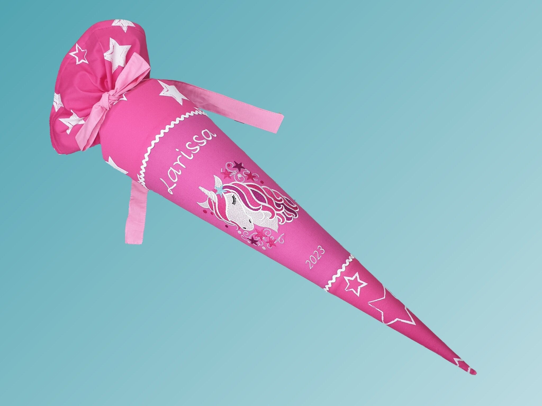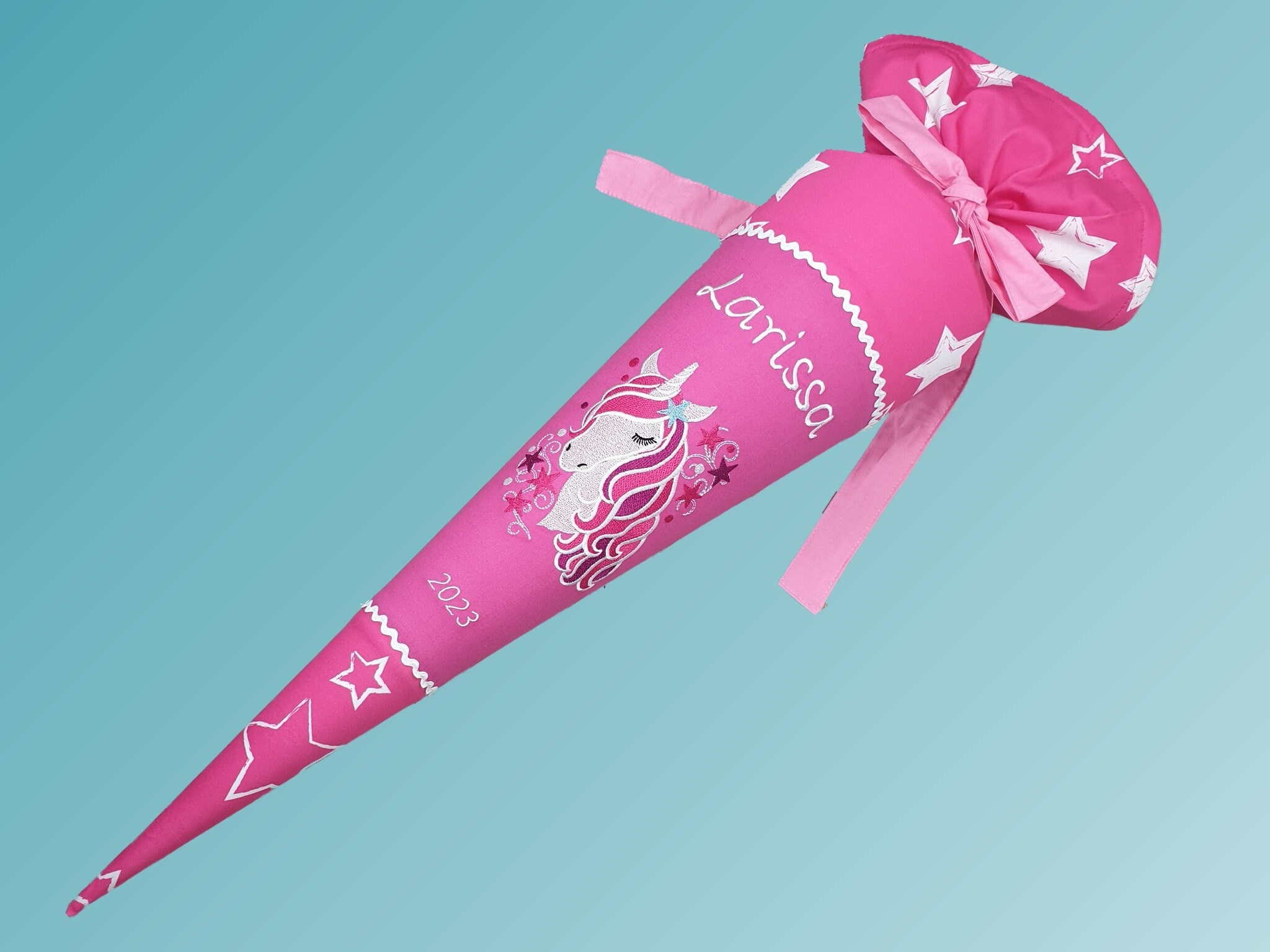 Jede Schultüte wird mit einem gestickten Motiv und dem Namen deines Kindes individuell gestaltet. Auf Wunsch fügen wir auch das Datum des ersten Schultages hinzu.