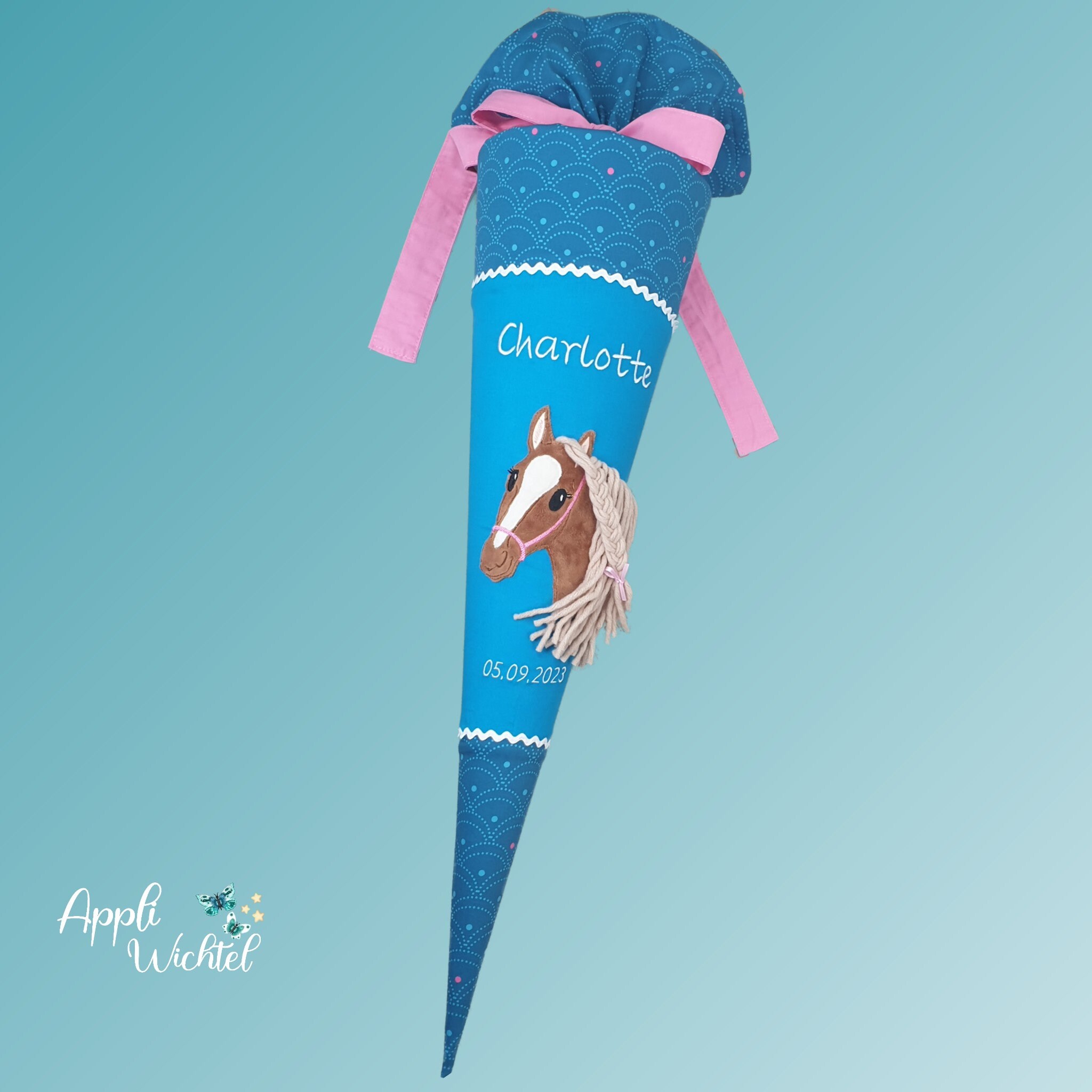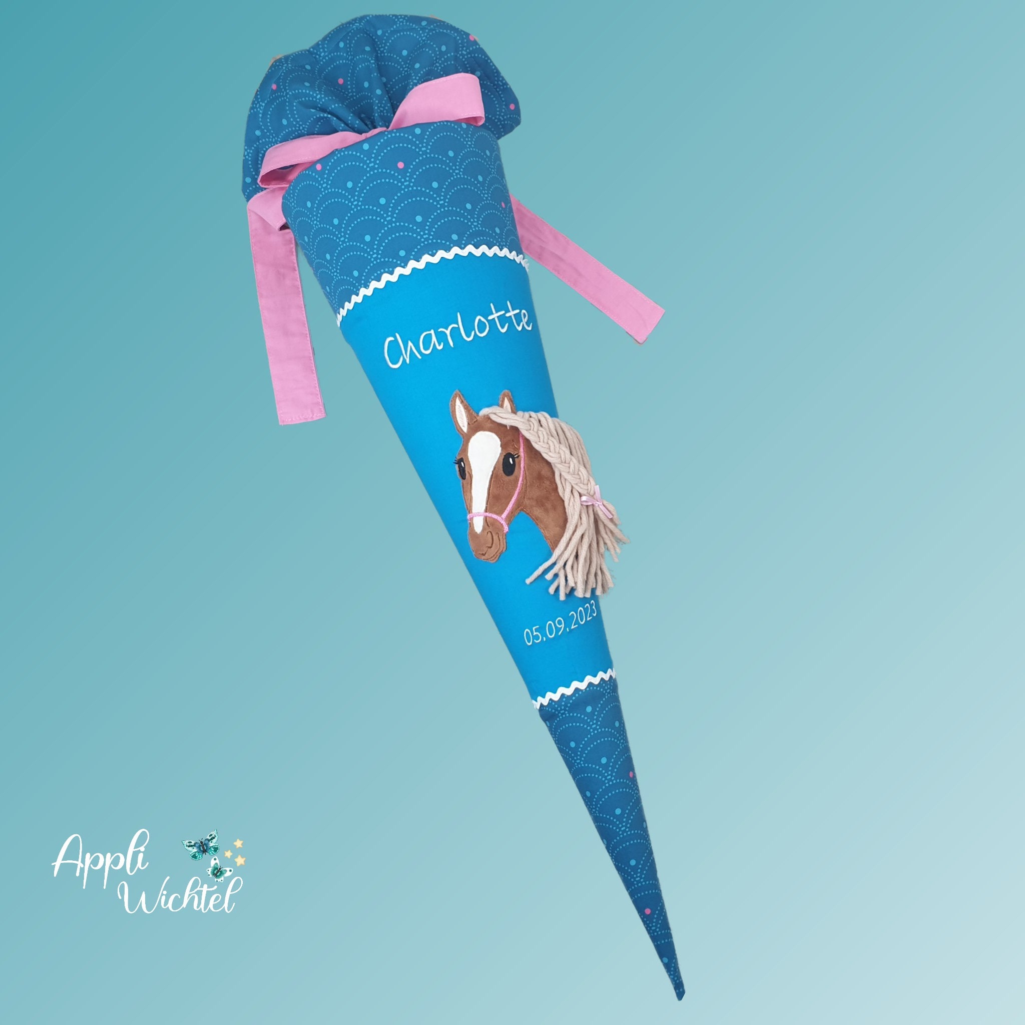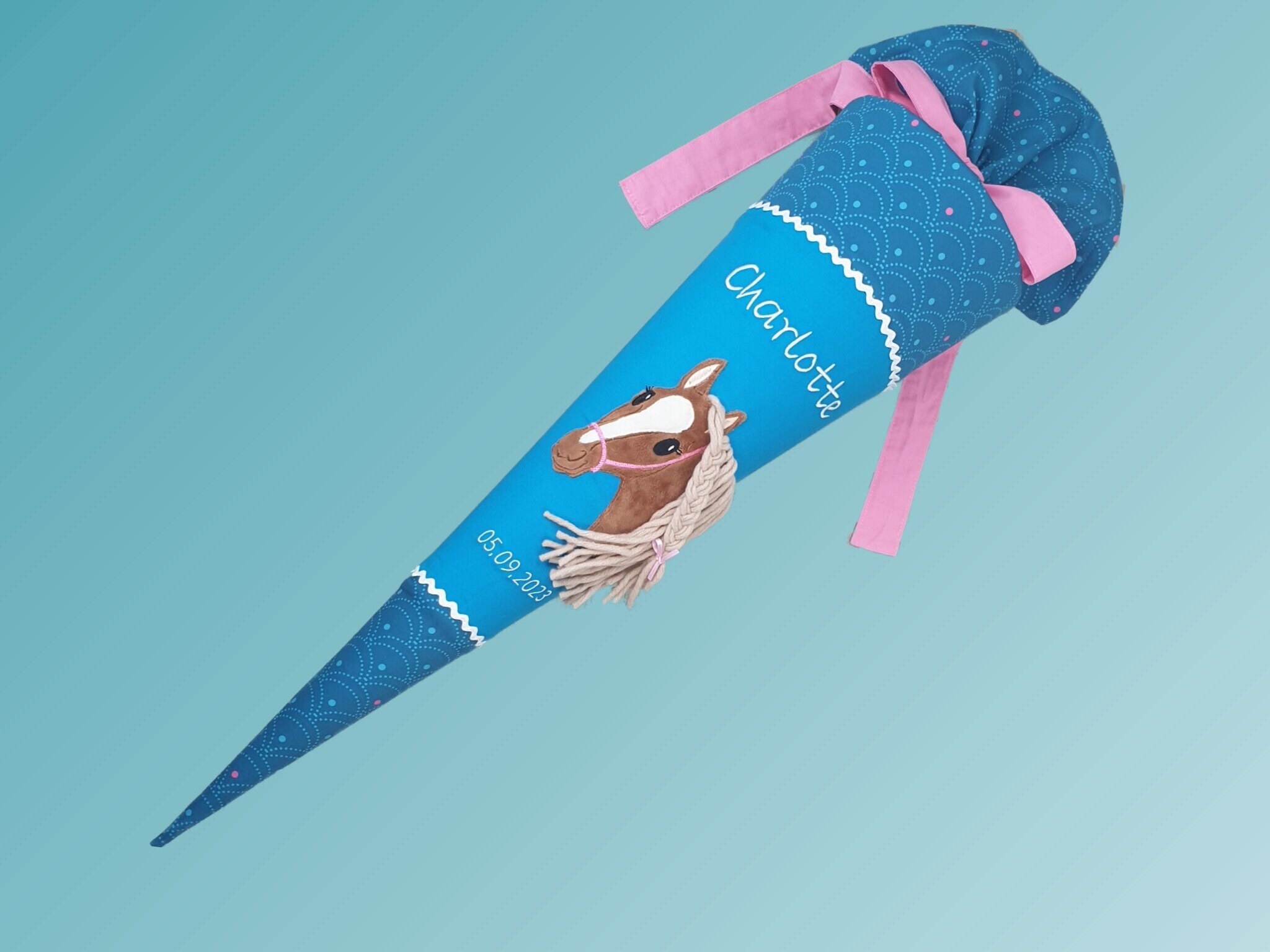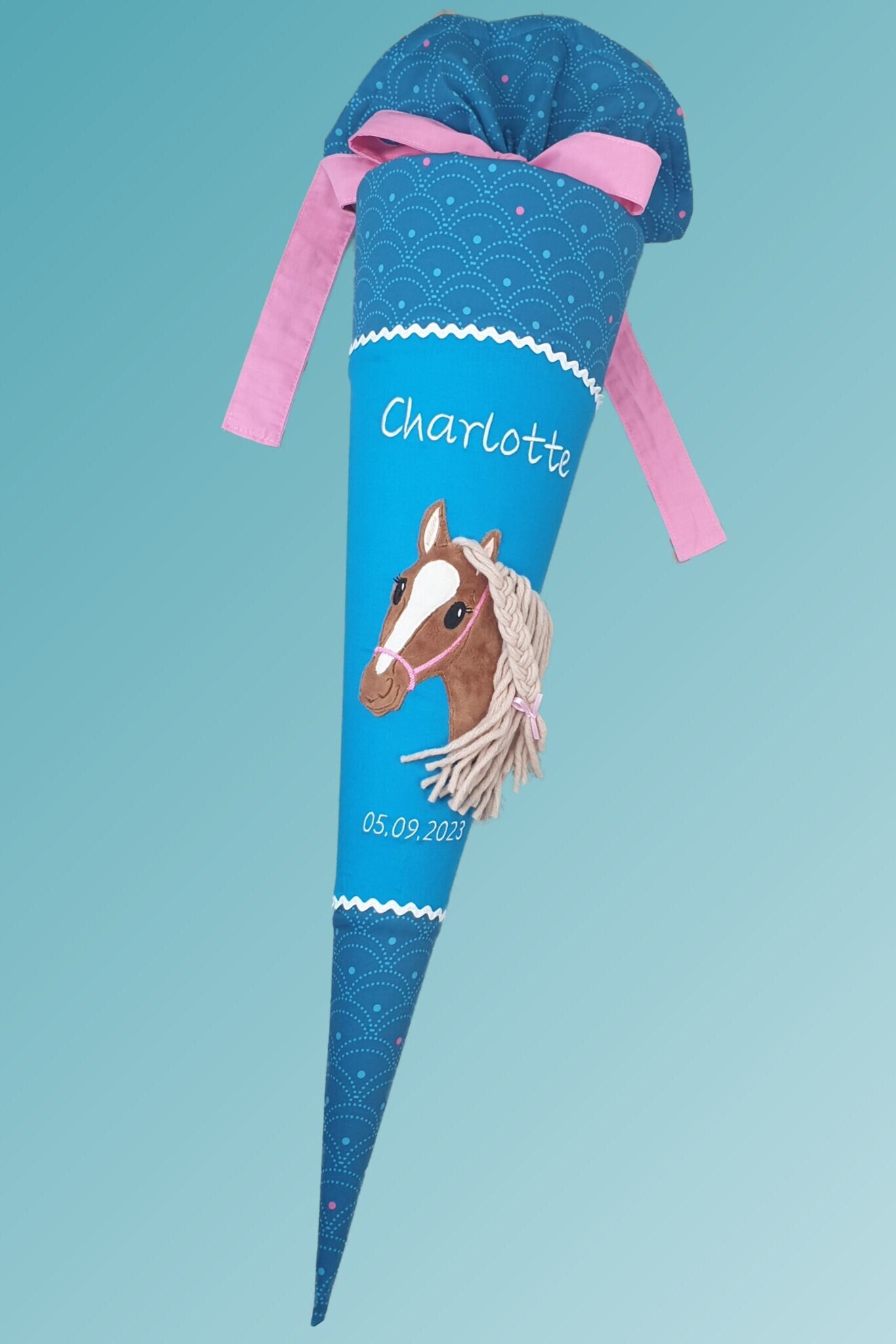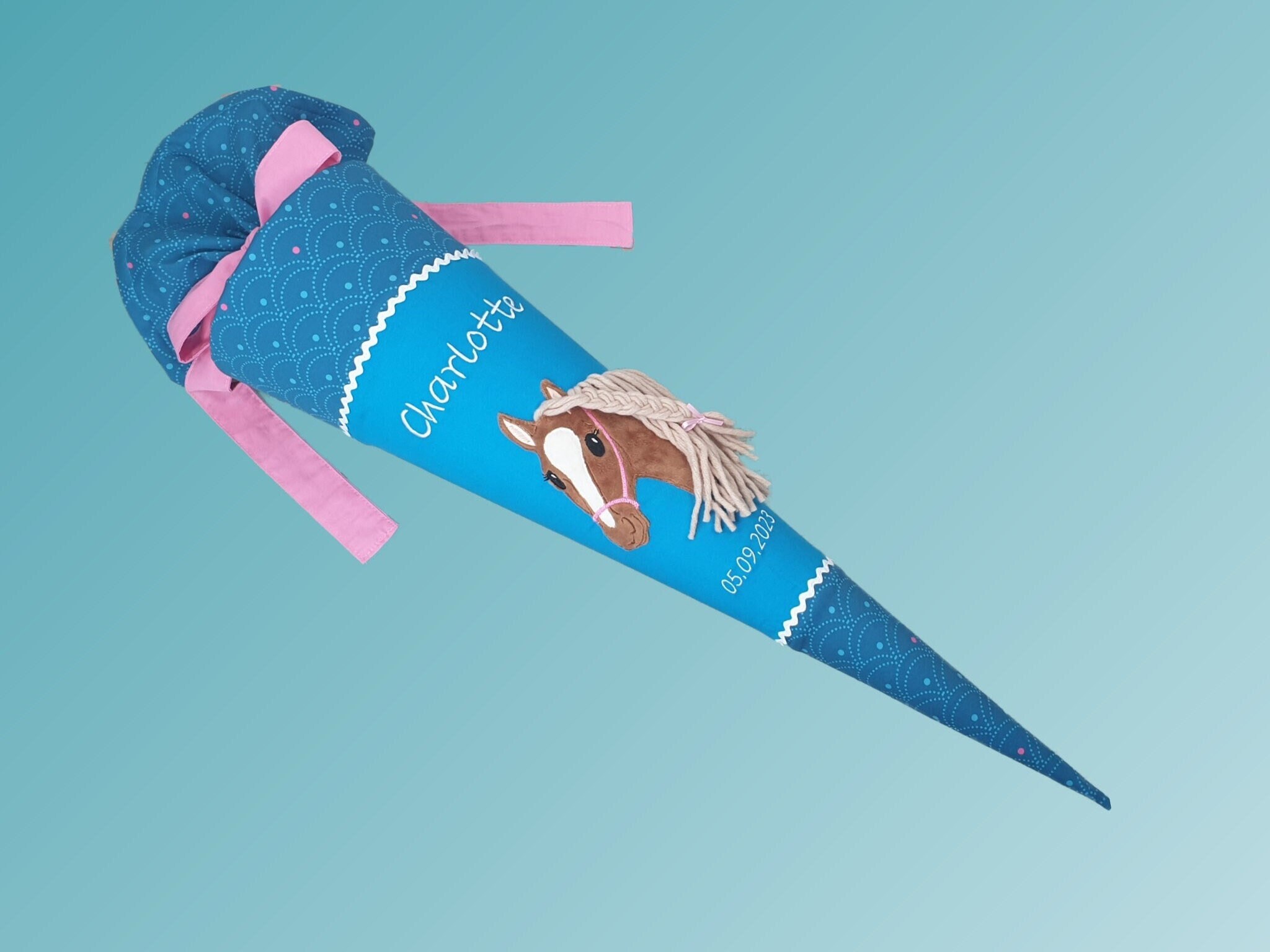 Schultüte mit Pferd und Namen farblich auf den Step by step Dolphin Pippa Schulranzen abgestimmt.