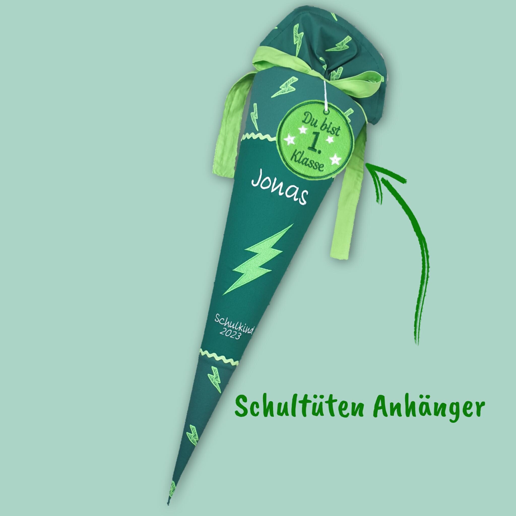 Jede Schultüte wird mit einem gestickten Motiv und dem Namen deines Kindes individuell gestaltet. Auf Wunsch fügen wir auch das Datum des ersten Schultages hinzu.