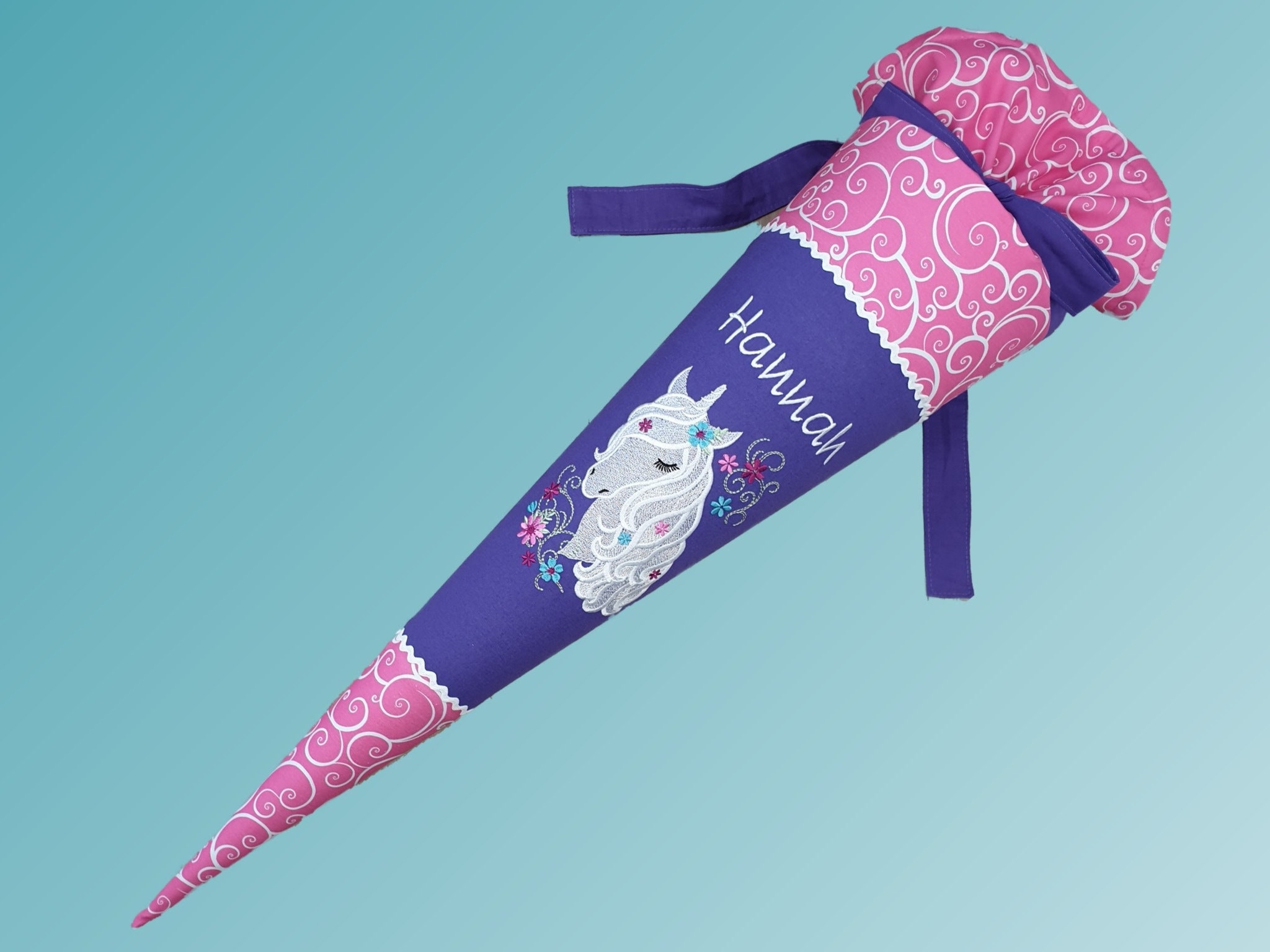 Jede Schultüte wird mit einem gestickten Motiv und dem Namen deines Kindes individuell gestaltet. Auf Wunsch fügen wir auch das Datum des ersten Schultages hinzu.