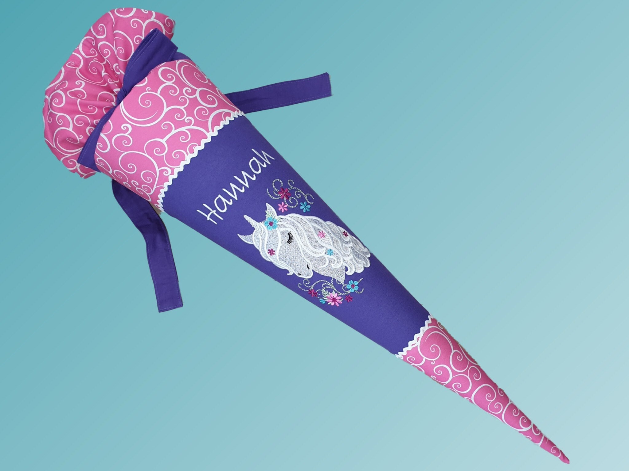 Schultüte mit Einhorn und Namen farblich auf den Colorful Unicorn Jola Schulranzen abgestimmt.