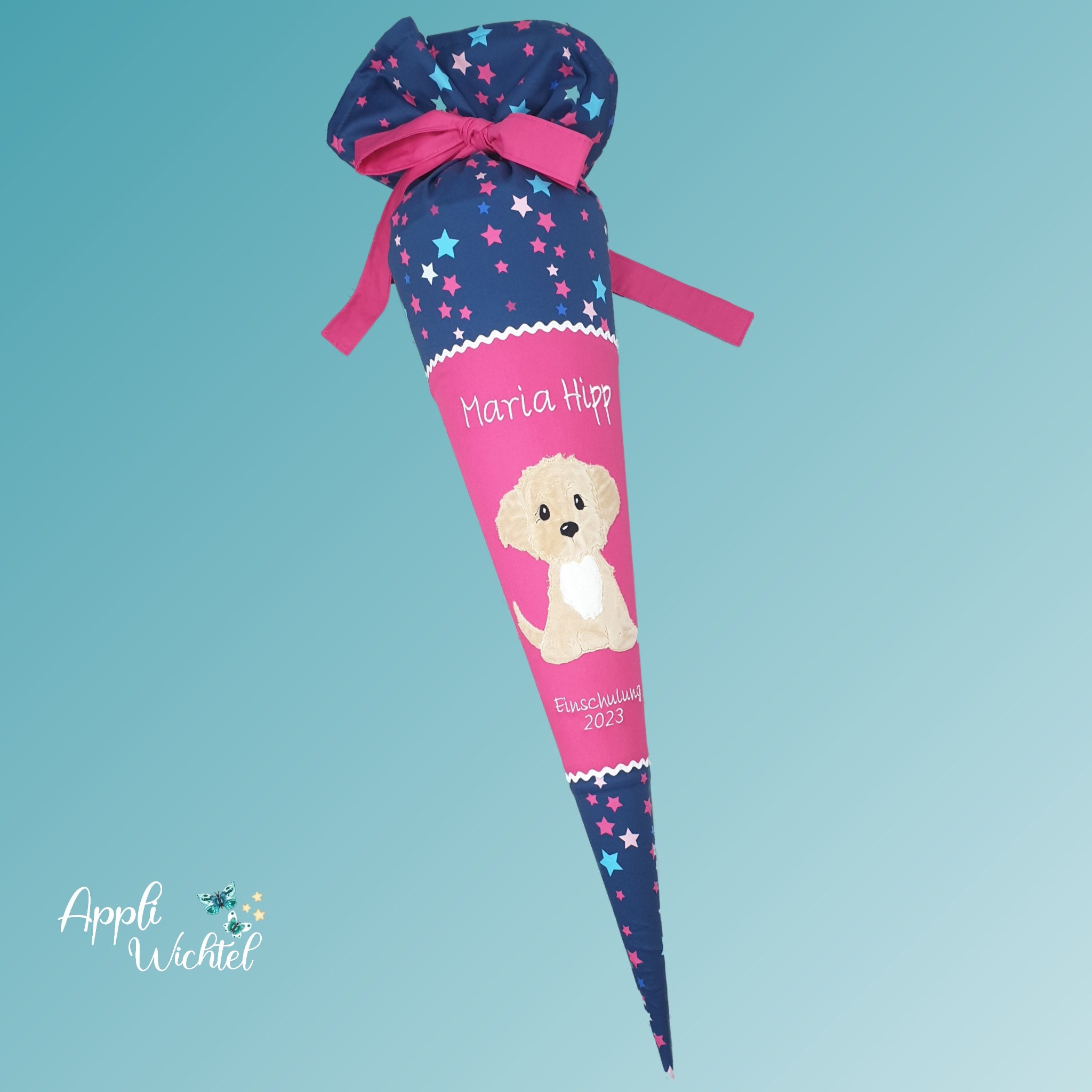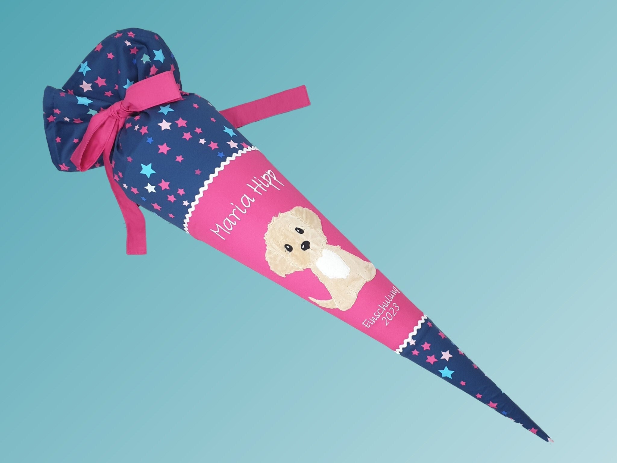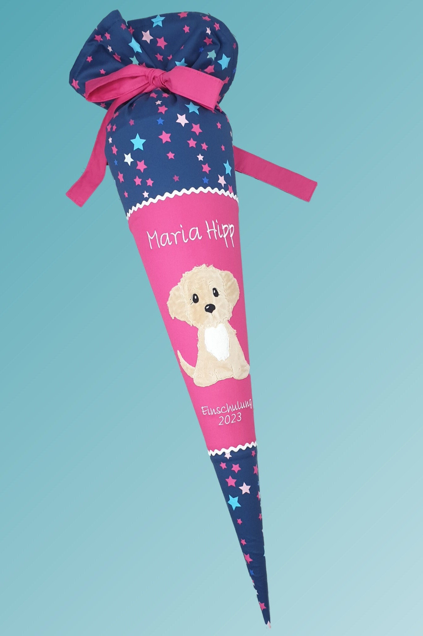 Schultüte mit Hund und Namen farblich auf den Leni Schulranzen abgestimmt.