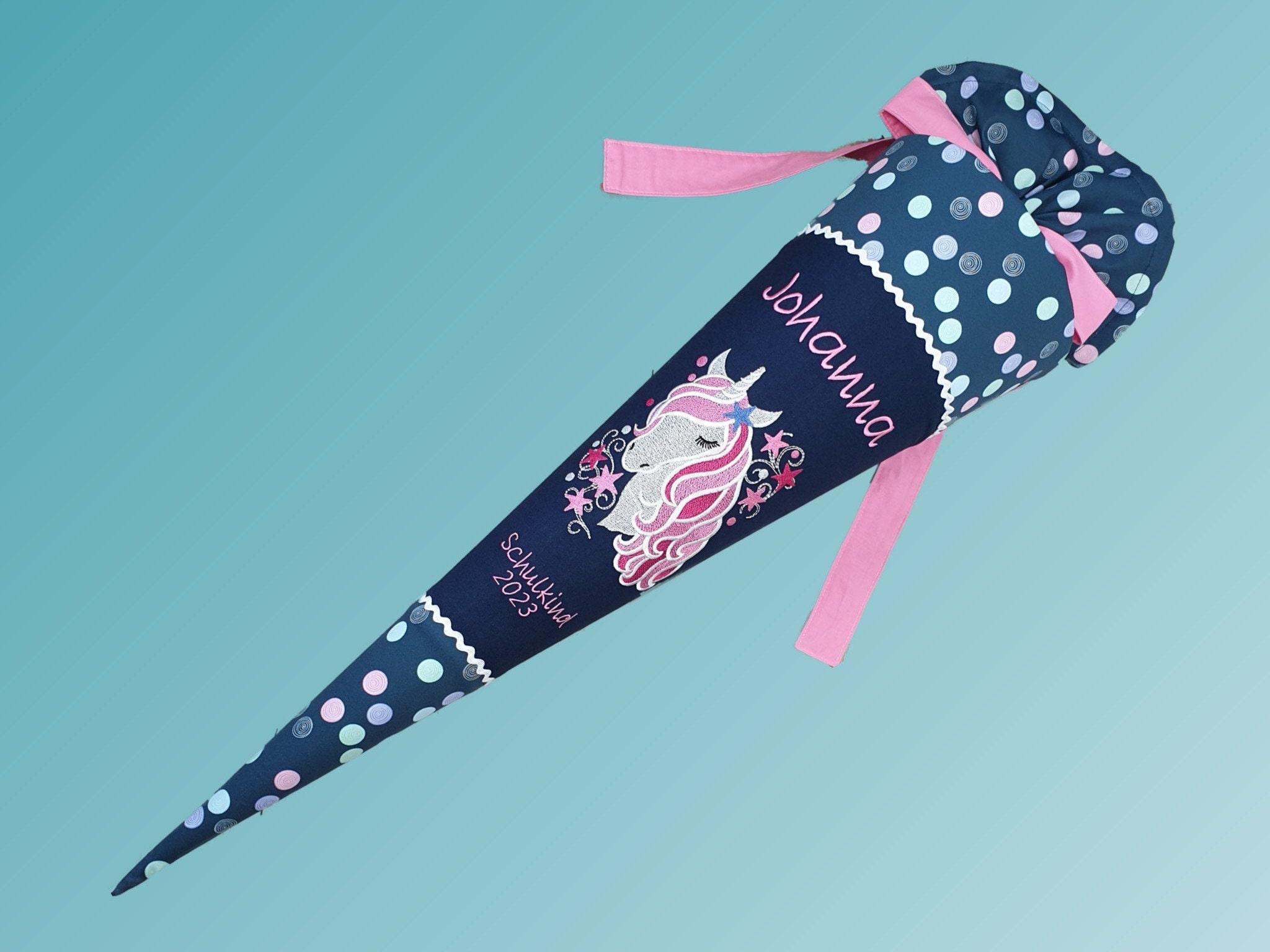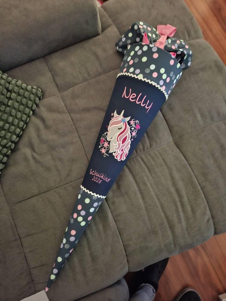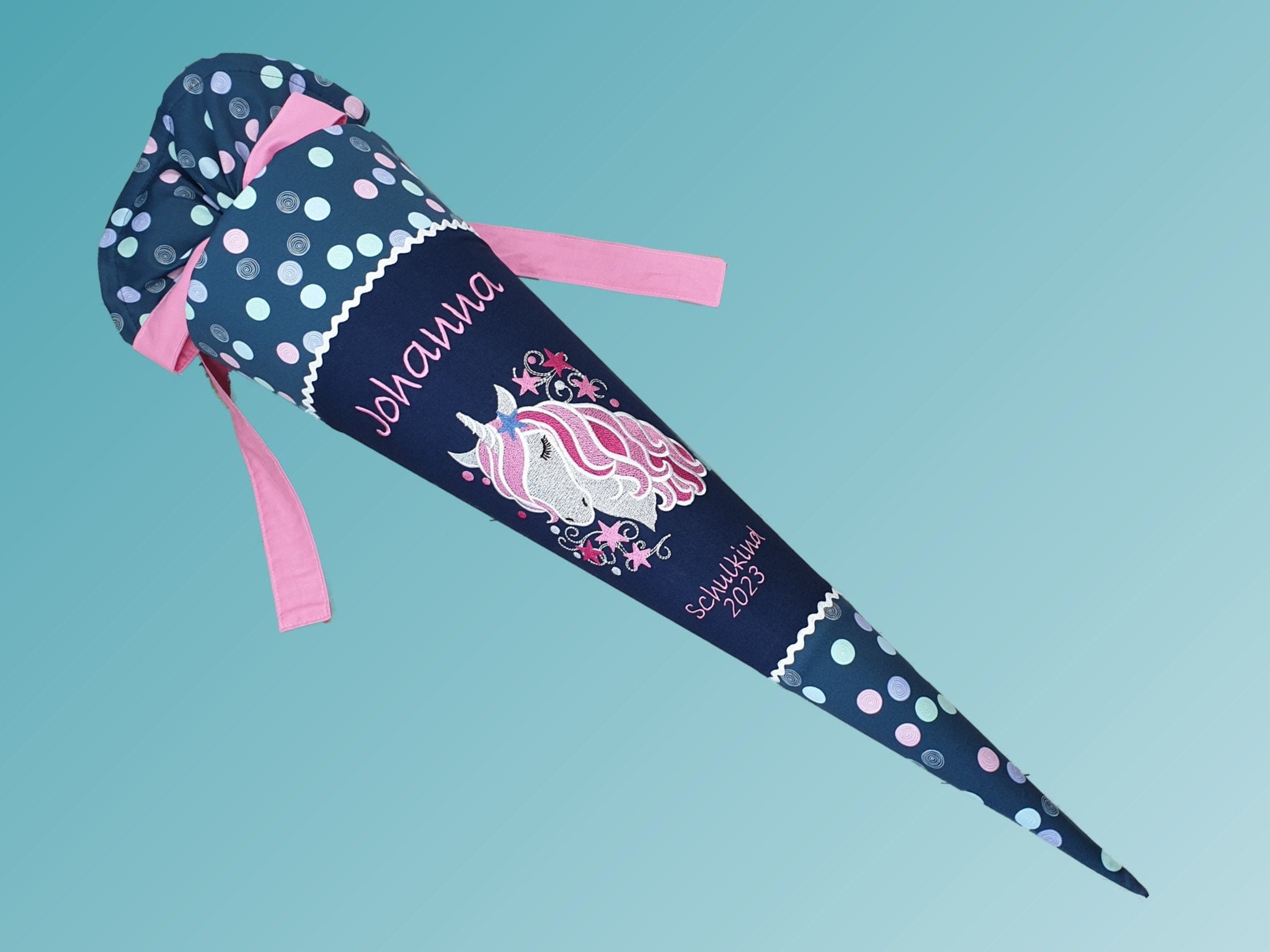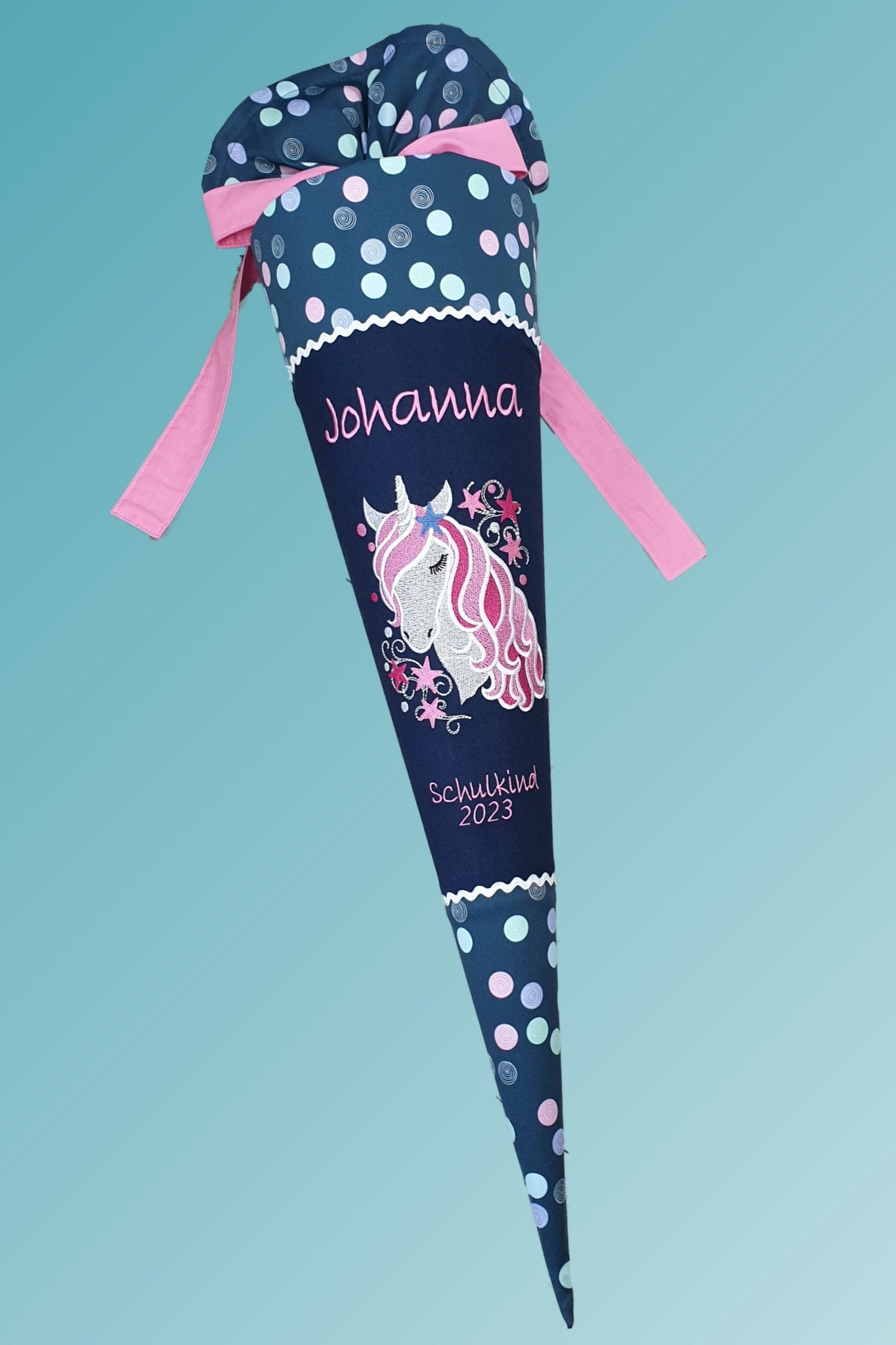 Jede Schultüte wird mit einem gestickten Motiv und dem Namen deines Kindes individuell gestaltet. Auf Wunsch fügen wir auch das Datum des ersten Schultages hinzu.