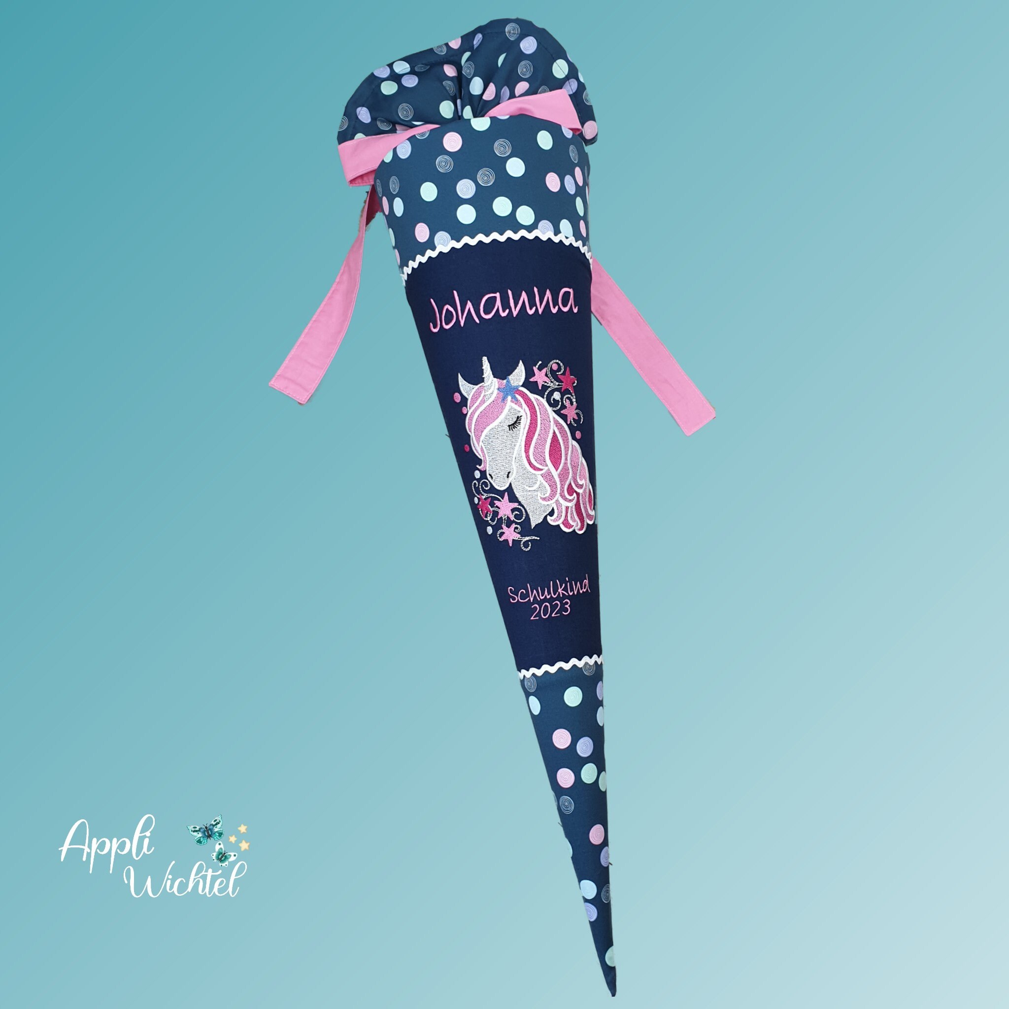 Schultüte mit Einhorn und Namen farblich auf den Polly Schulranzen abgestimmt.