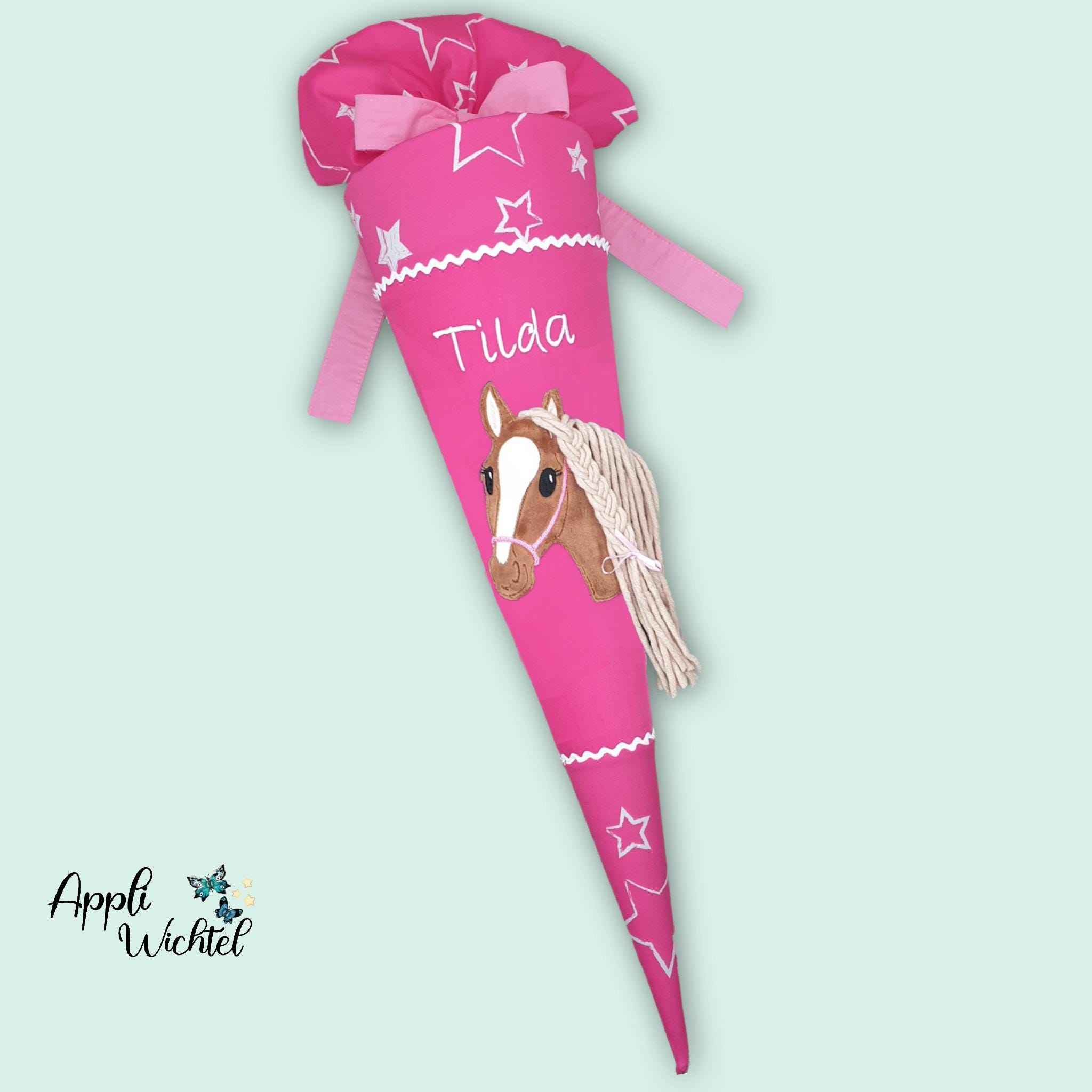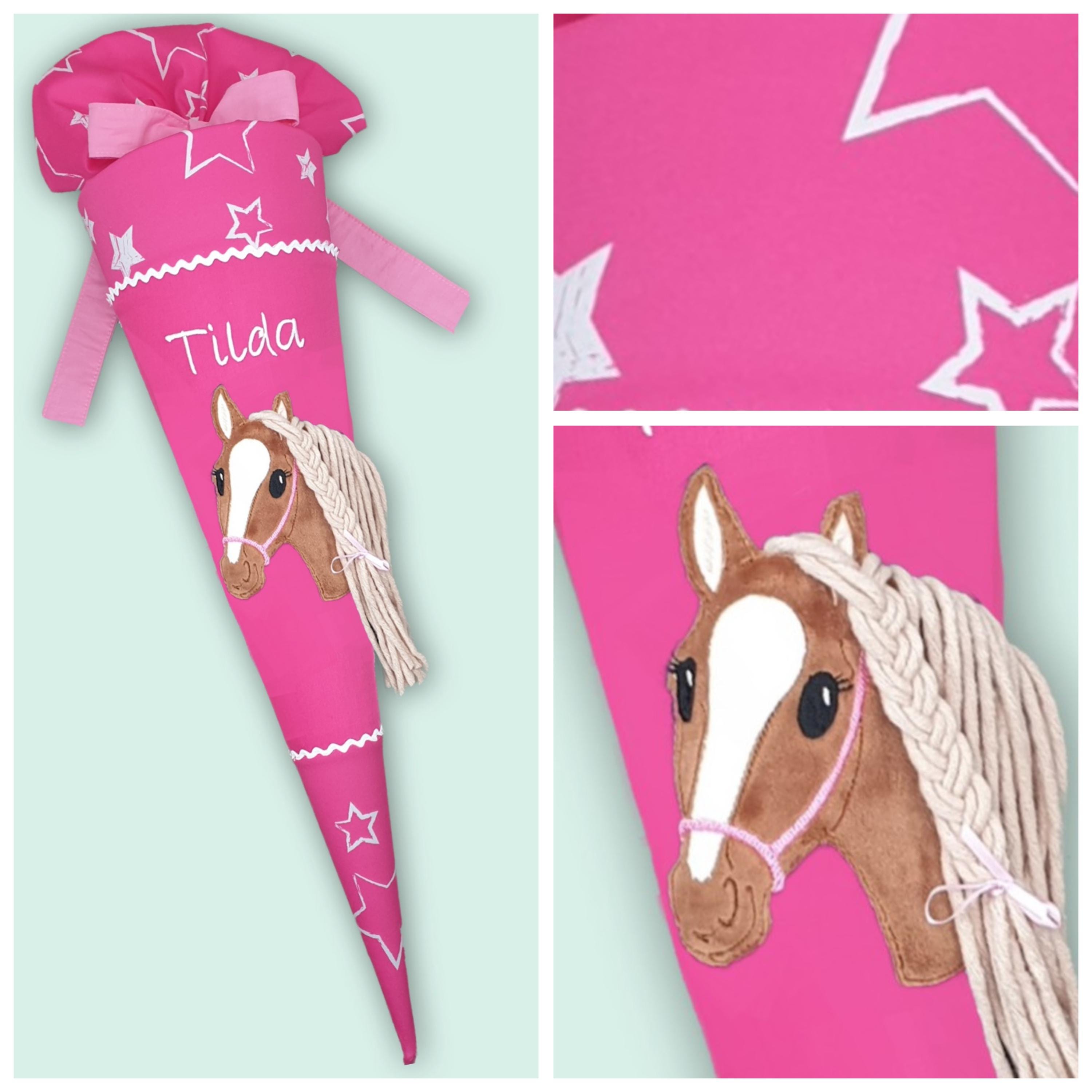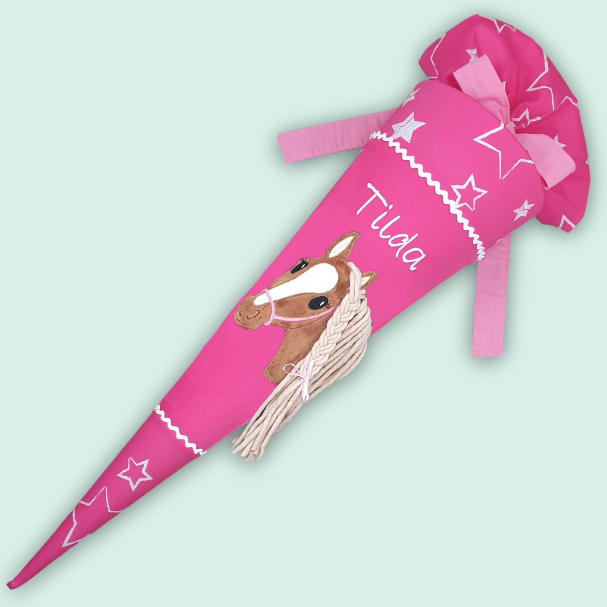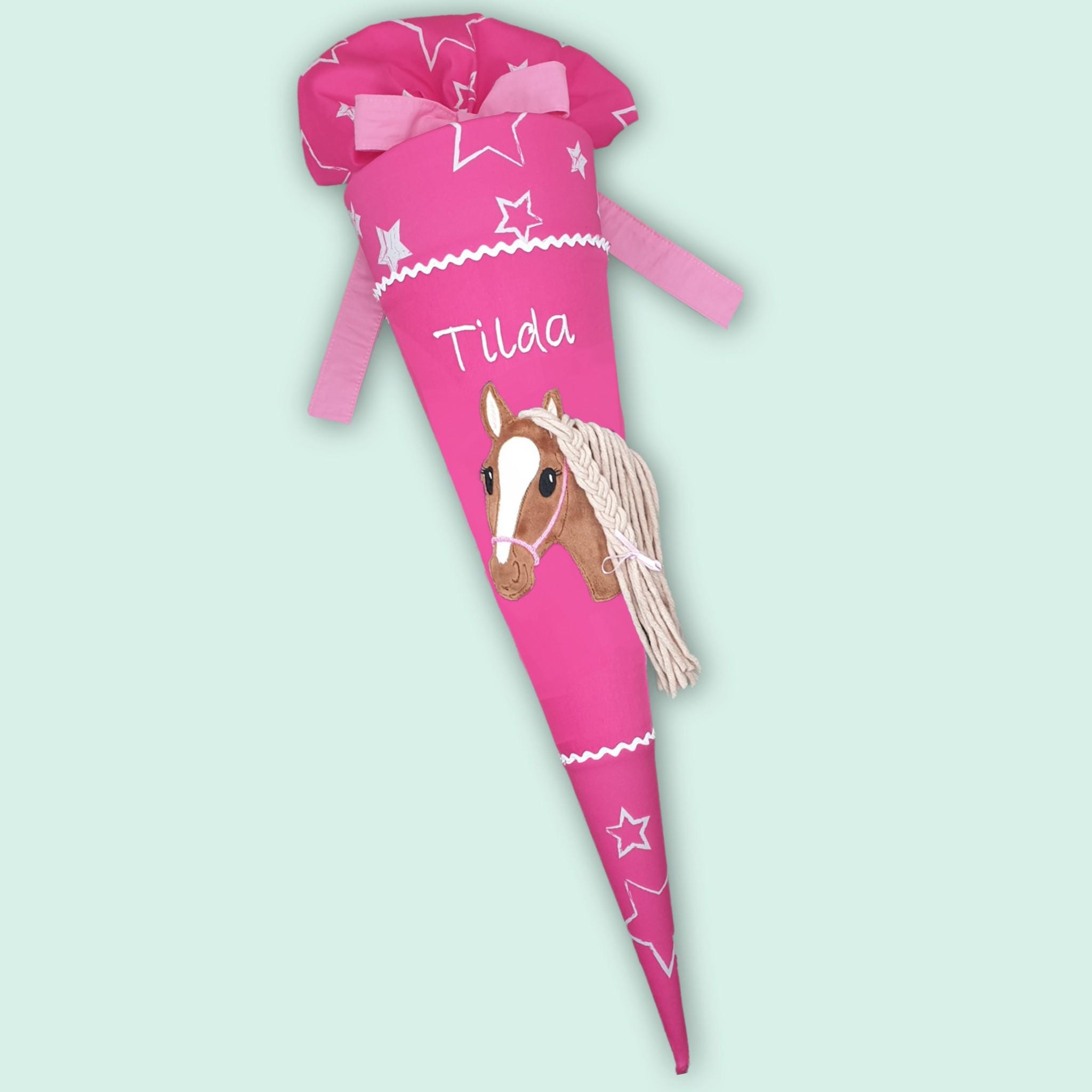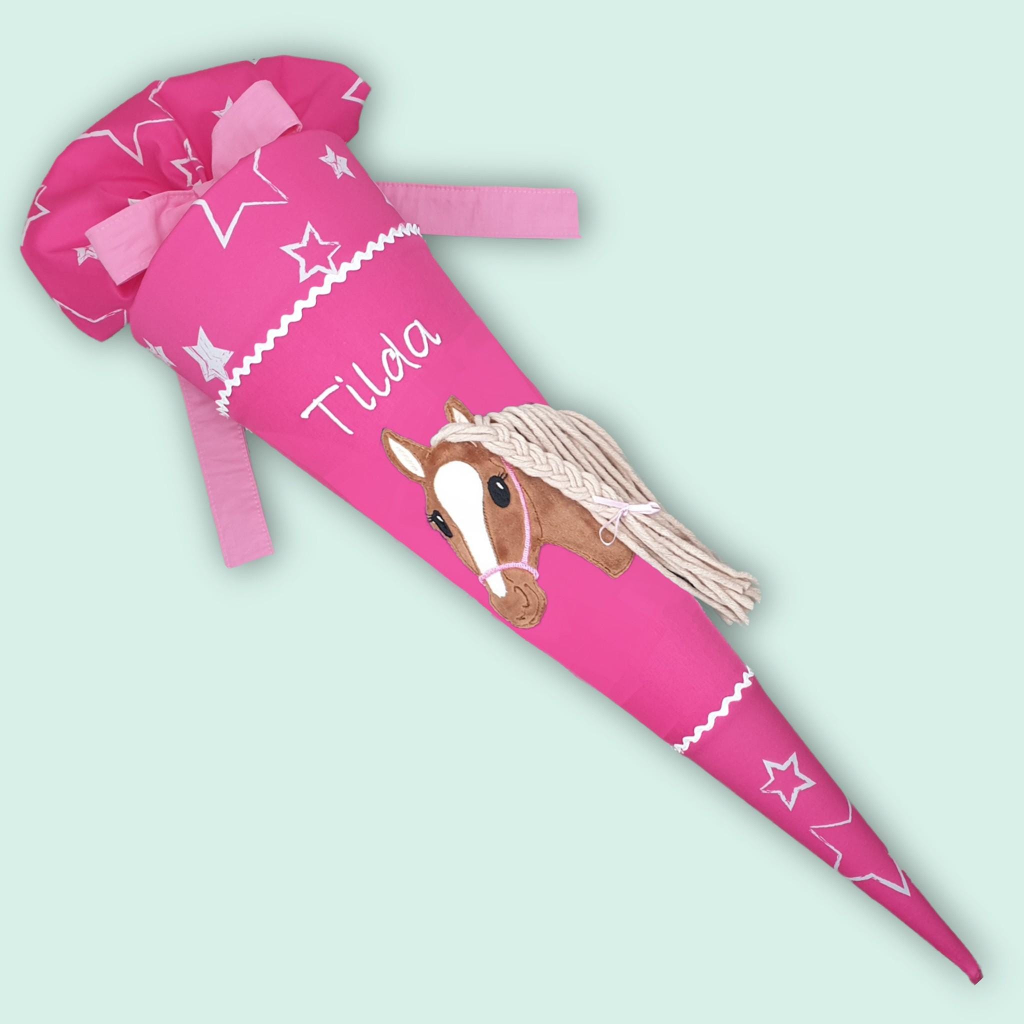 Schultüte mit Pferd und Namen farblich auf den Ergobag Sternenzaubär Schulranzen abgestimmt.