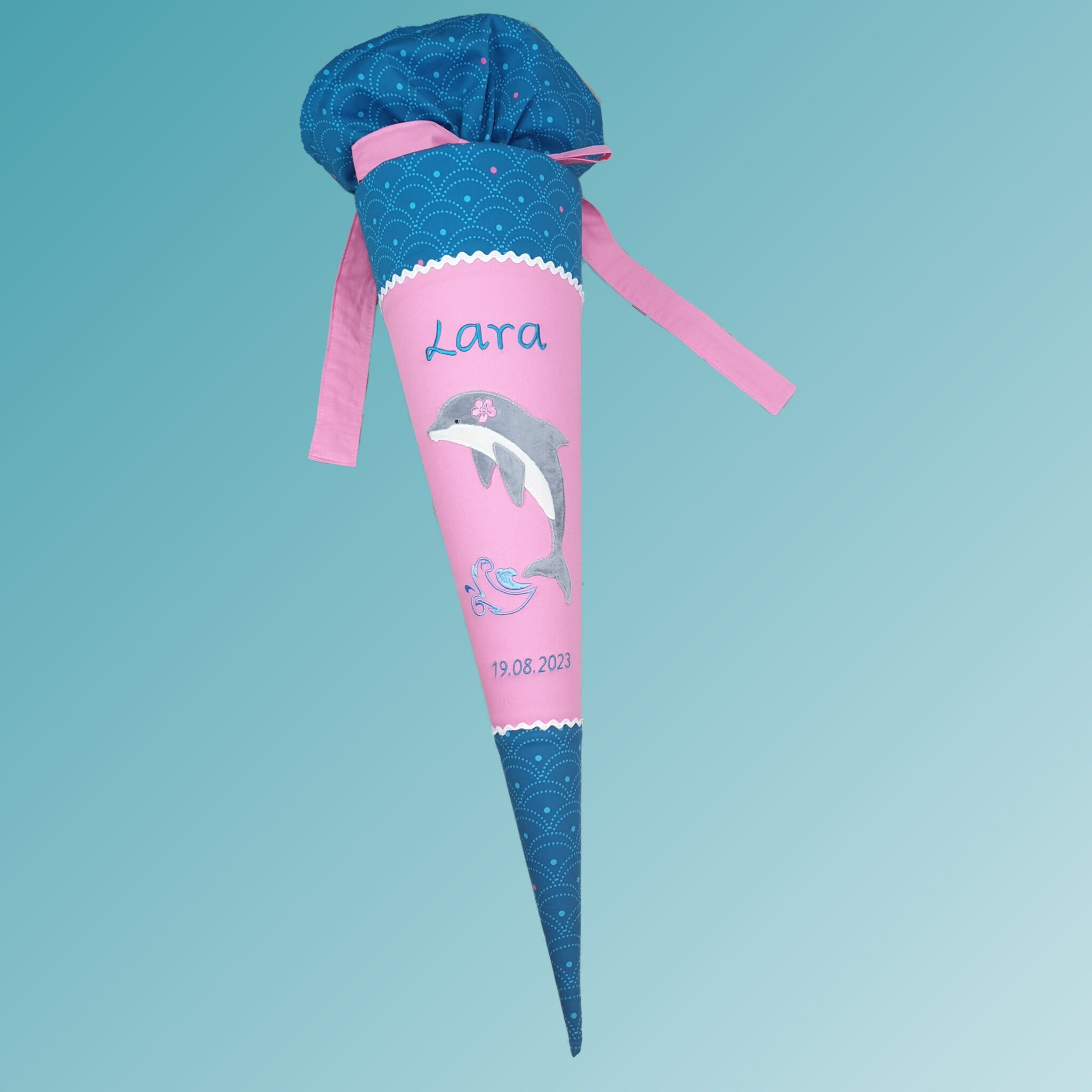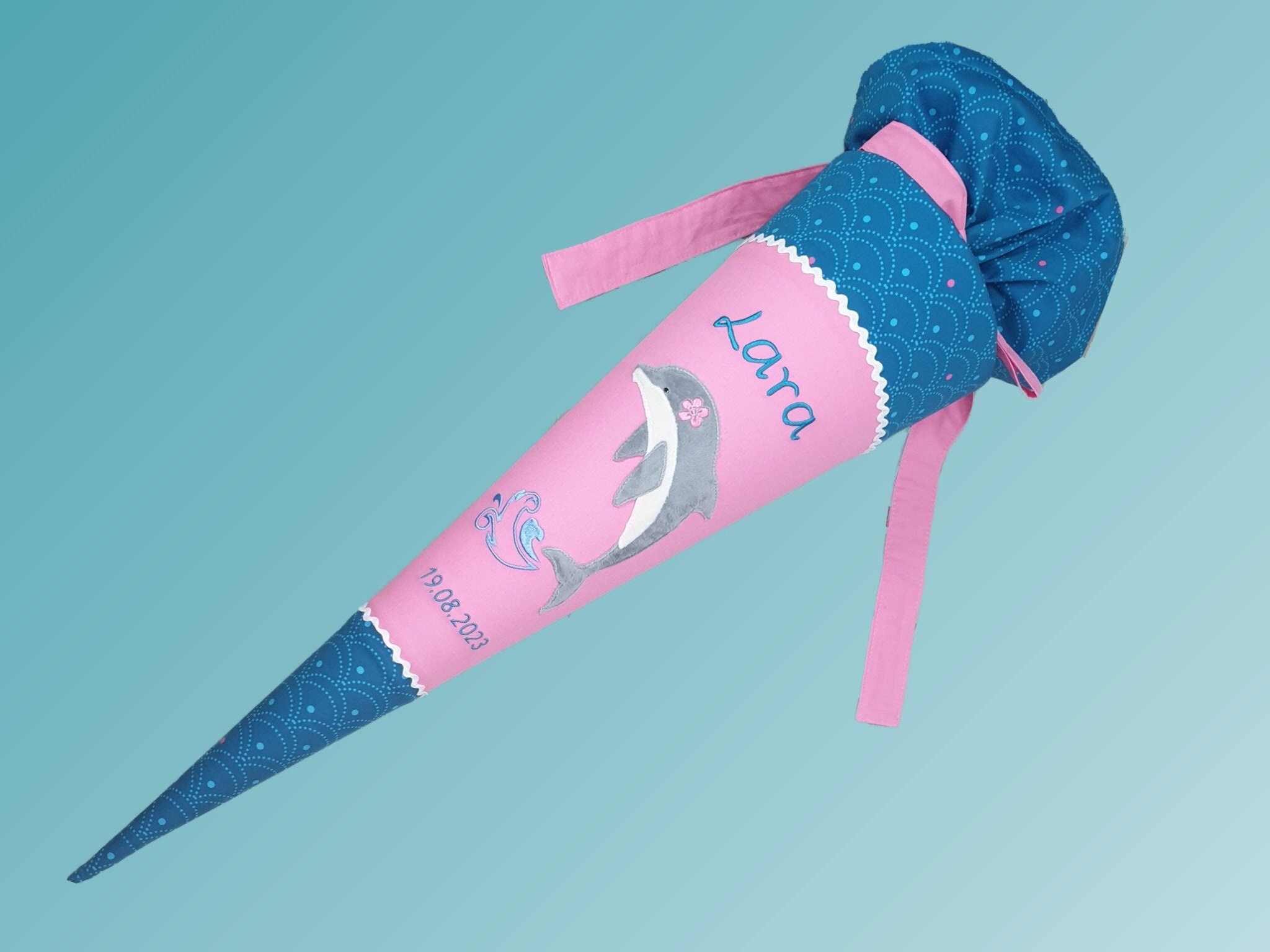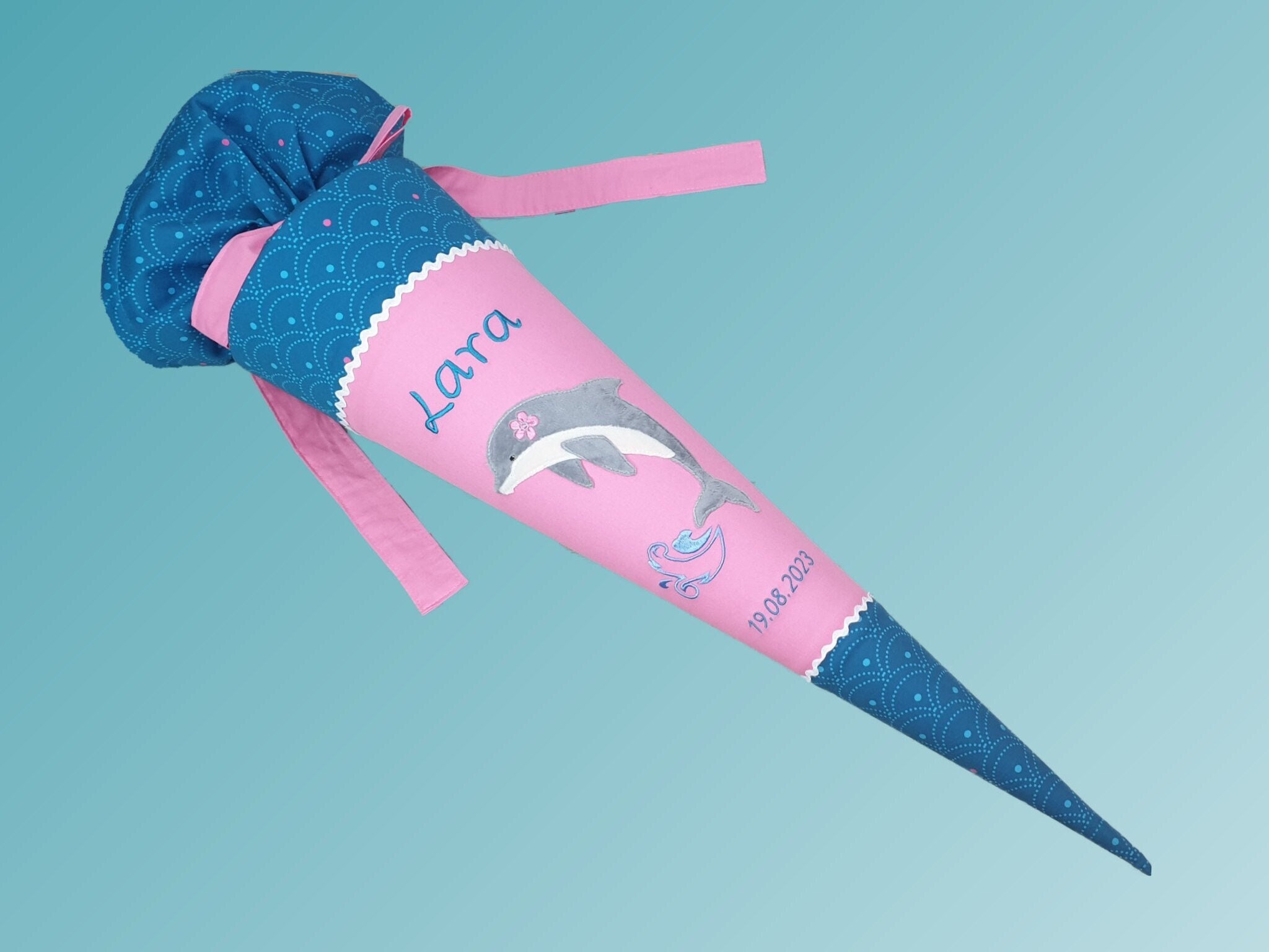 Schultüte mit Delfin und Namen farblich auf den Step by step Dolphin Pippa Schulranzen abgestimmt.