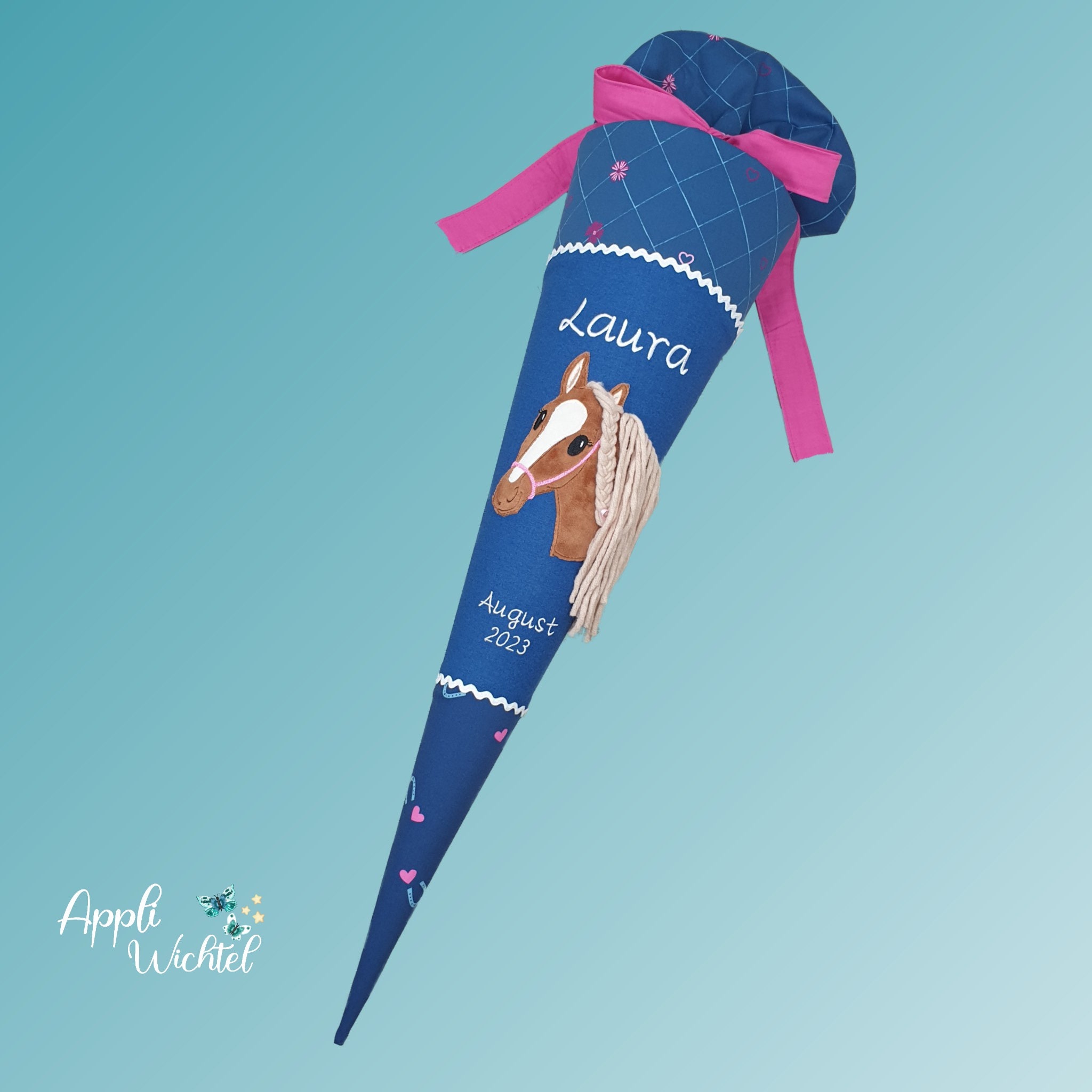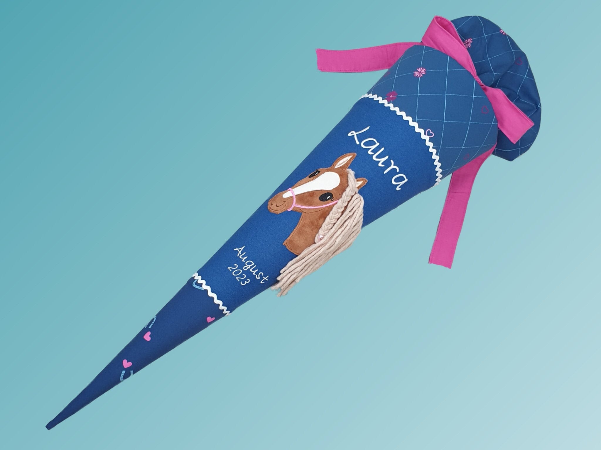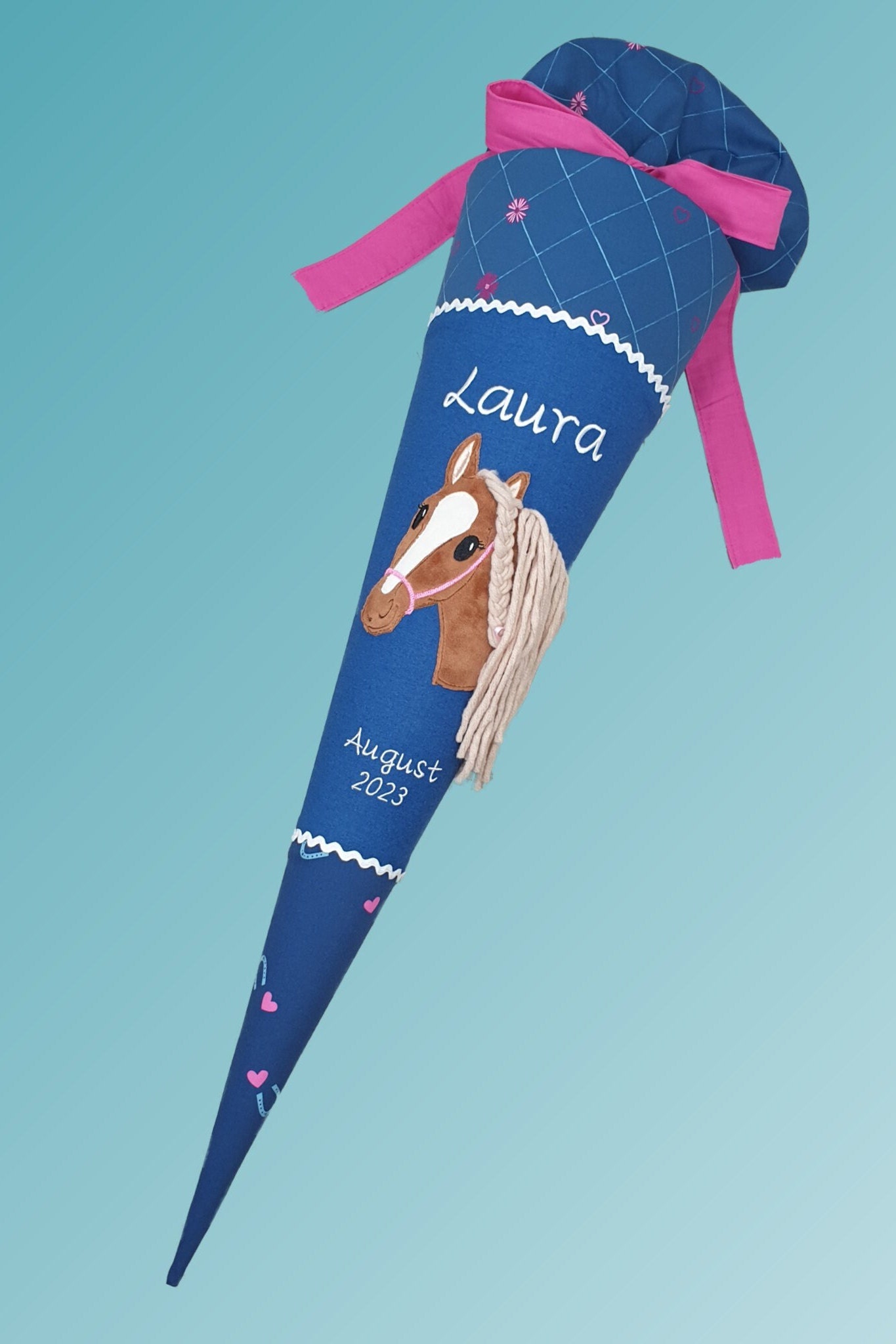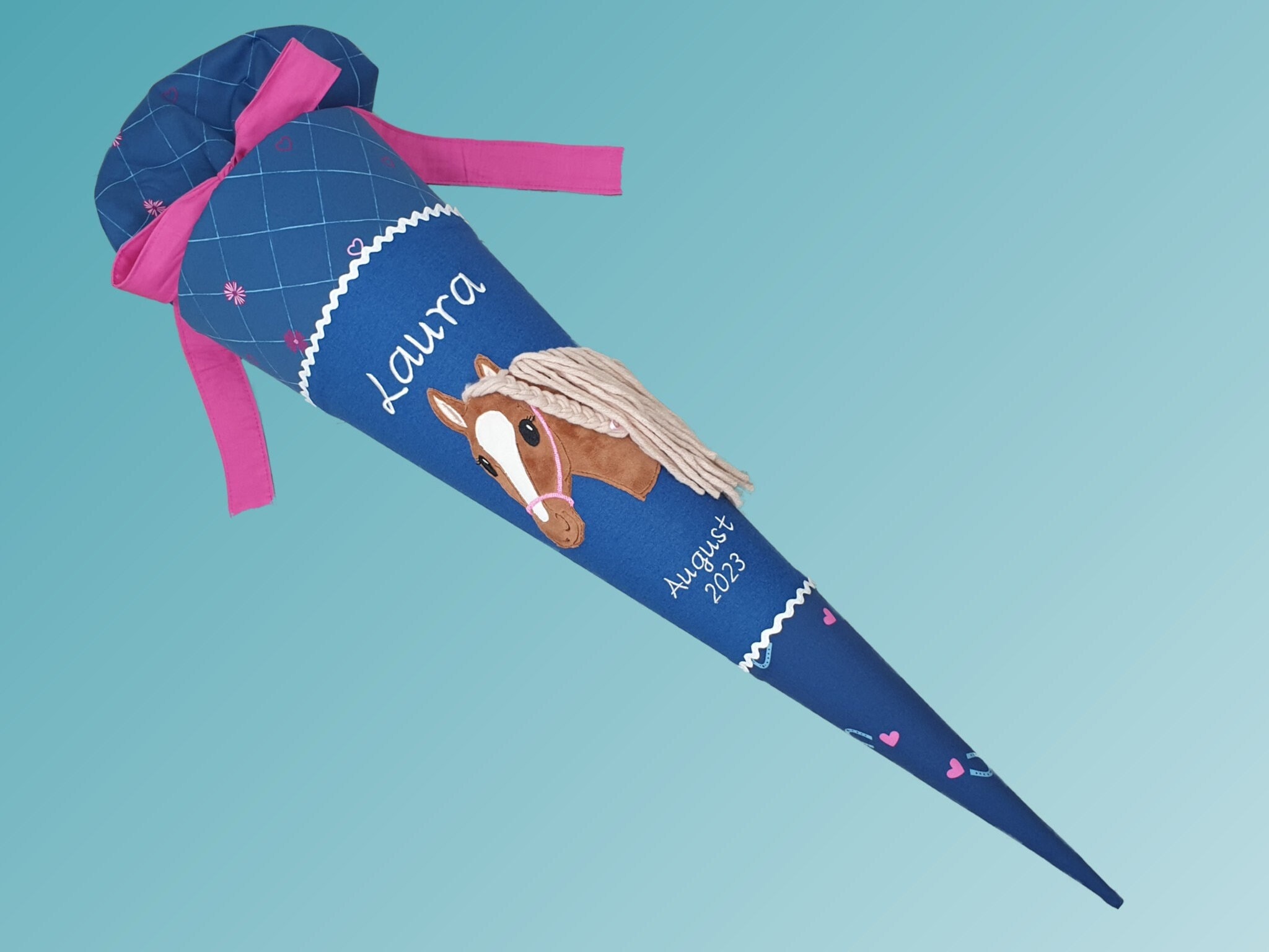 Schultüte mit 3D Pferdekopf und Namen farblich auf den Step by Step Horse Lima Schulranzen abgestimmt.