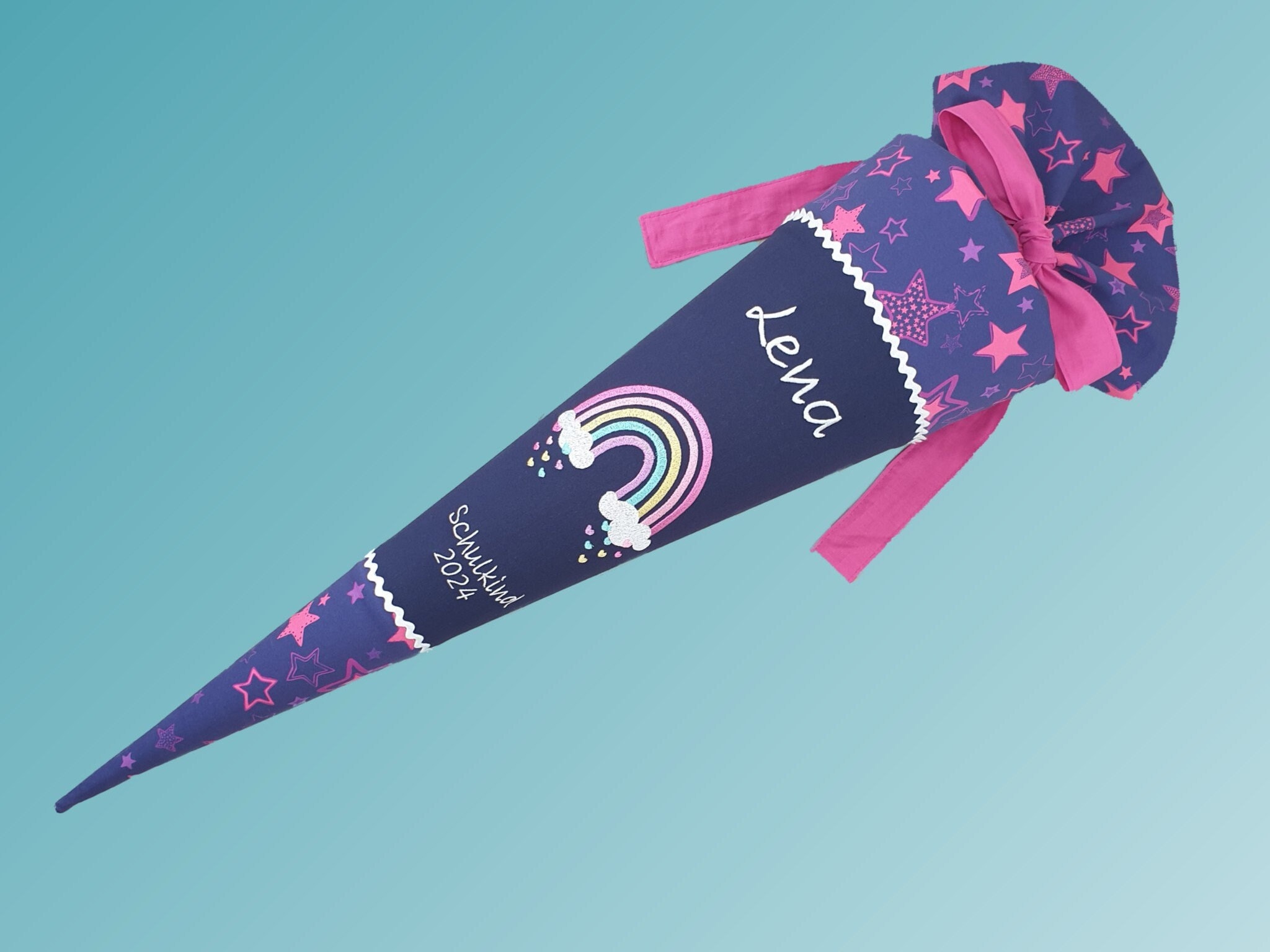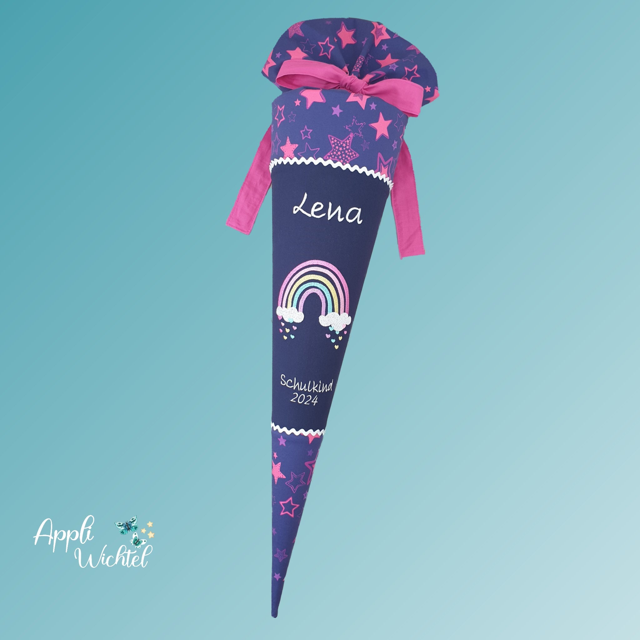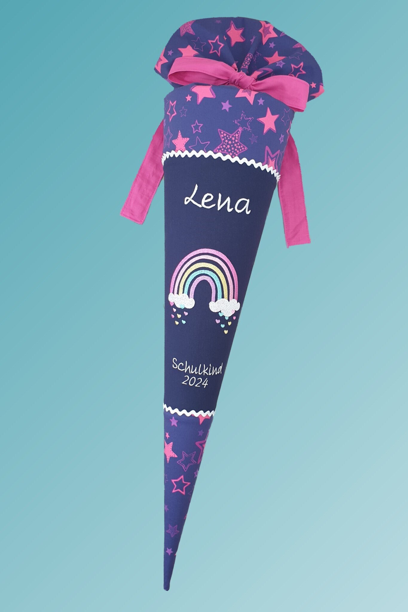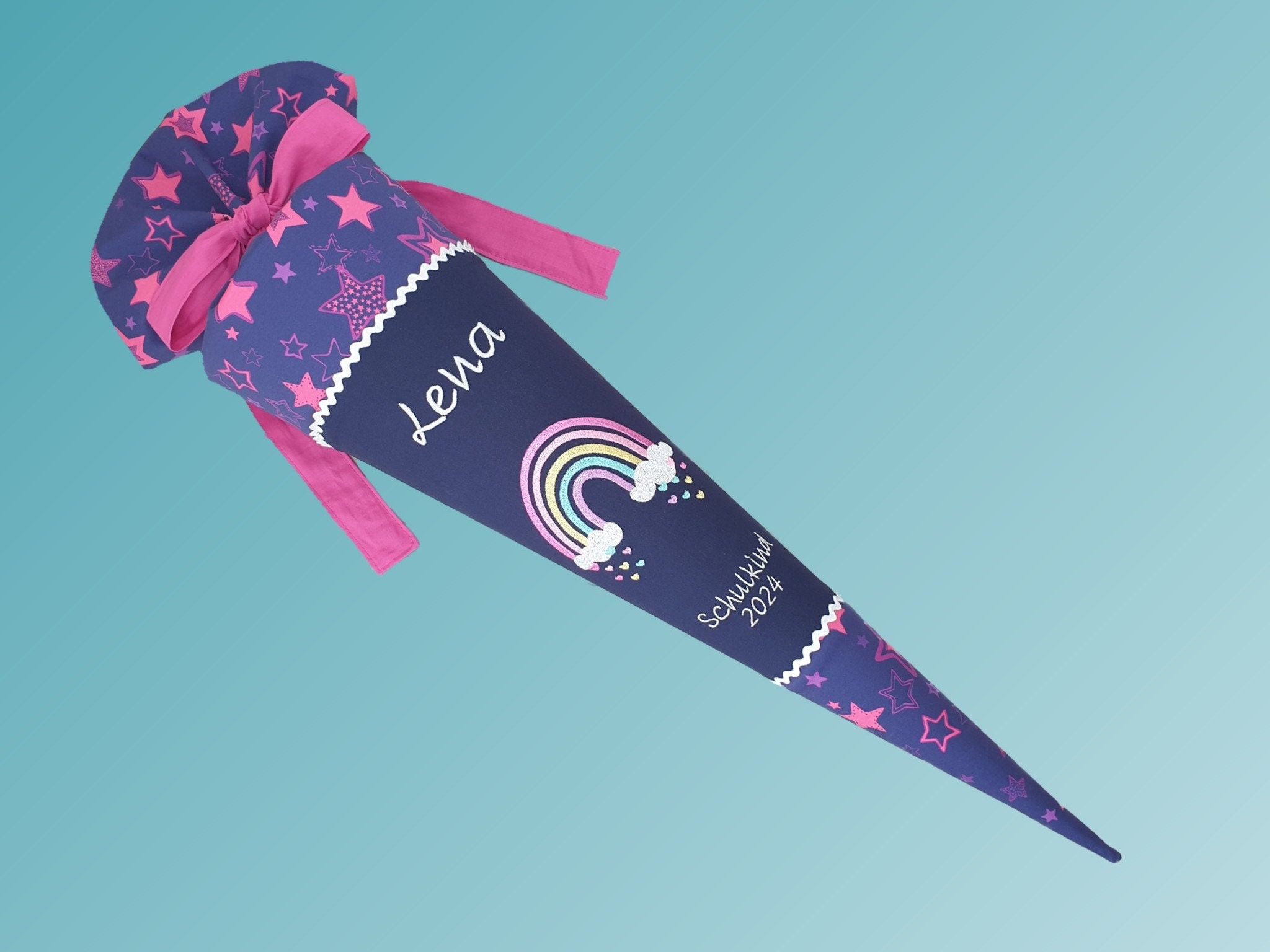 Schultüte mit Regenbogen und Namen farblich auf den Pegasus Night Nuala Schulranzen abgestimmt.