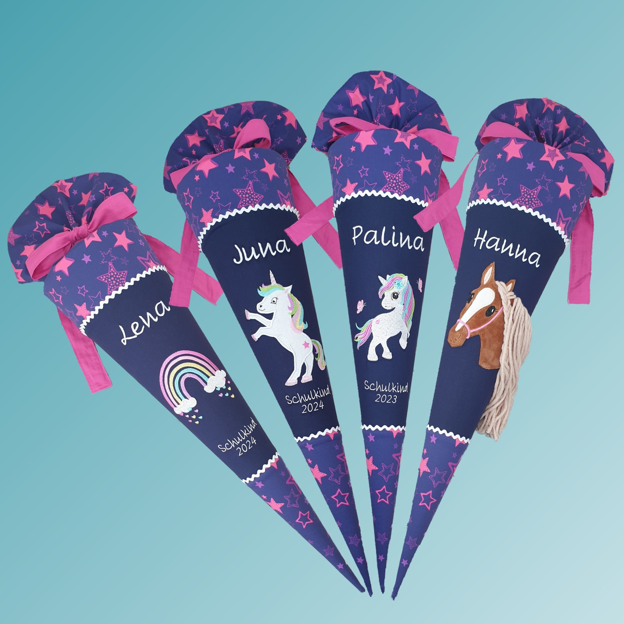 Jede Schultüte wird mit einem gestickten Motiv und dem Namen deines Kindes individuell gestaltet. Auf Wunsch fügen wir auch das Datum des ersten Schultages hinzu.