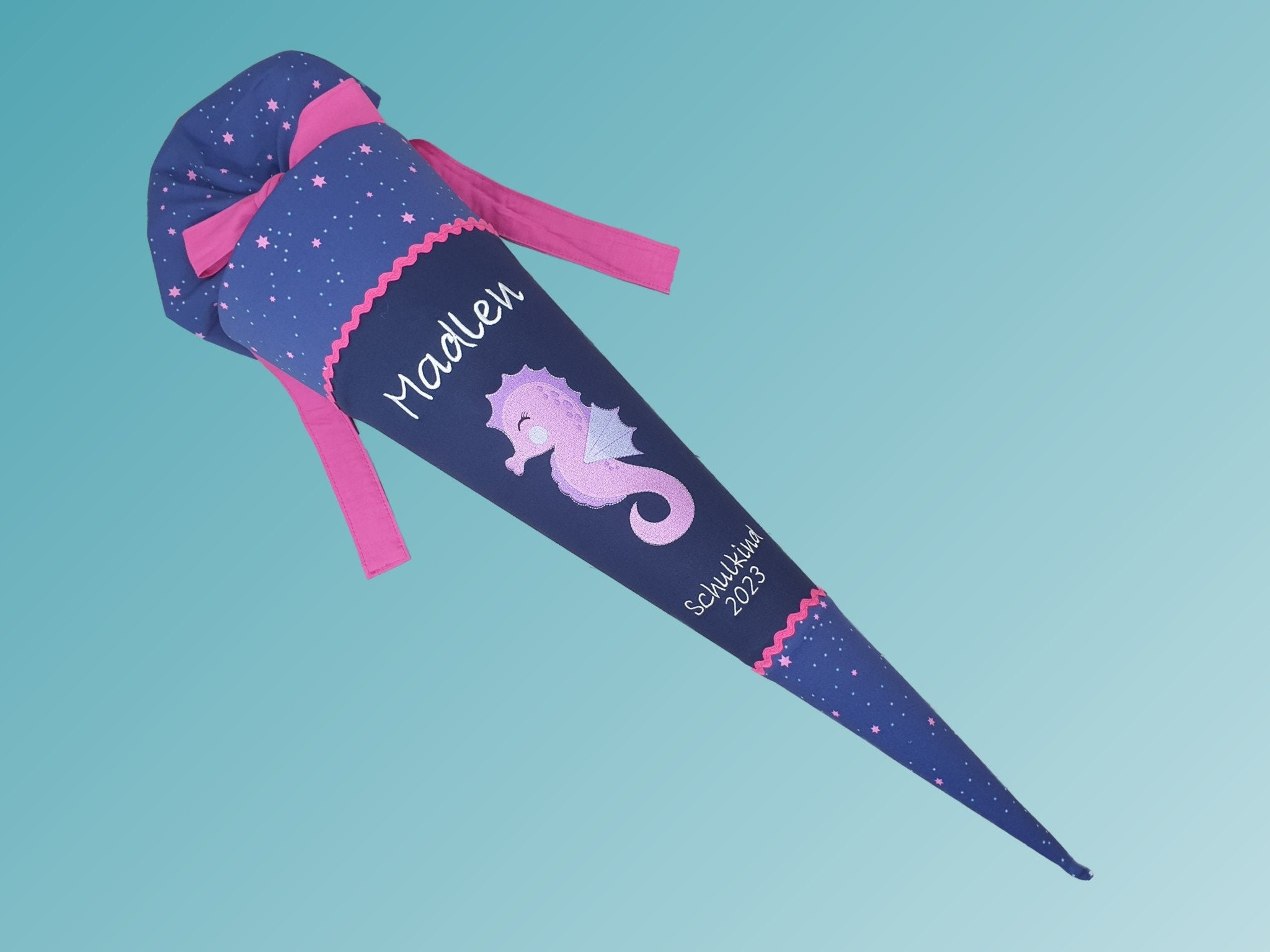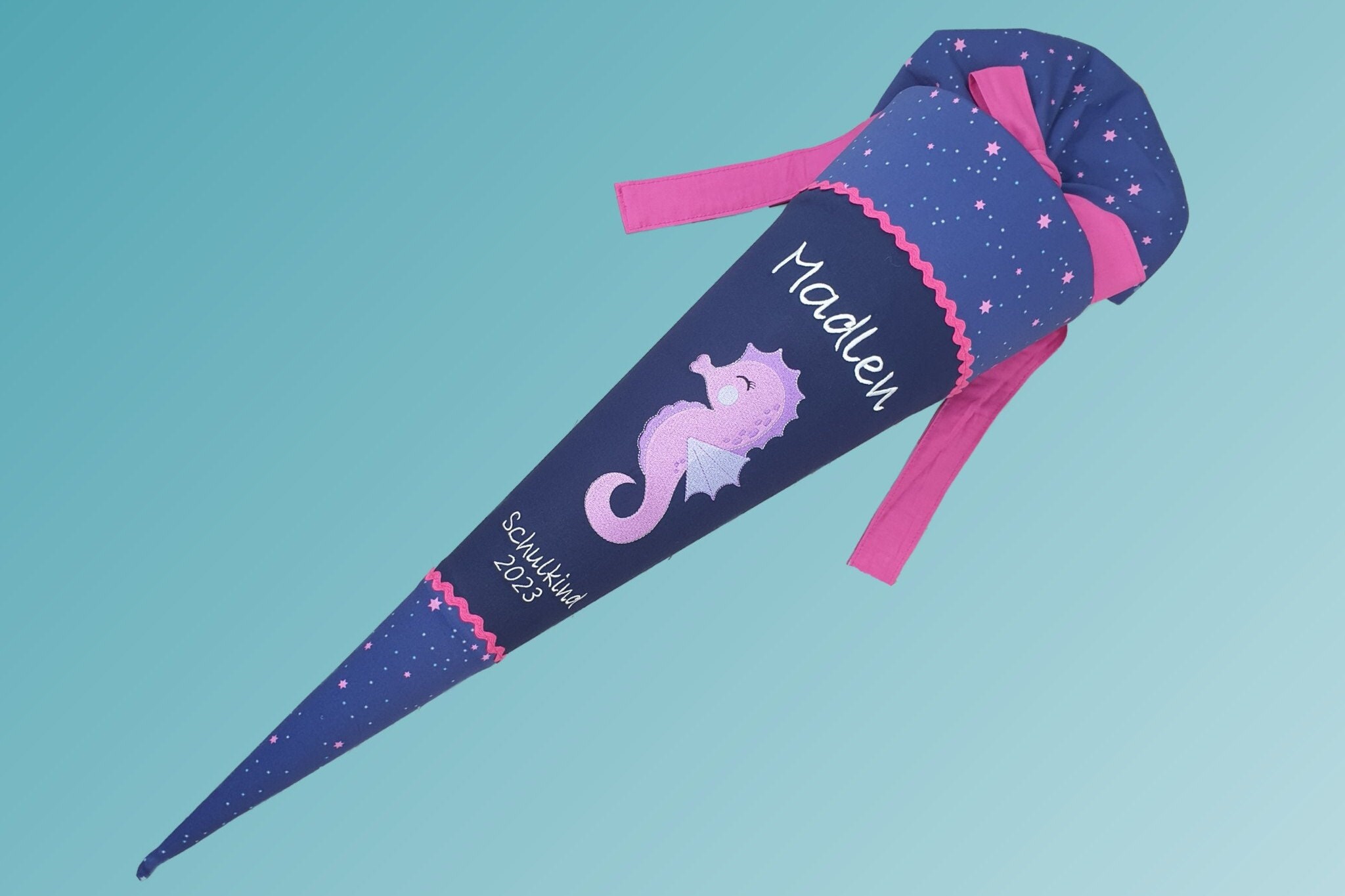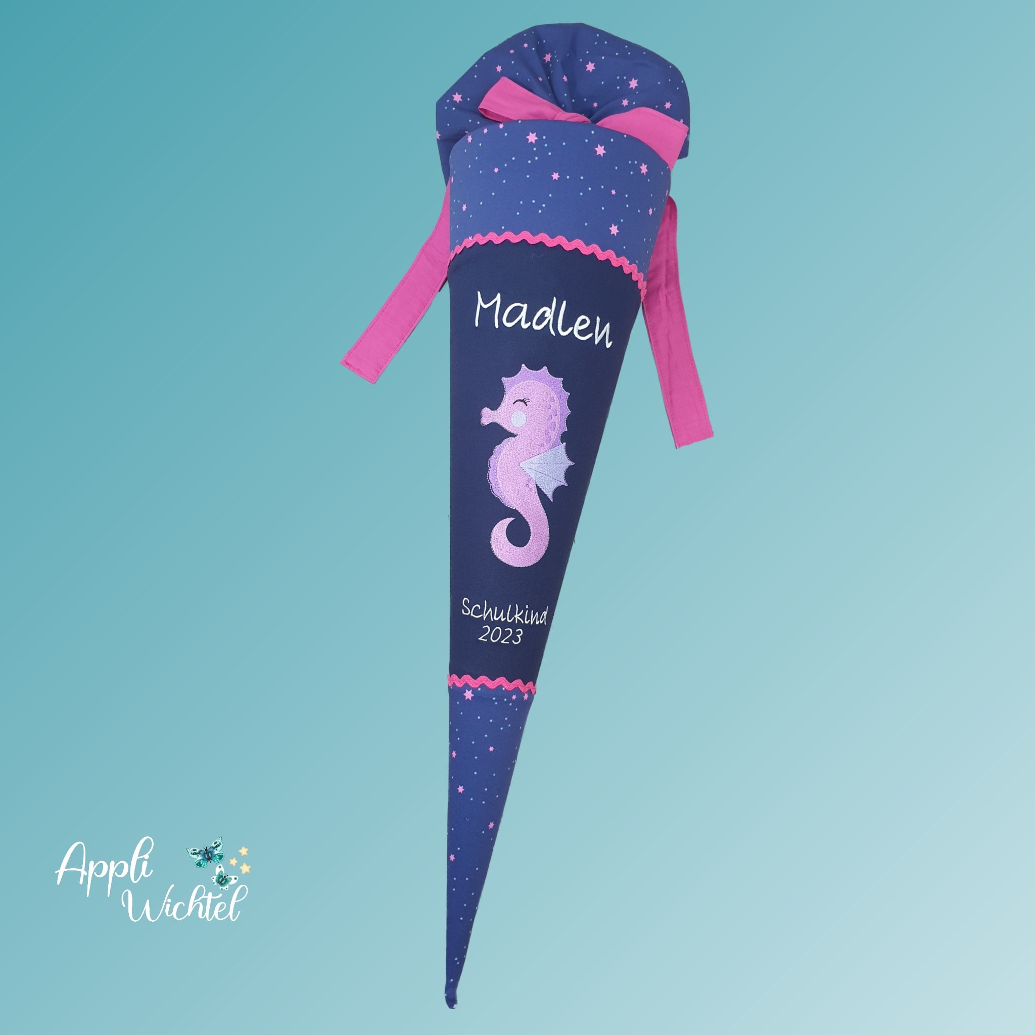 Jede Schultüte wird mit einem gestickten Motiv und dem Namen deines Kindes individuell gestaltet. Auf Wunsch fügen wir auch das Datum des ersten Schultages hinzu.