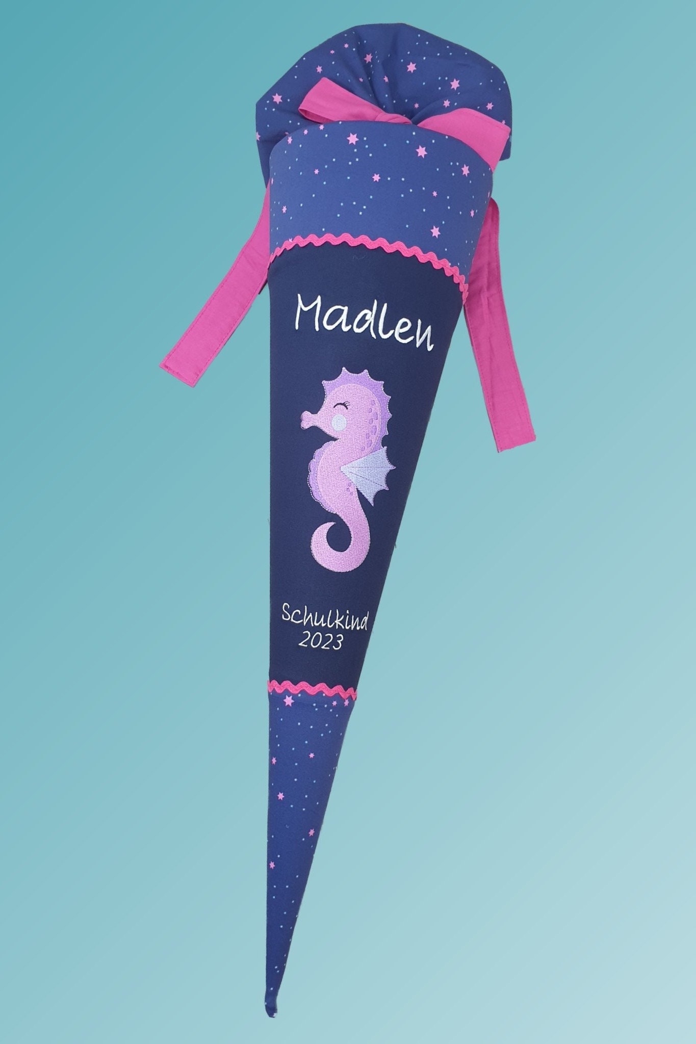 Schultütee mit Seepferd und Namen farblich auf den step by step Star Seahorse Zoe Schulranzen abgestimmt.