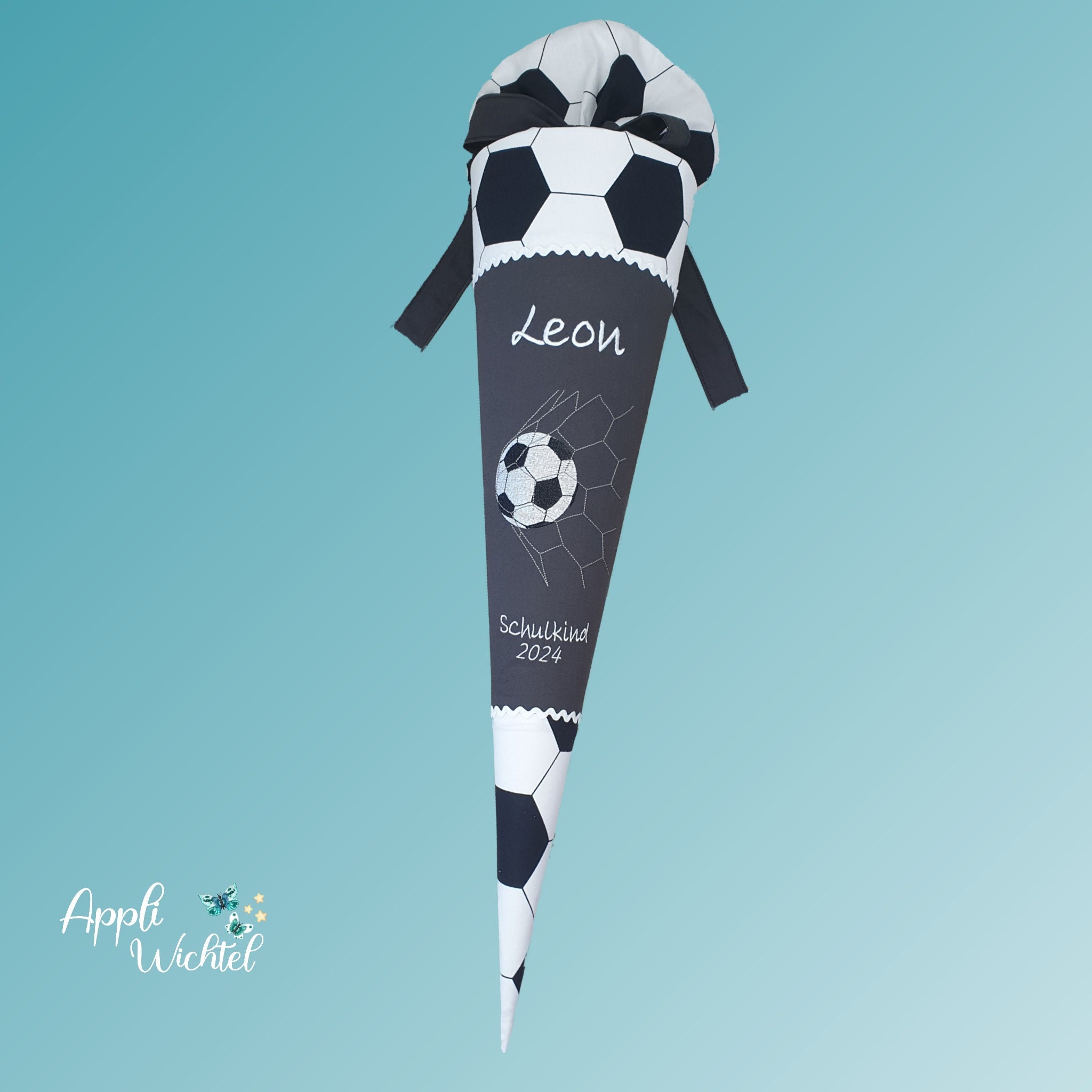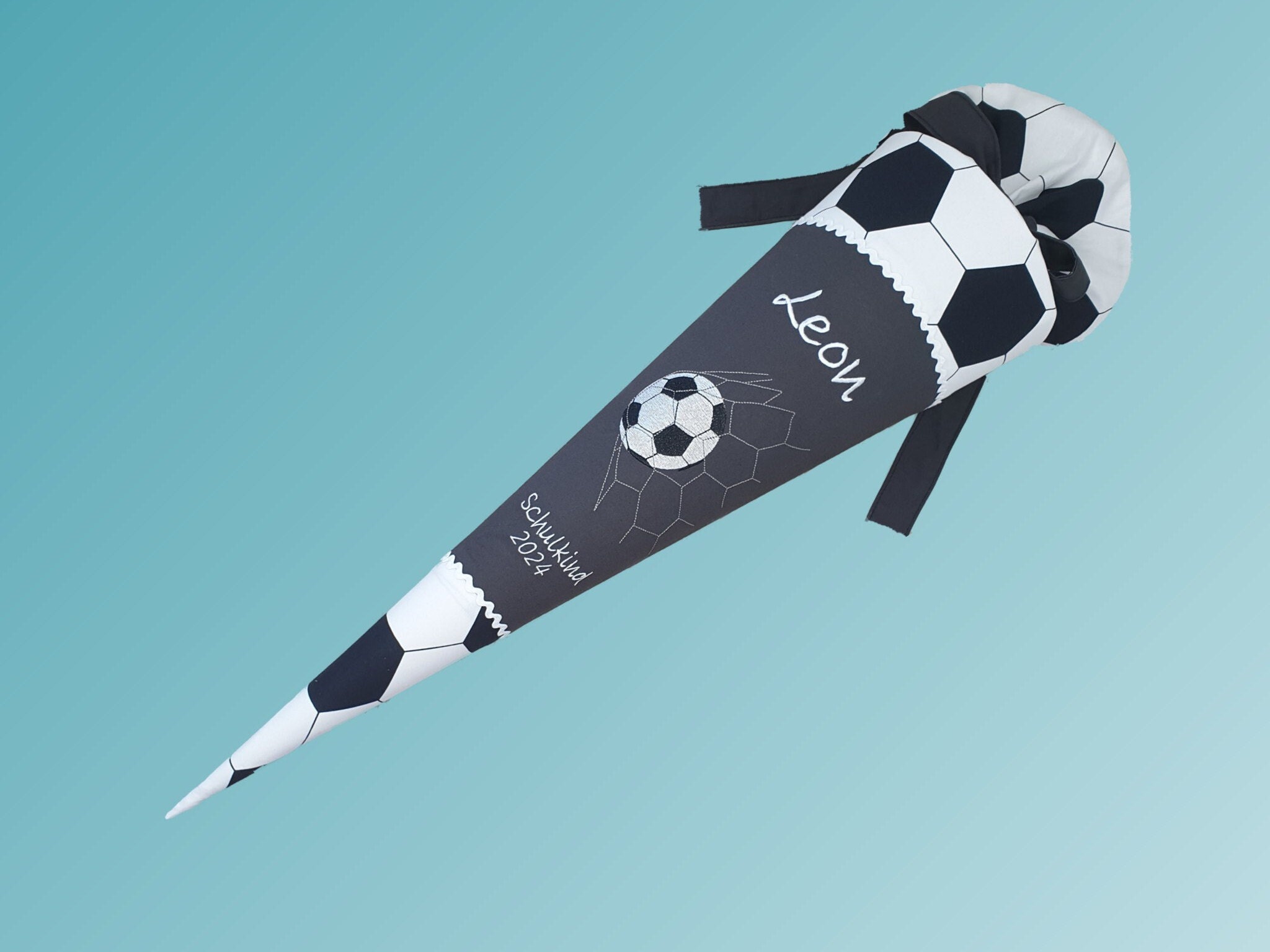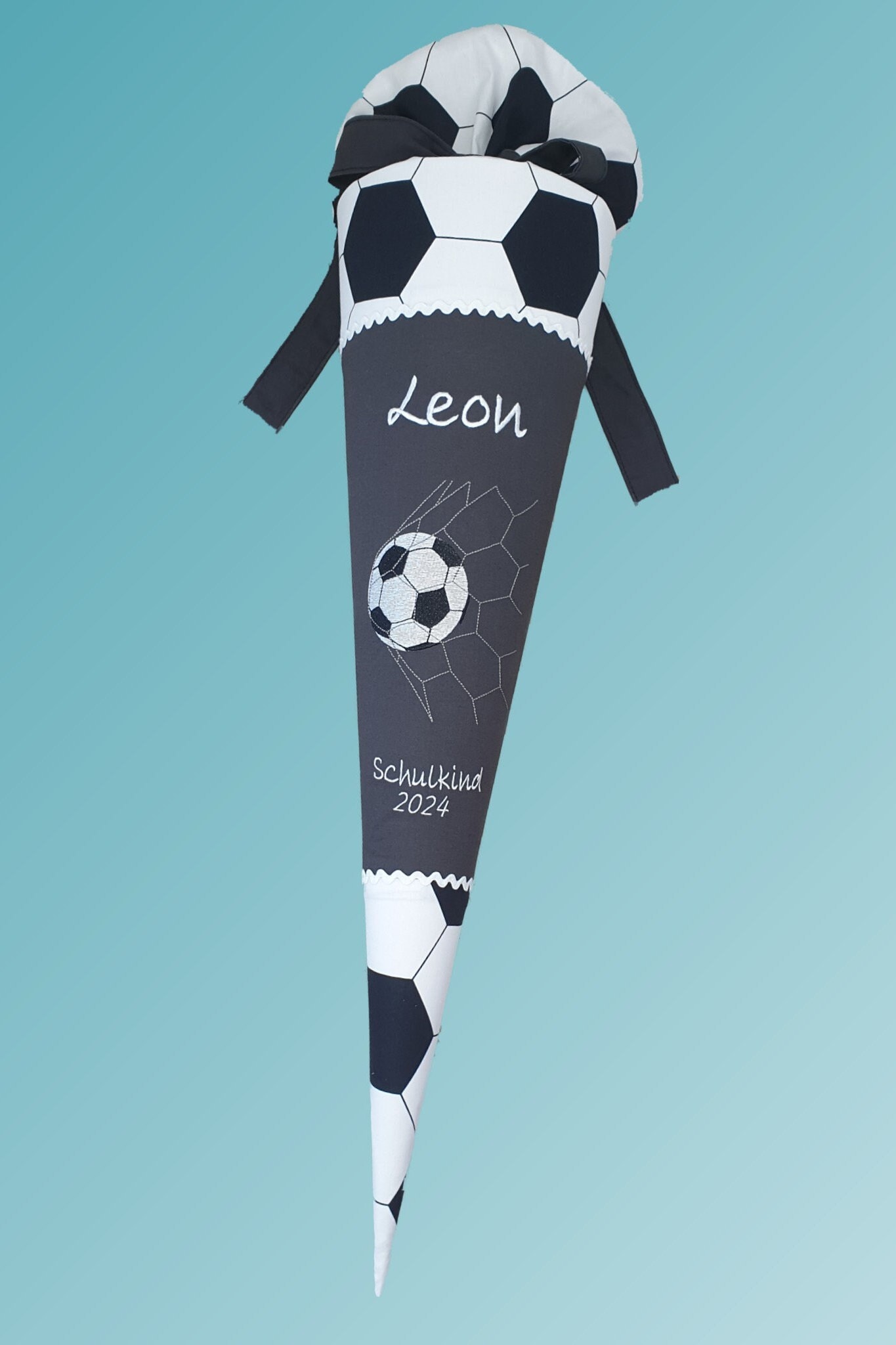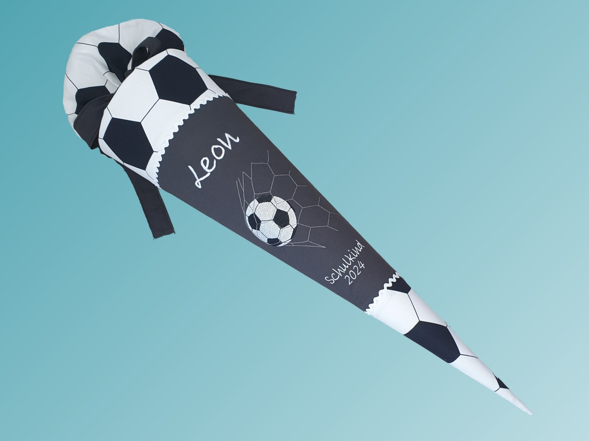 Schultüte mit Fussball und Namen in der Farbe Dunkelgrau.
