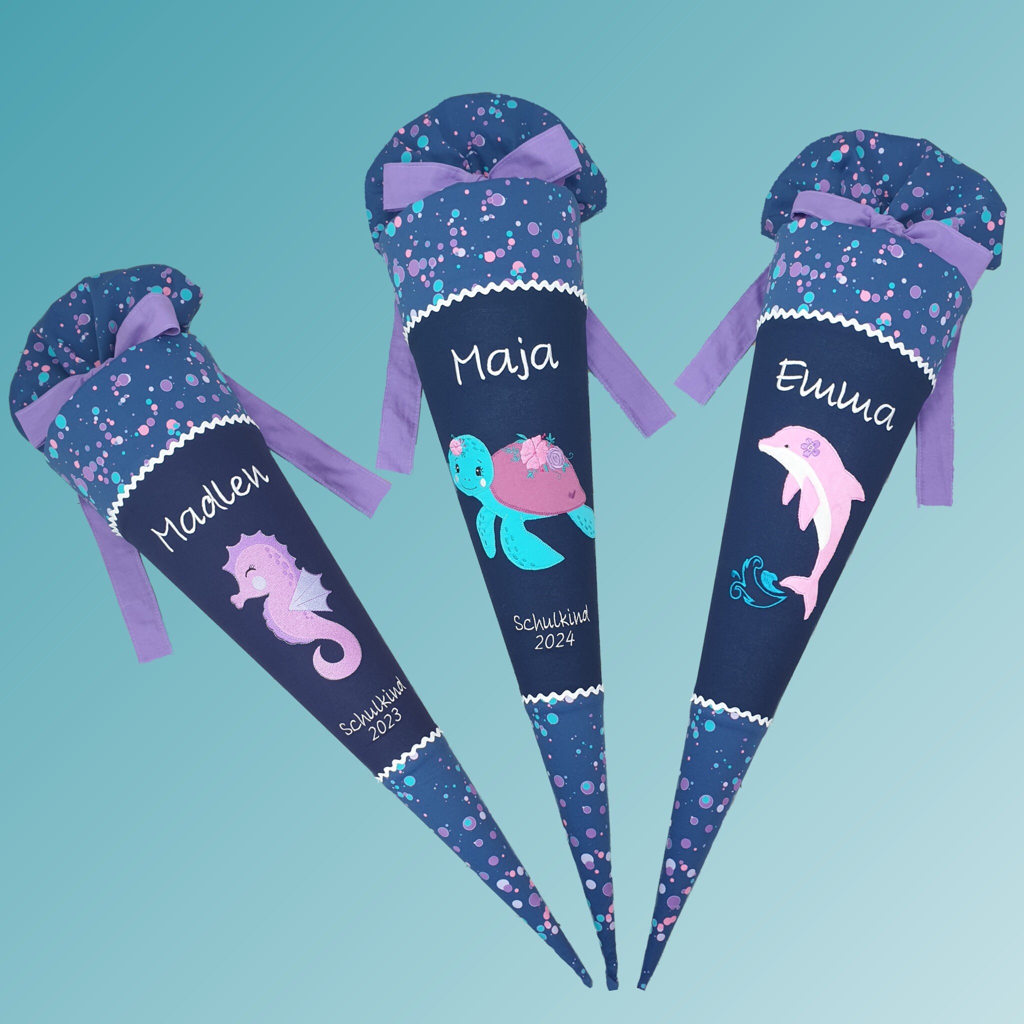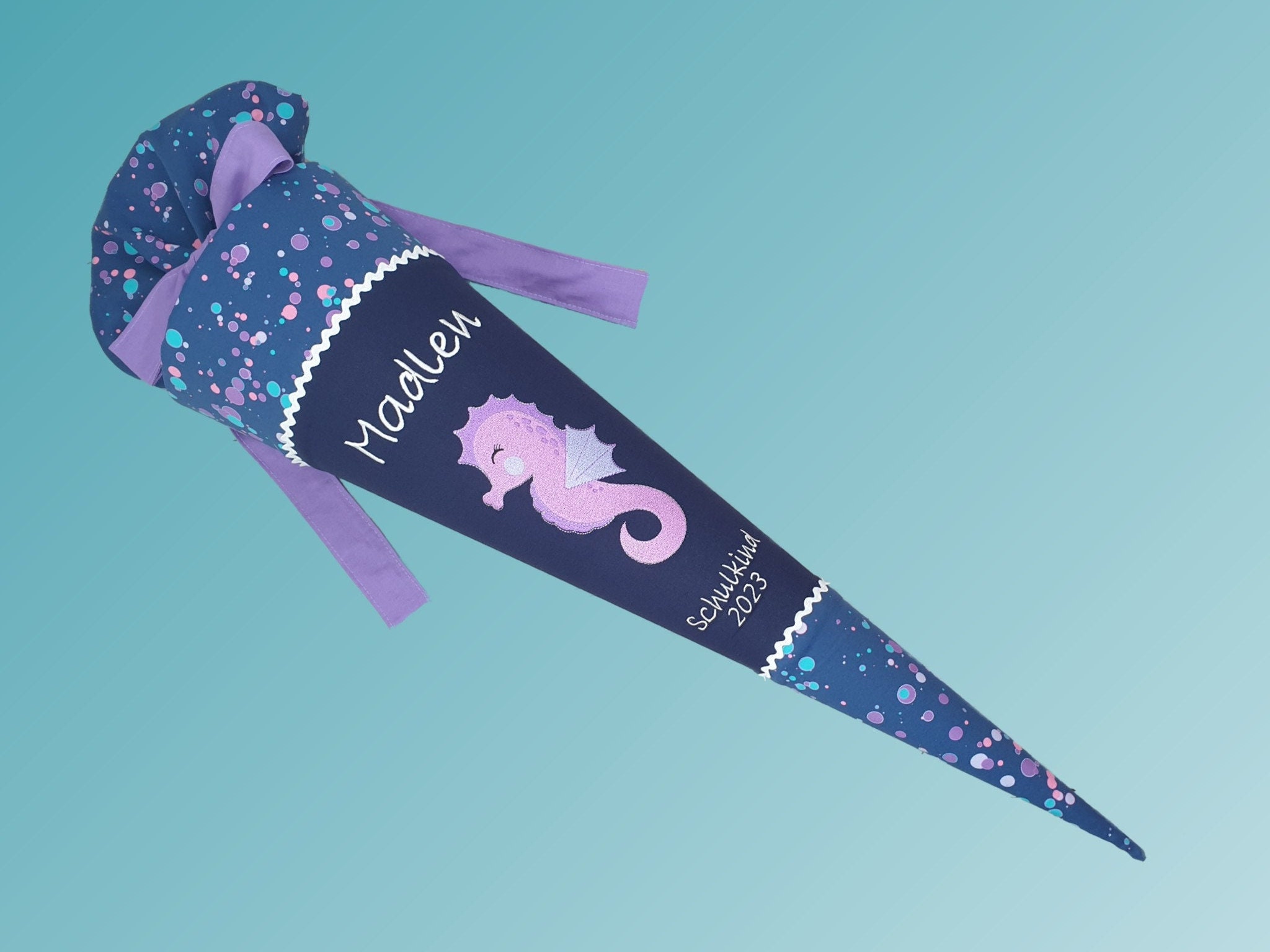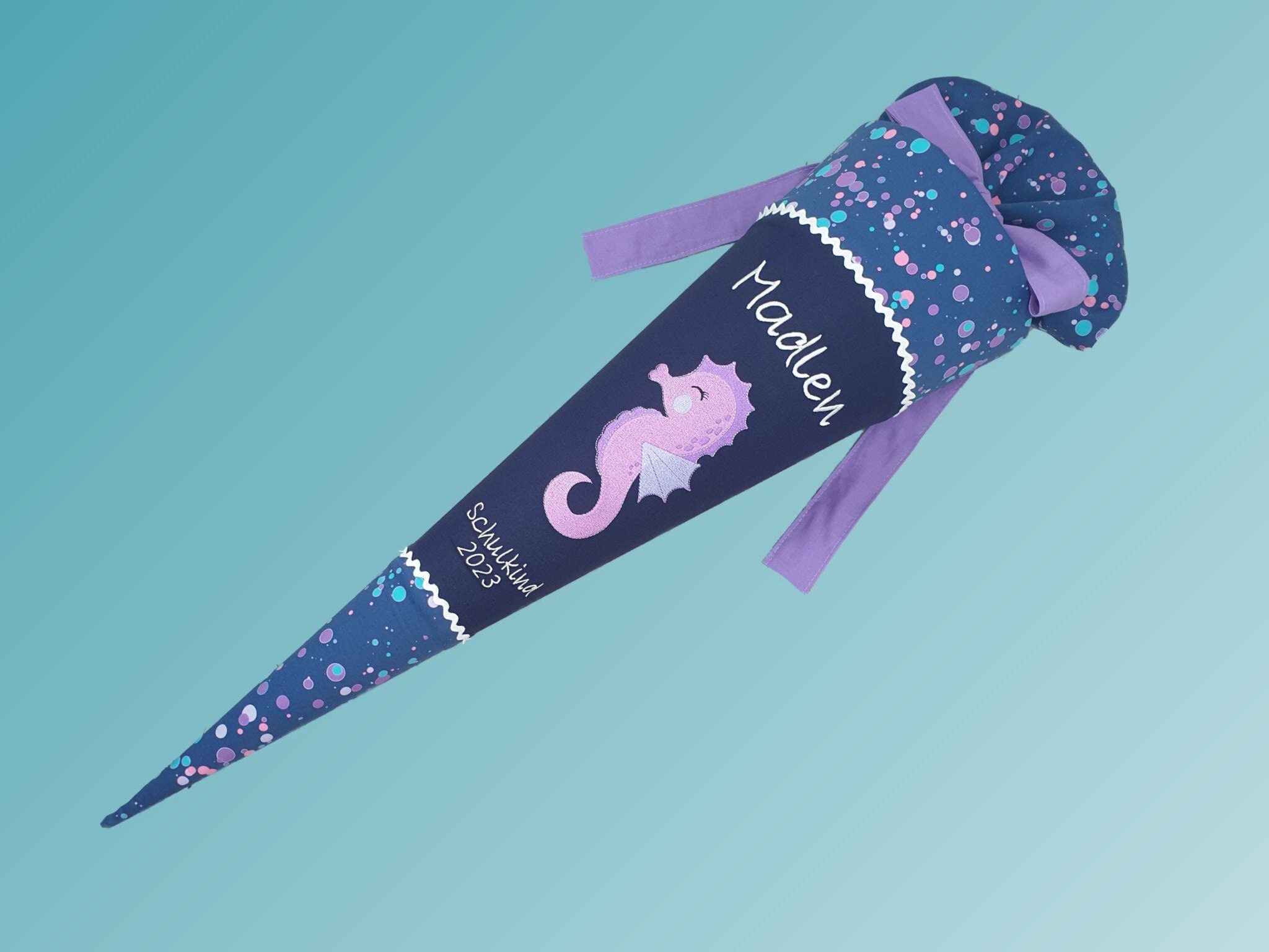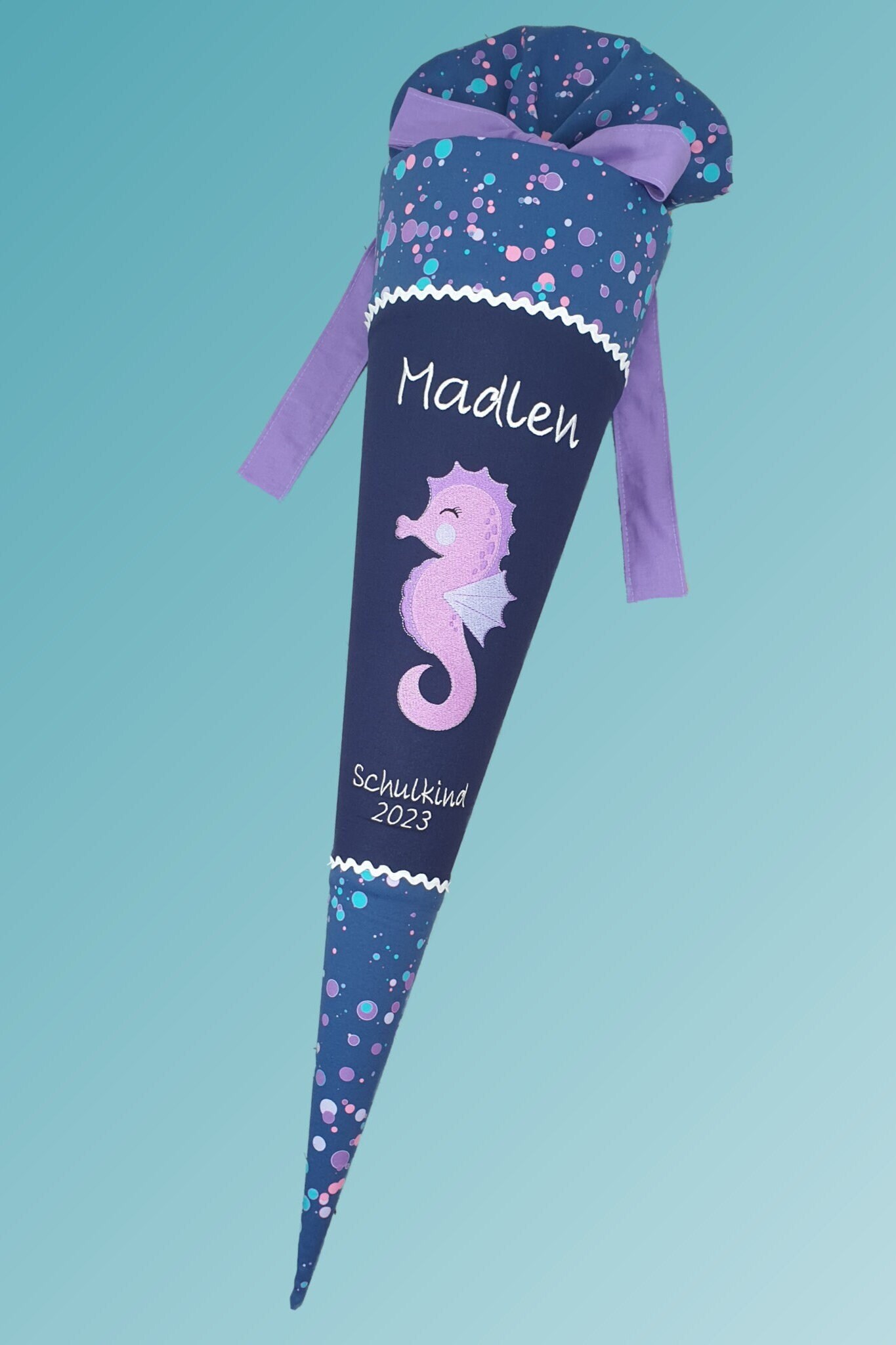 Schultüte mit Seepferd und Namen farblich auf den DerDieDas Deep Ocean Schulranzen abgestimmt.