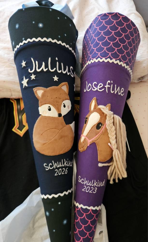 Jede Schultüte wird mit einem gestickten Motiv und dem Namen deines Kindes individuell gestaltet. Auf Wunsch fügen wir auch das Datum des ersten Schultages hinzu.