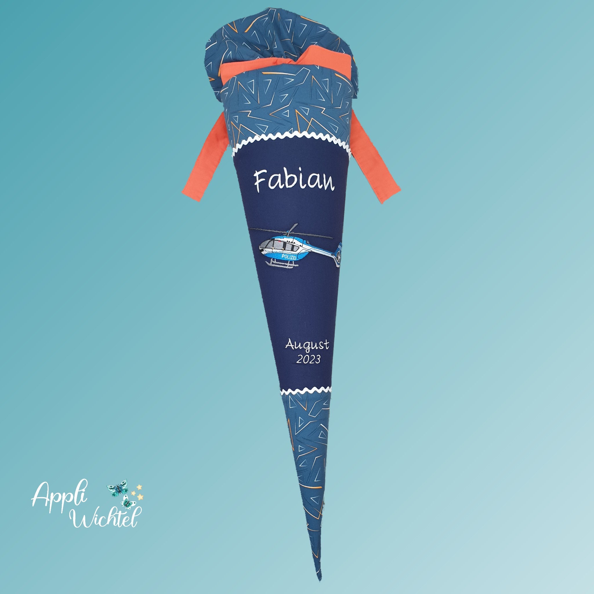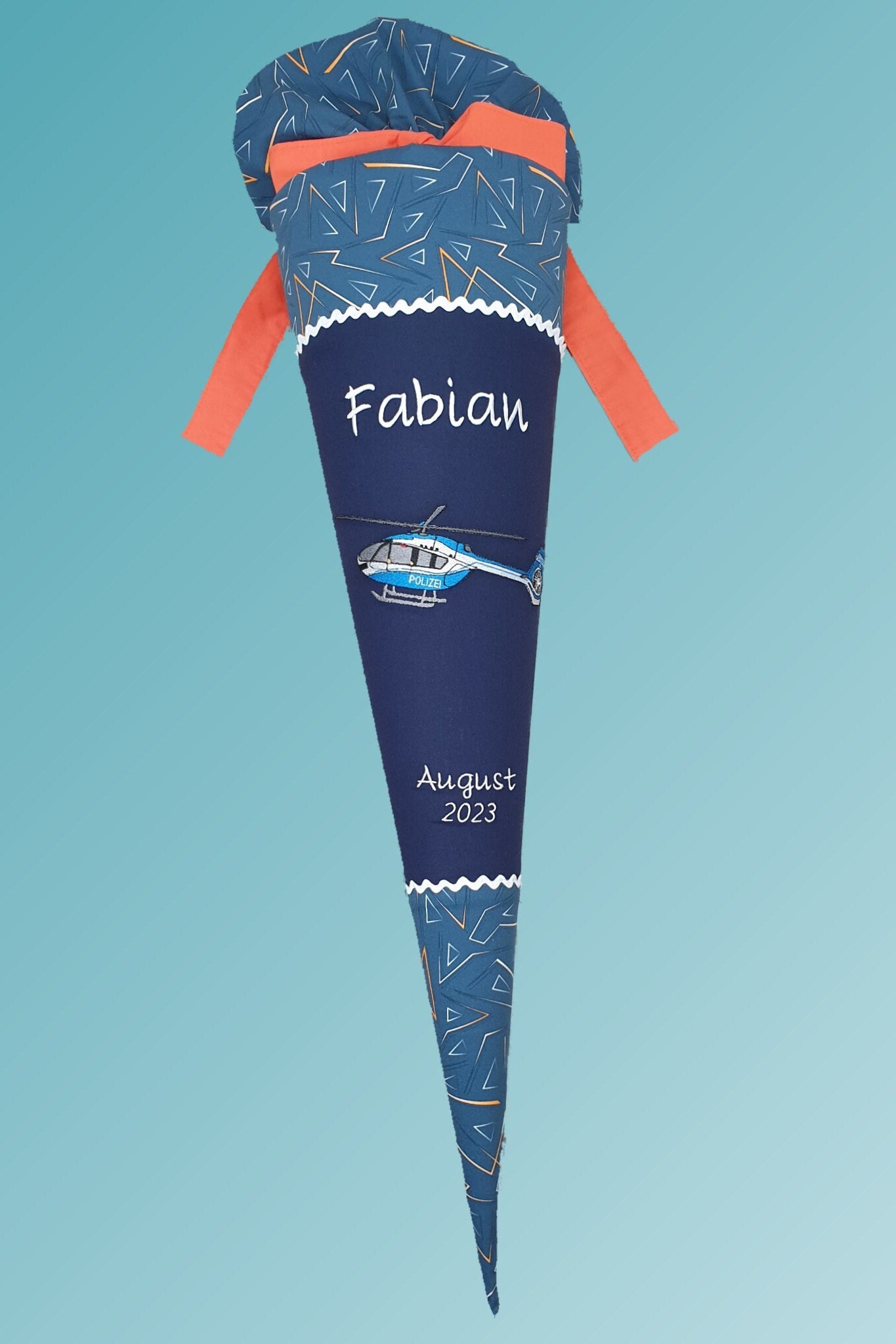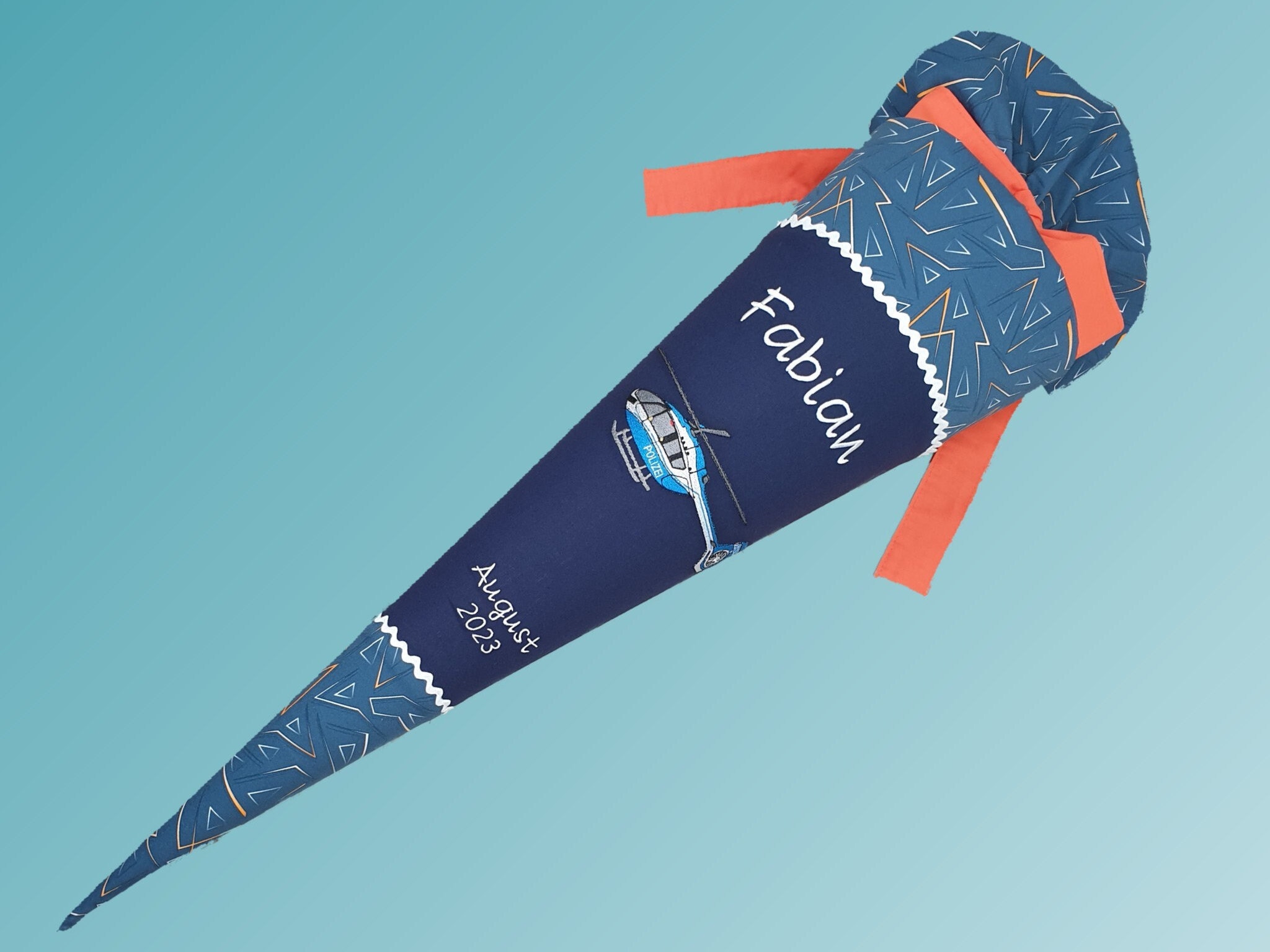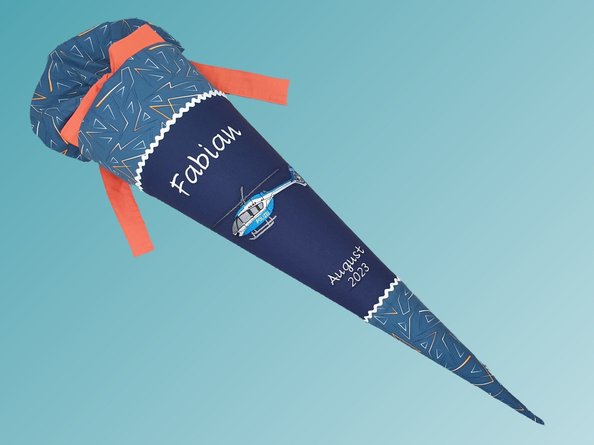 Schultüte mit Polizei Hubschrauber und Namen farblich auf den Step by Step Helicopter Sam Schulranzen abgestimmt.