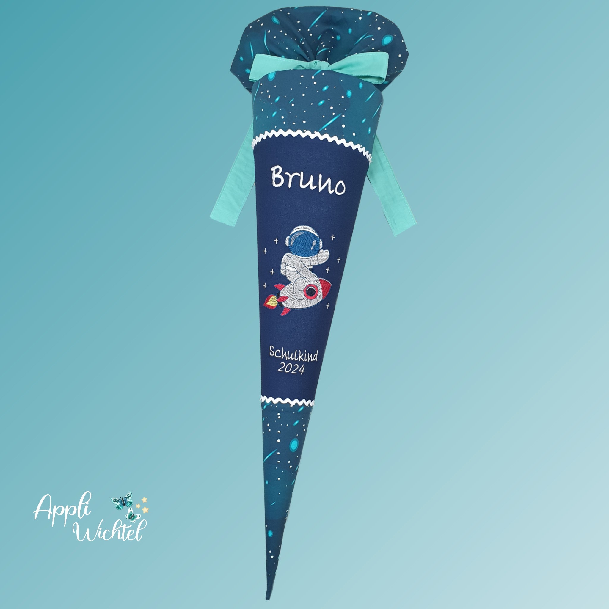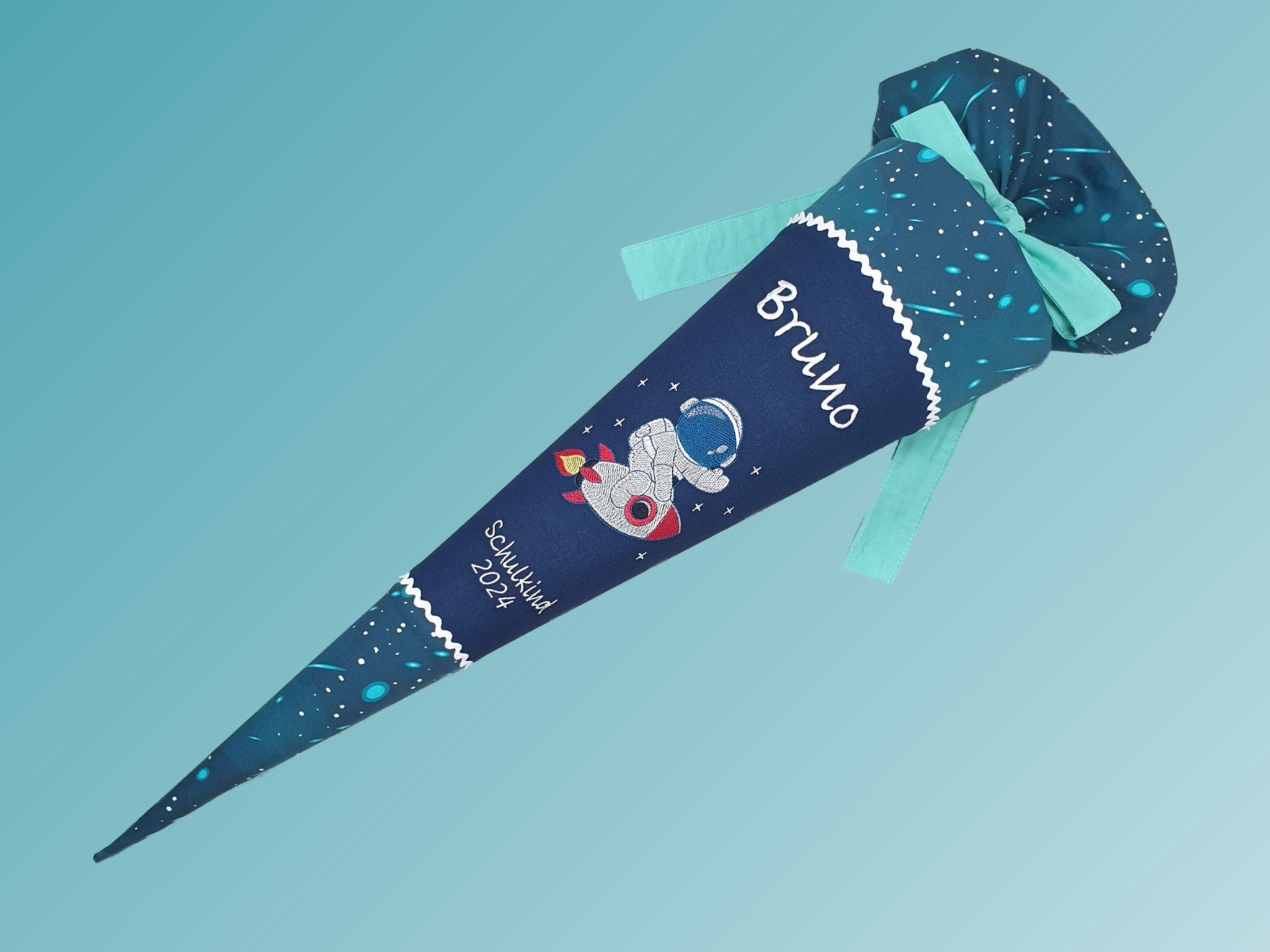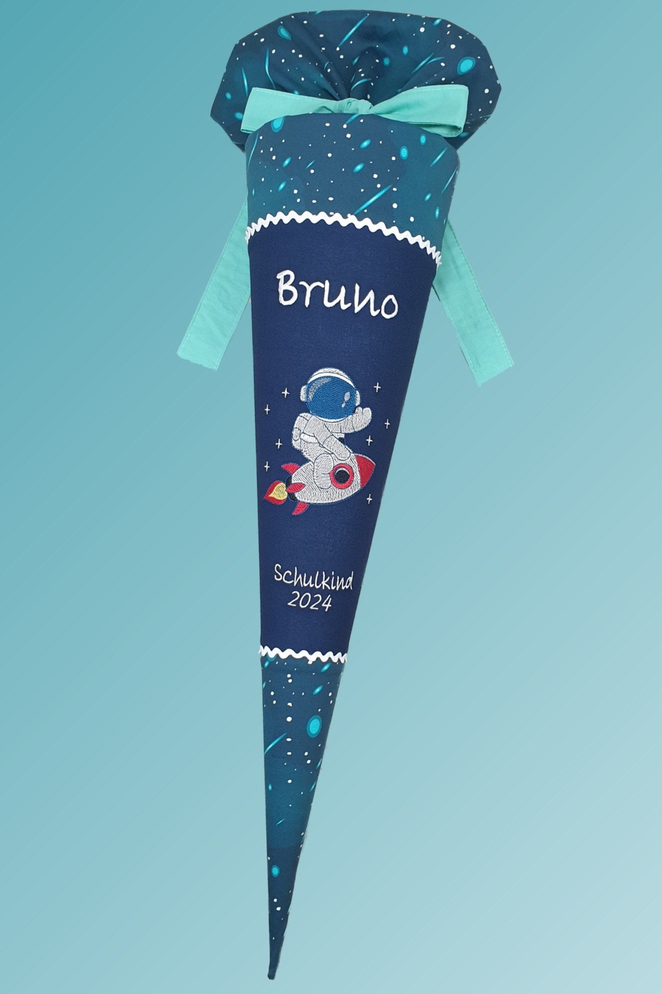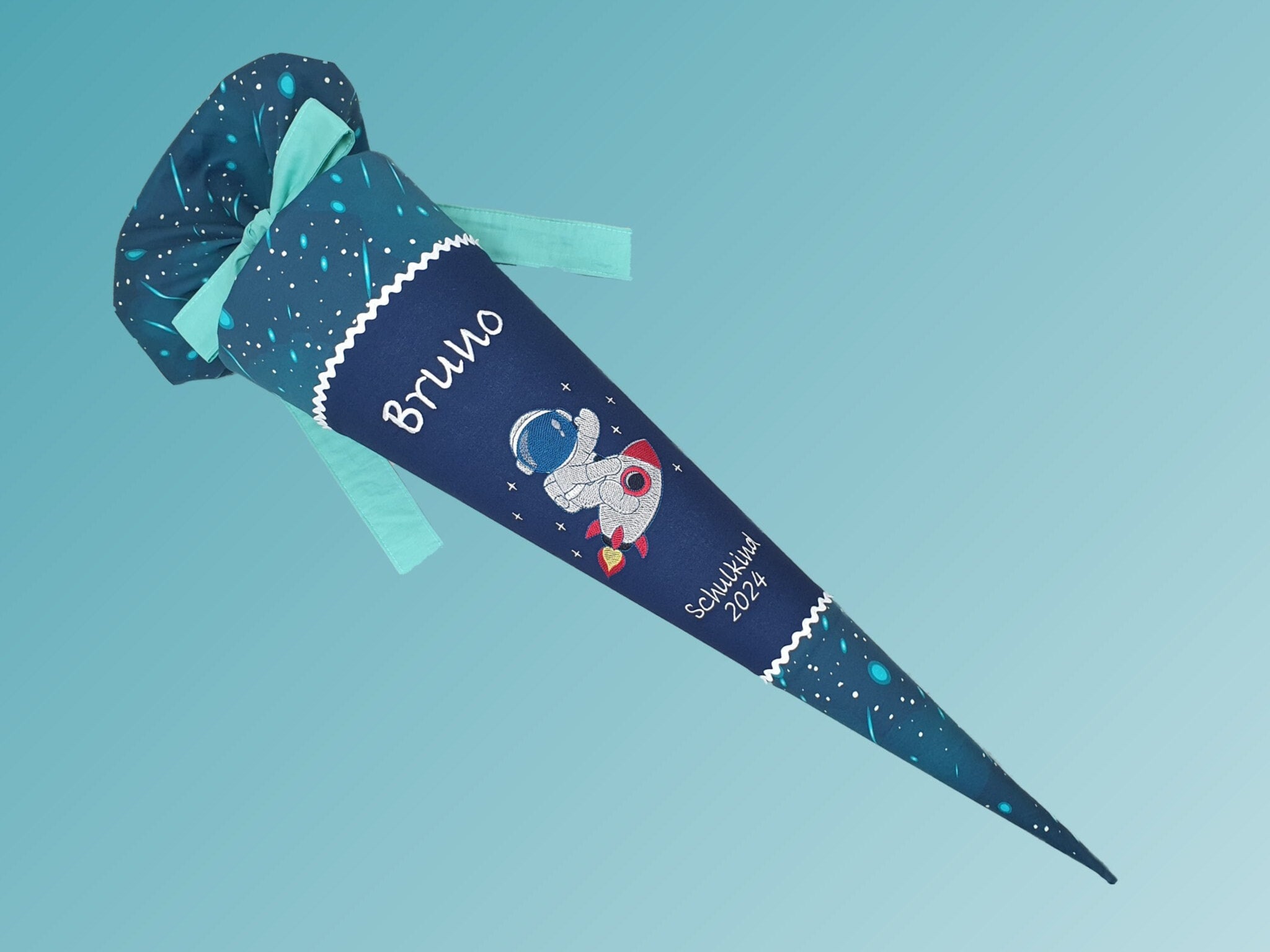 Schultüte mit Astonaut auf einer Rakete im Weltall und Namen farblich auf den Ergobag RaumfahrBär Schulranzen abgestimmt.