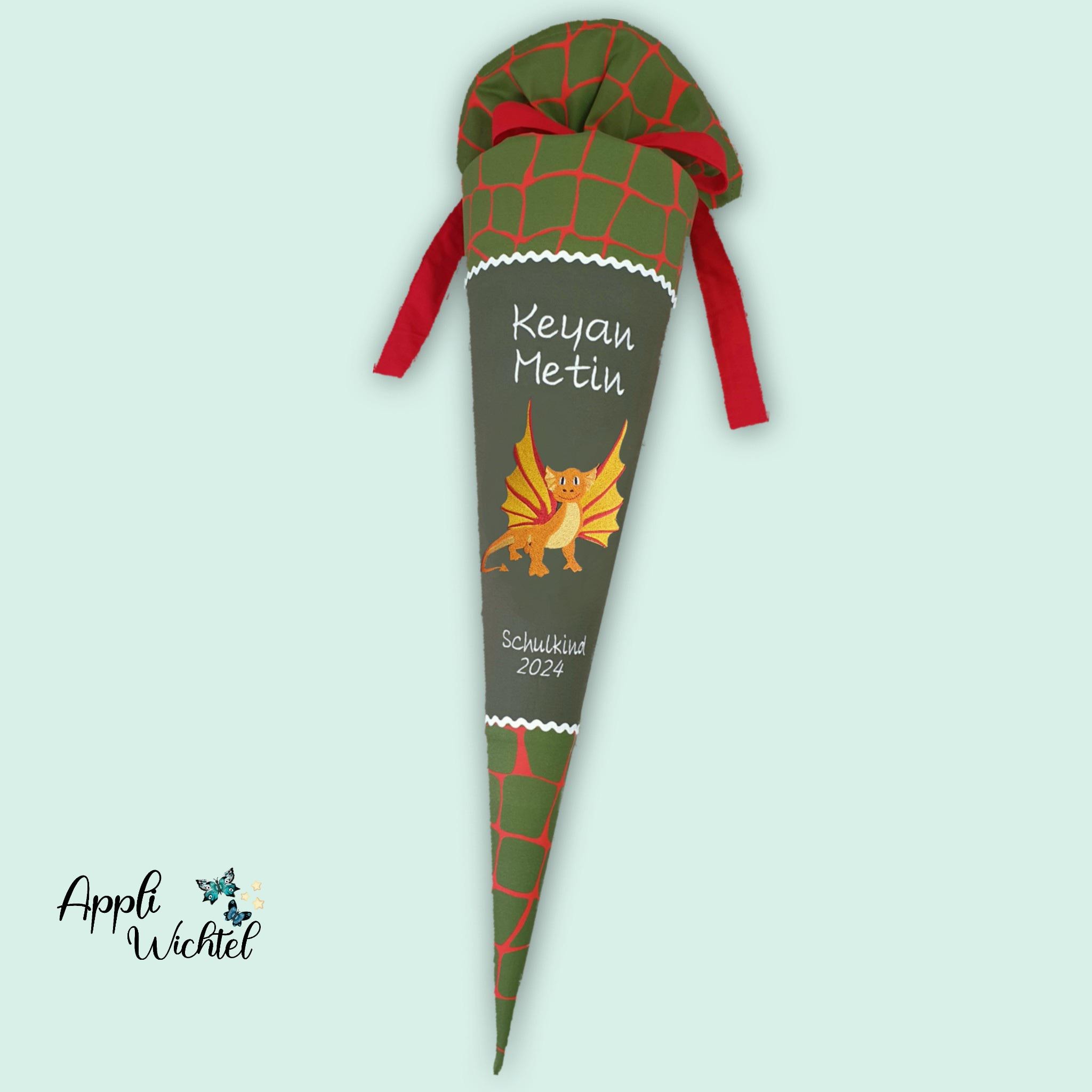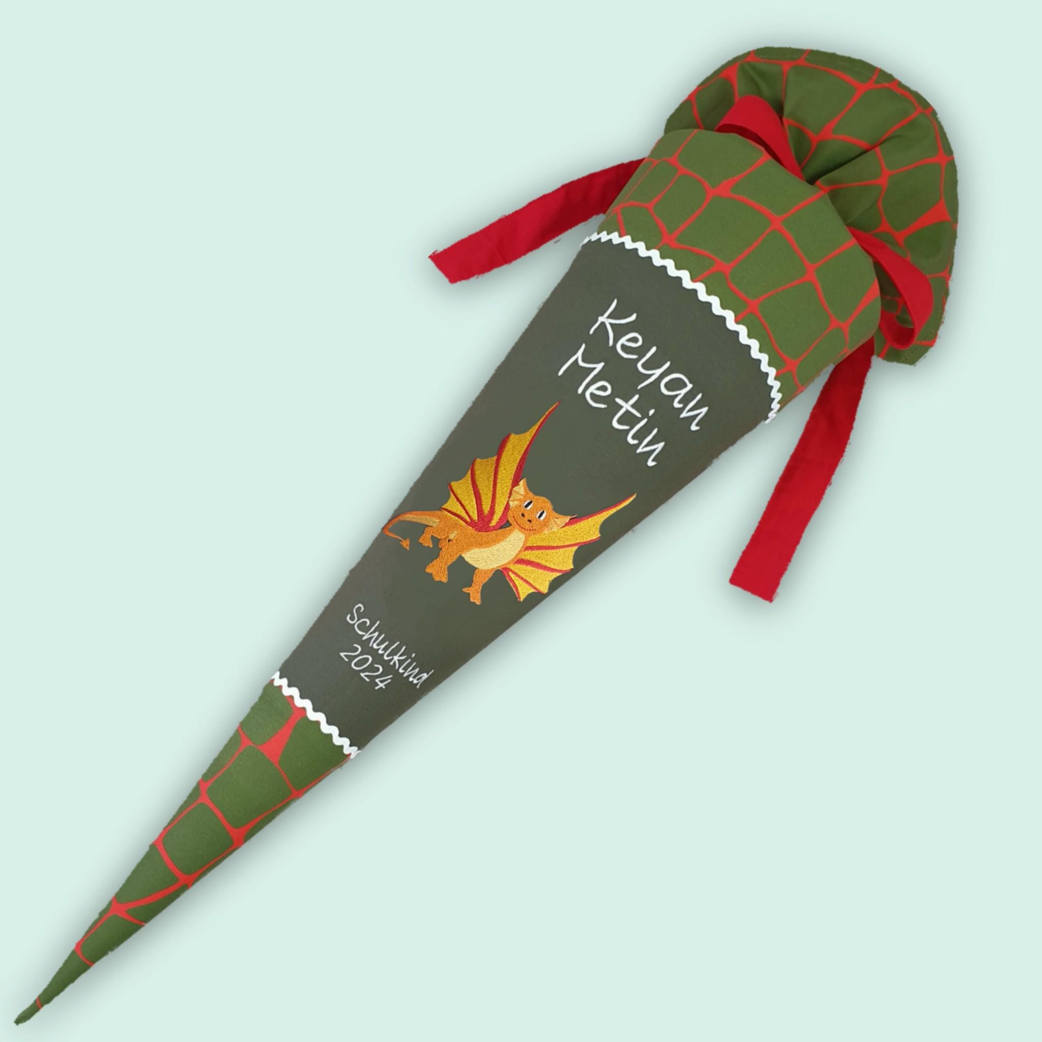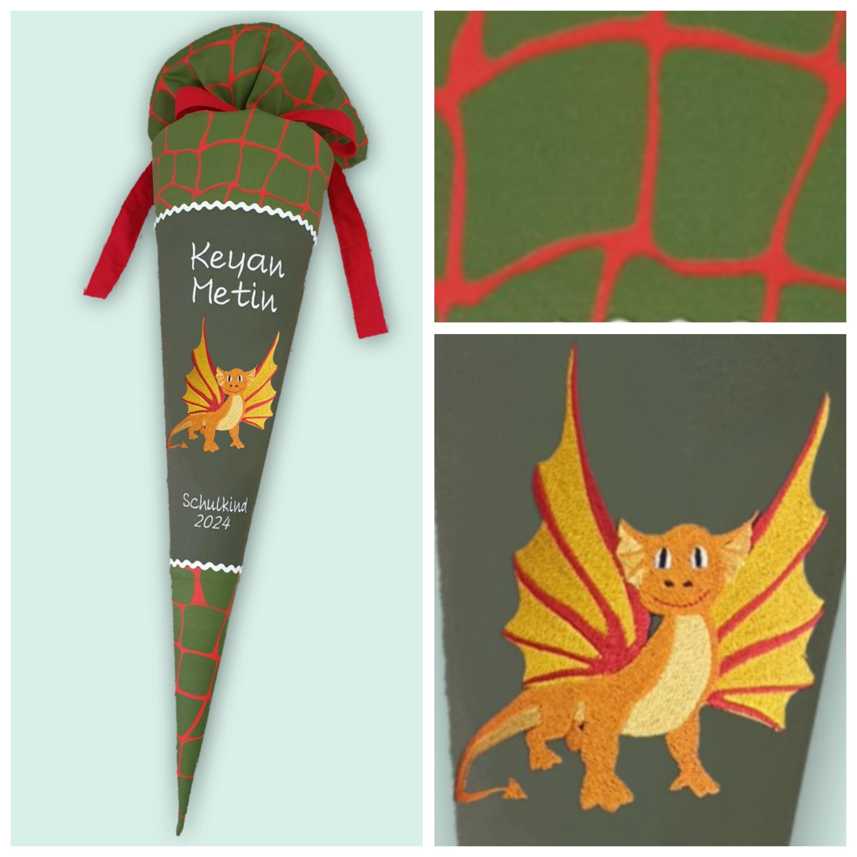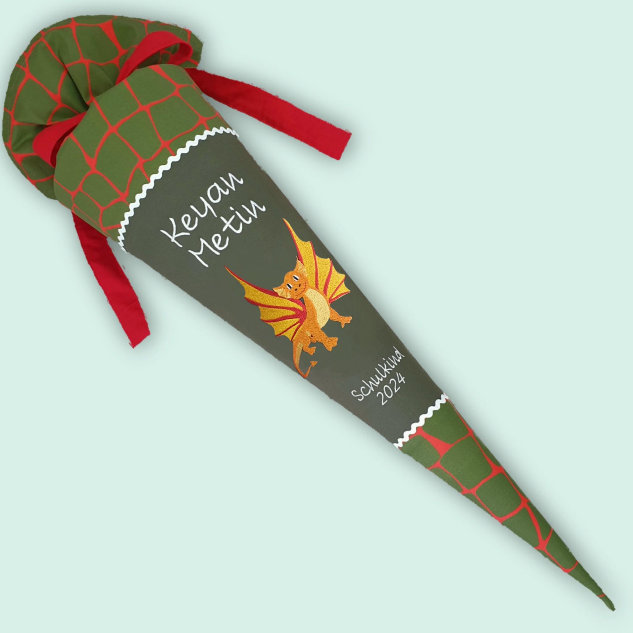 Schultüte mit Drachen und Namen farblich auf den Ergobag FeuerspeiBär Schulranzen abgestimmt.
