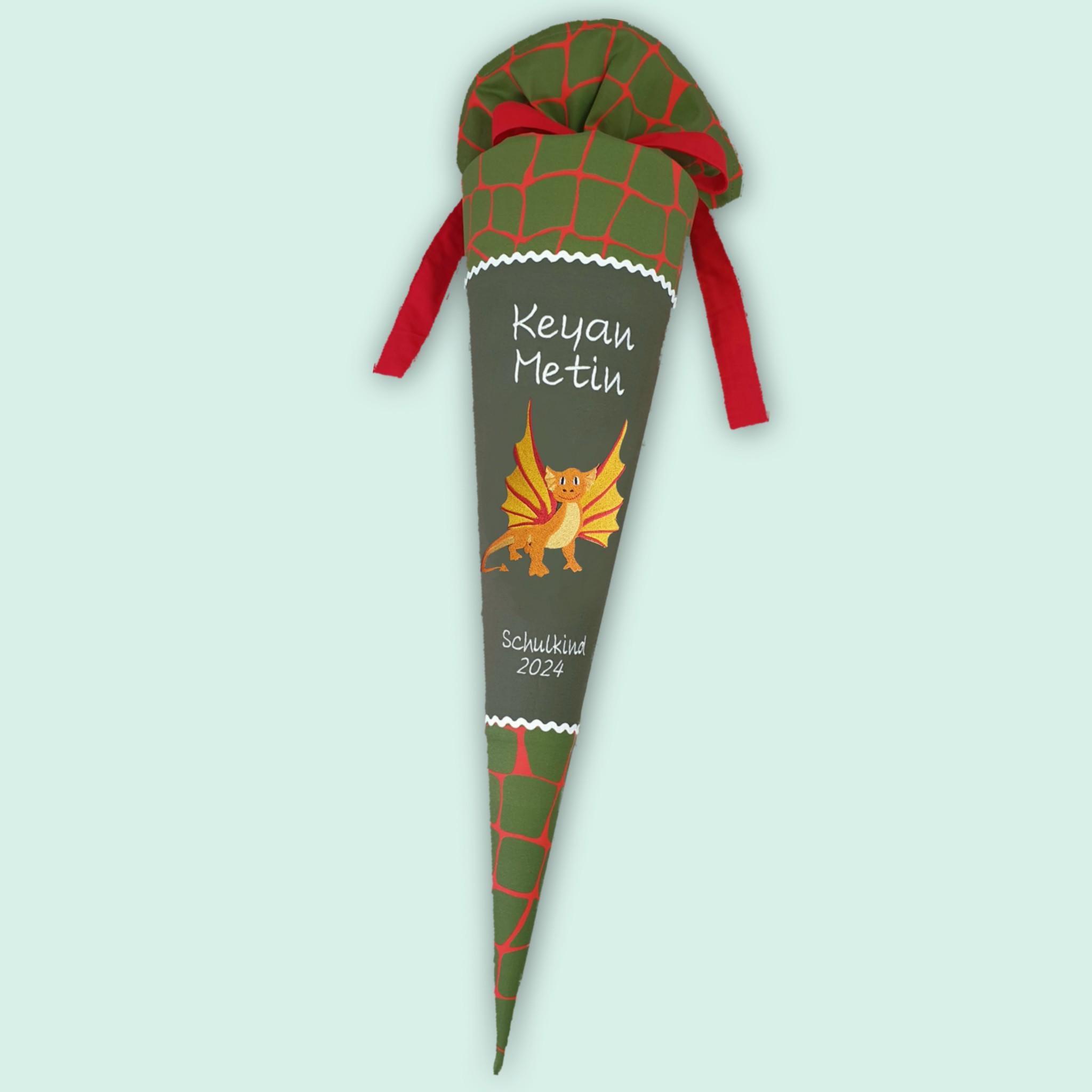 Jede Schultüte wird mit einem gestickten Motiv und dem Namen deines Kindes individuell gestaltet. Auf Wunsch fügen wir auch das Datum des ersten Schultages hinzu.