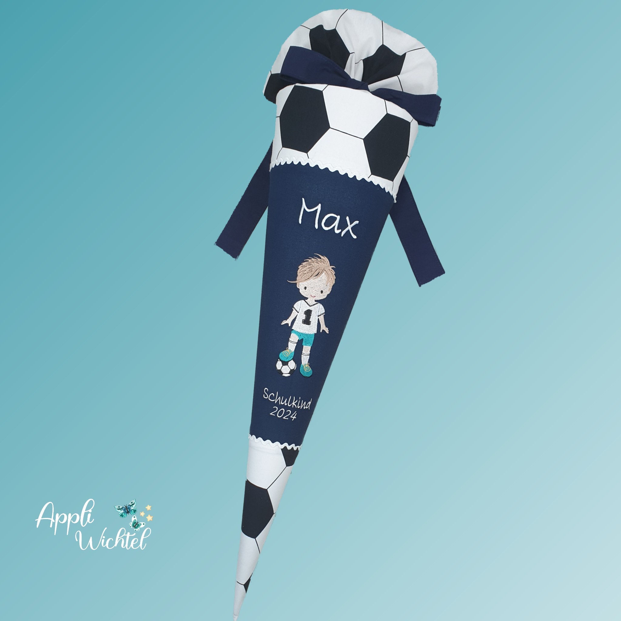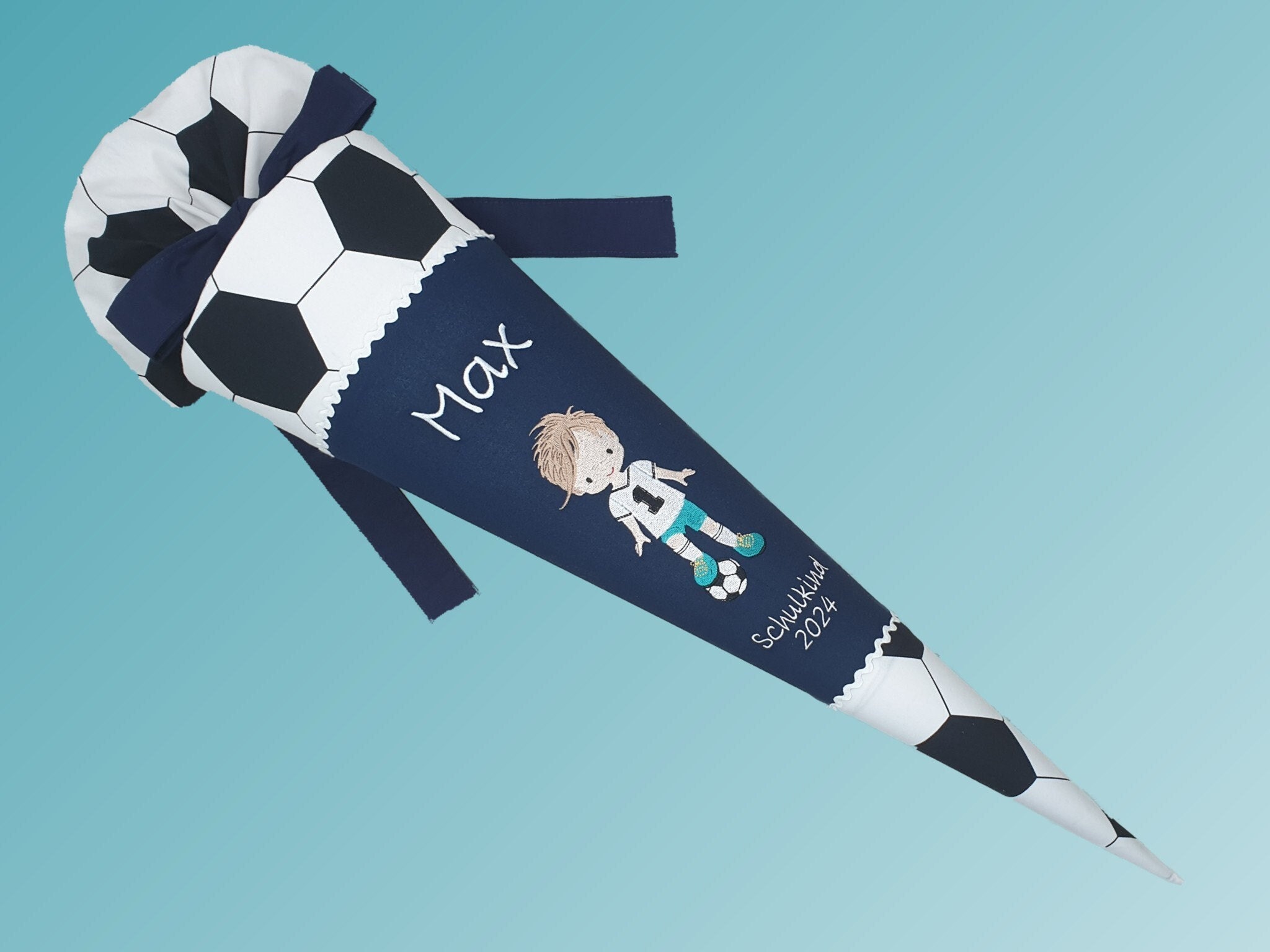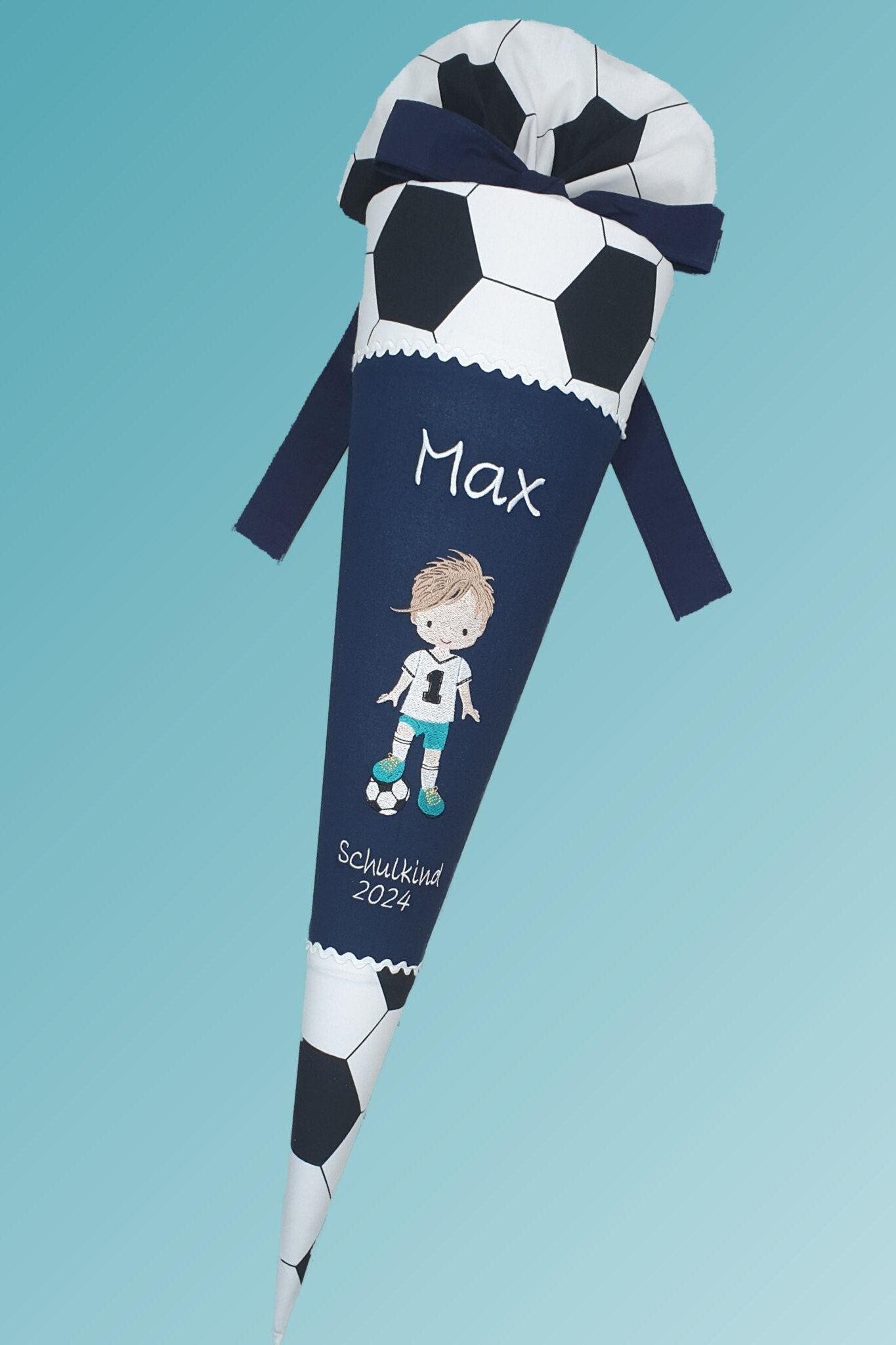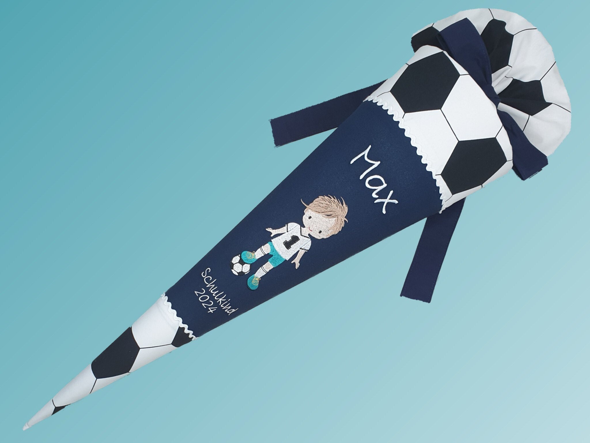 Schultüte mit Fussballer und Namen in der Farbe Dunkelblau.