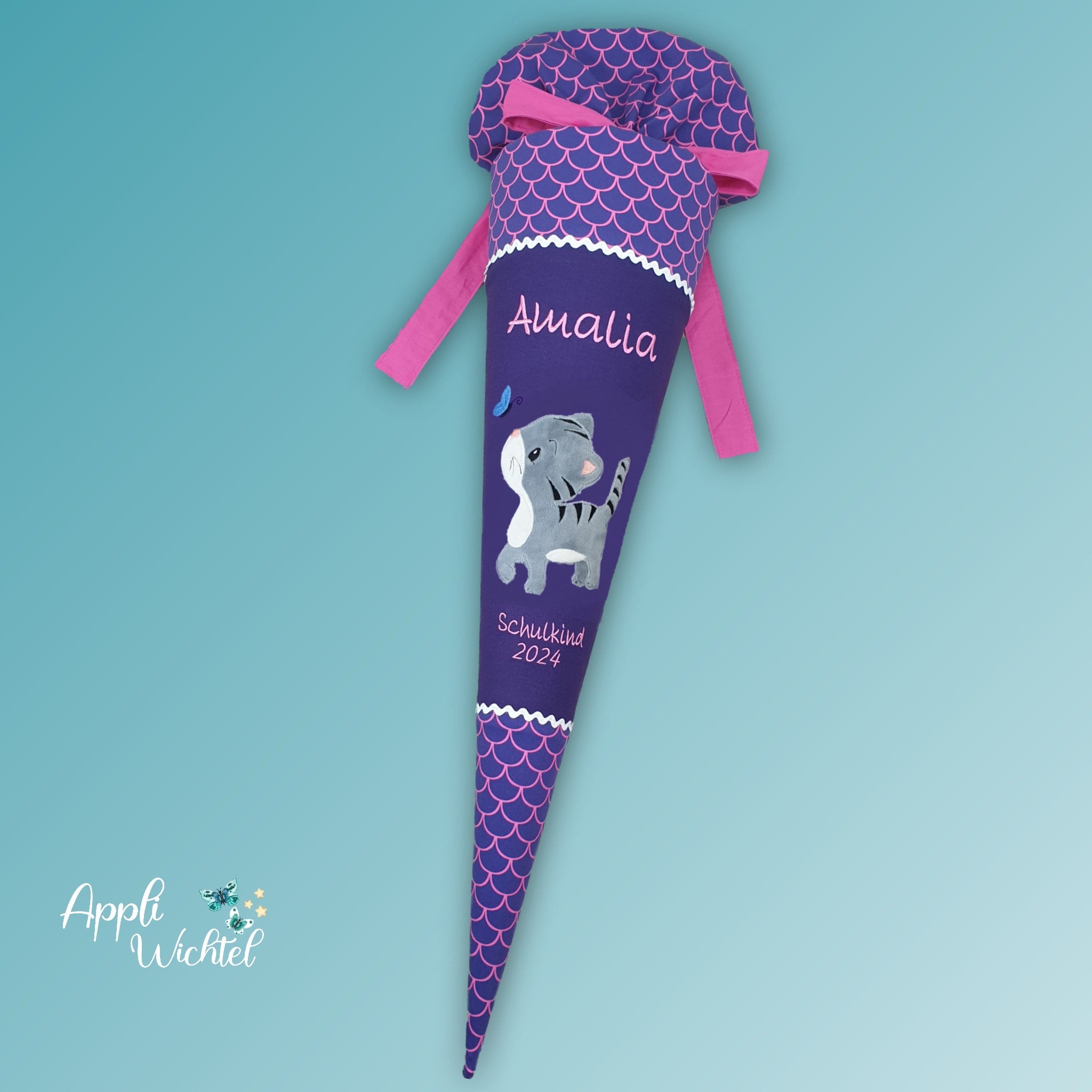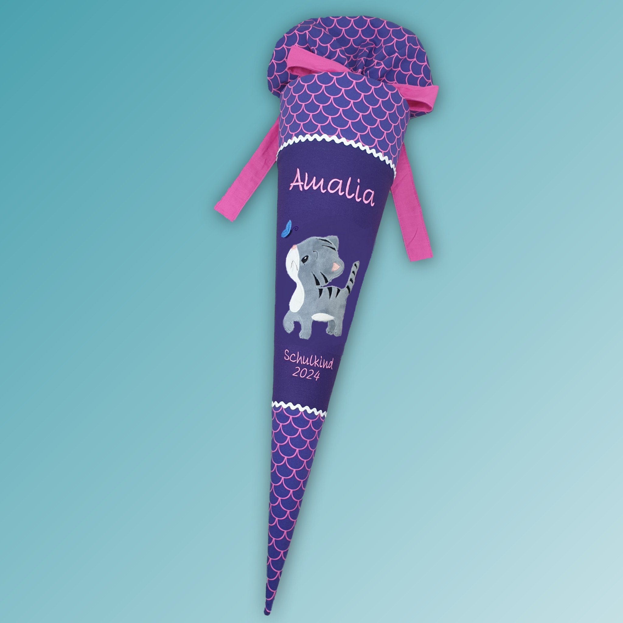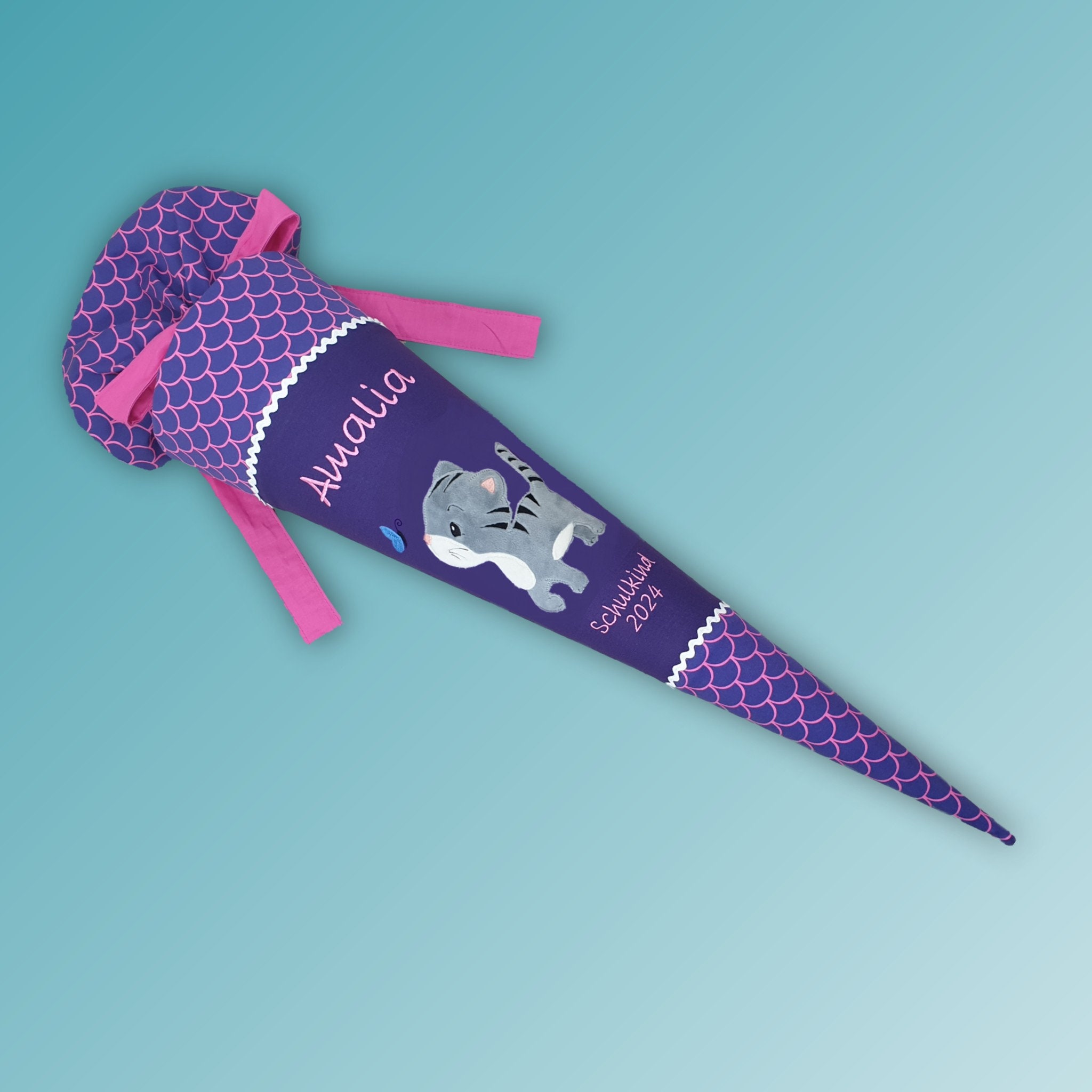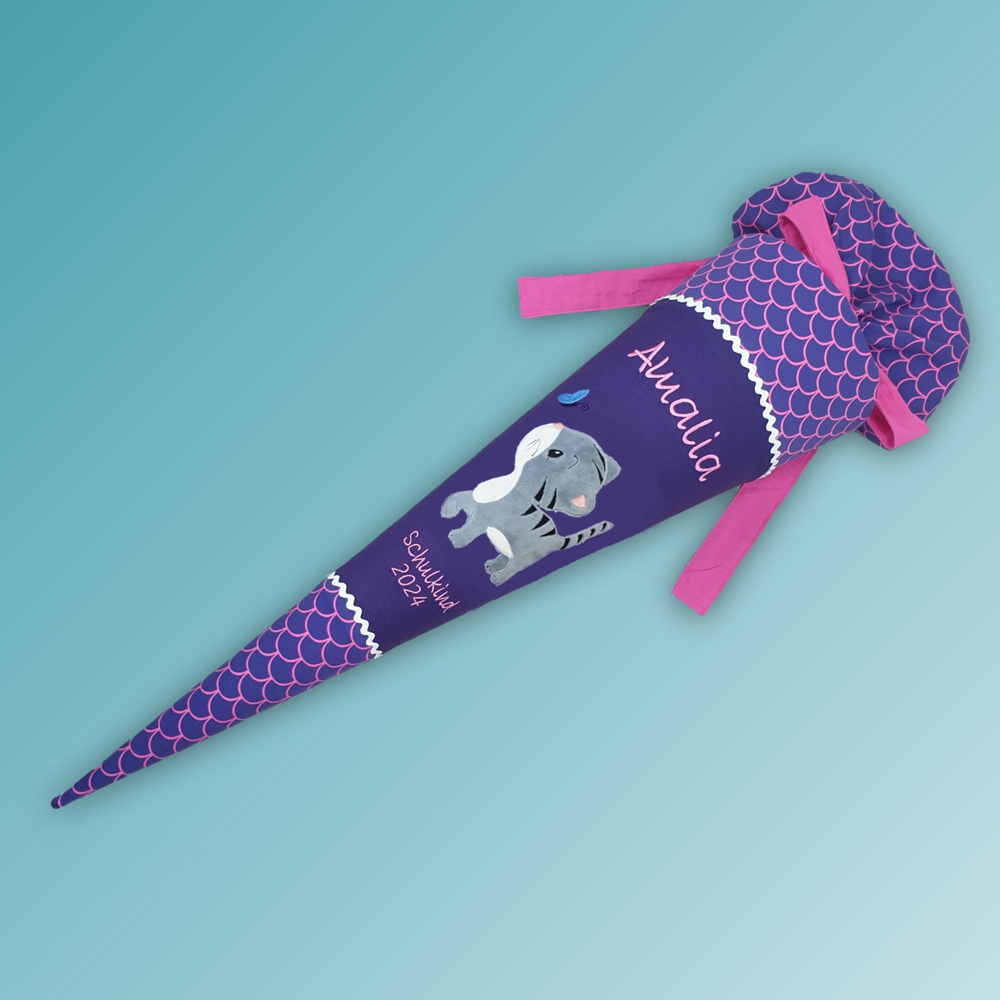 Schultüte mit Katze und Namen farblich auf den Ergobag Perlentauchbär Schulranzen abgestimmt.