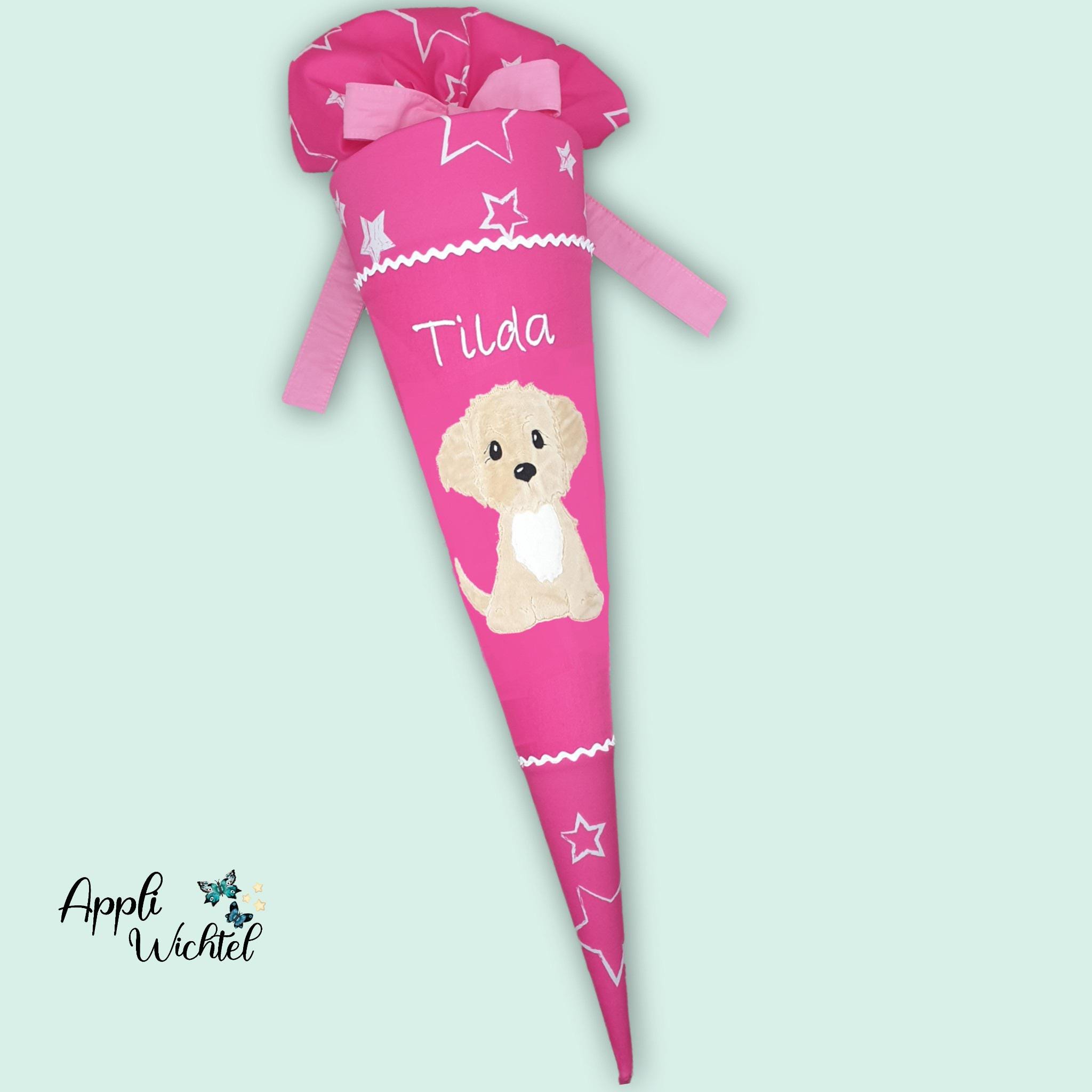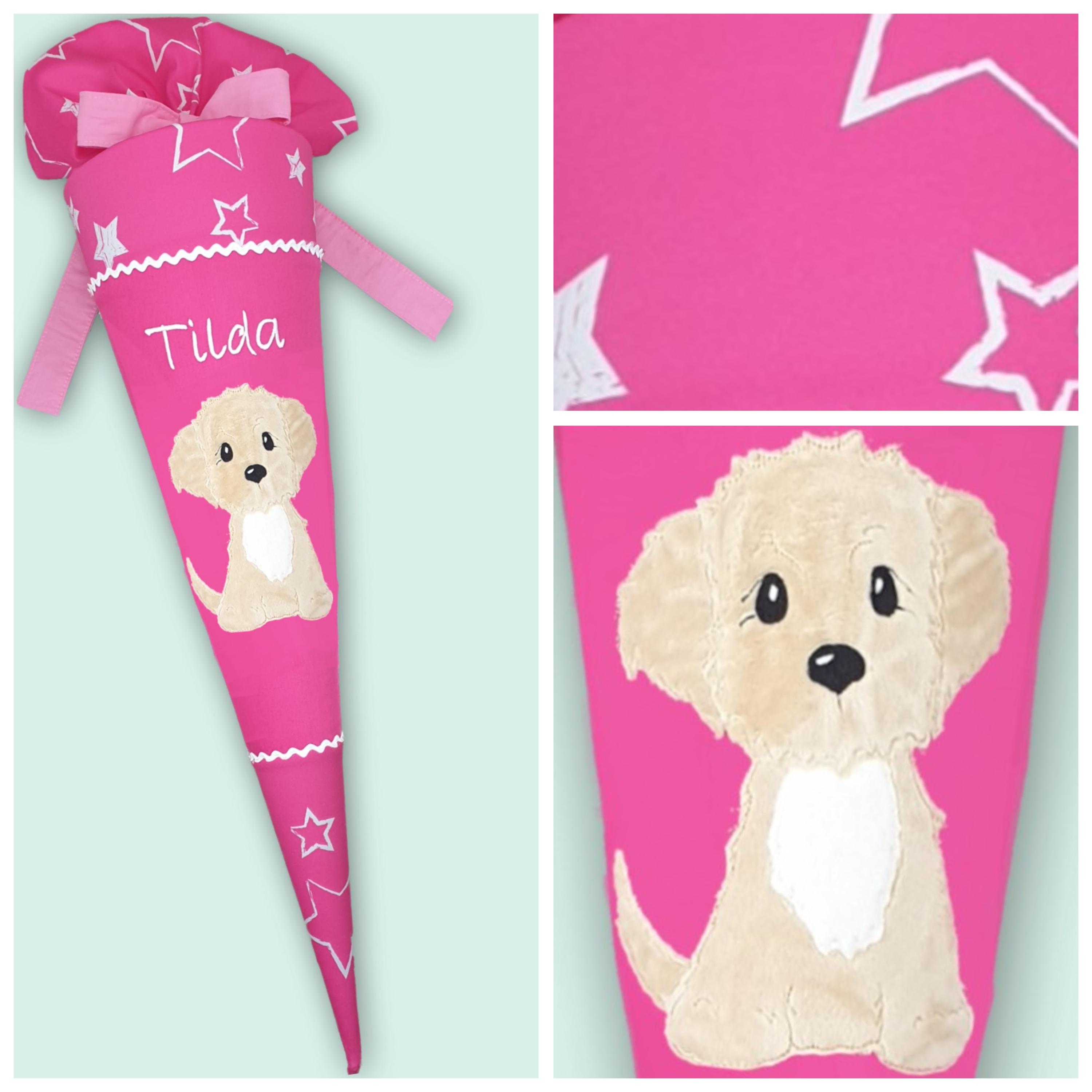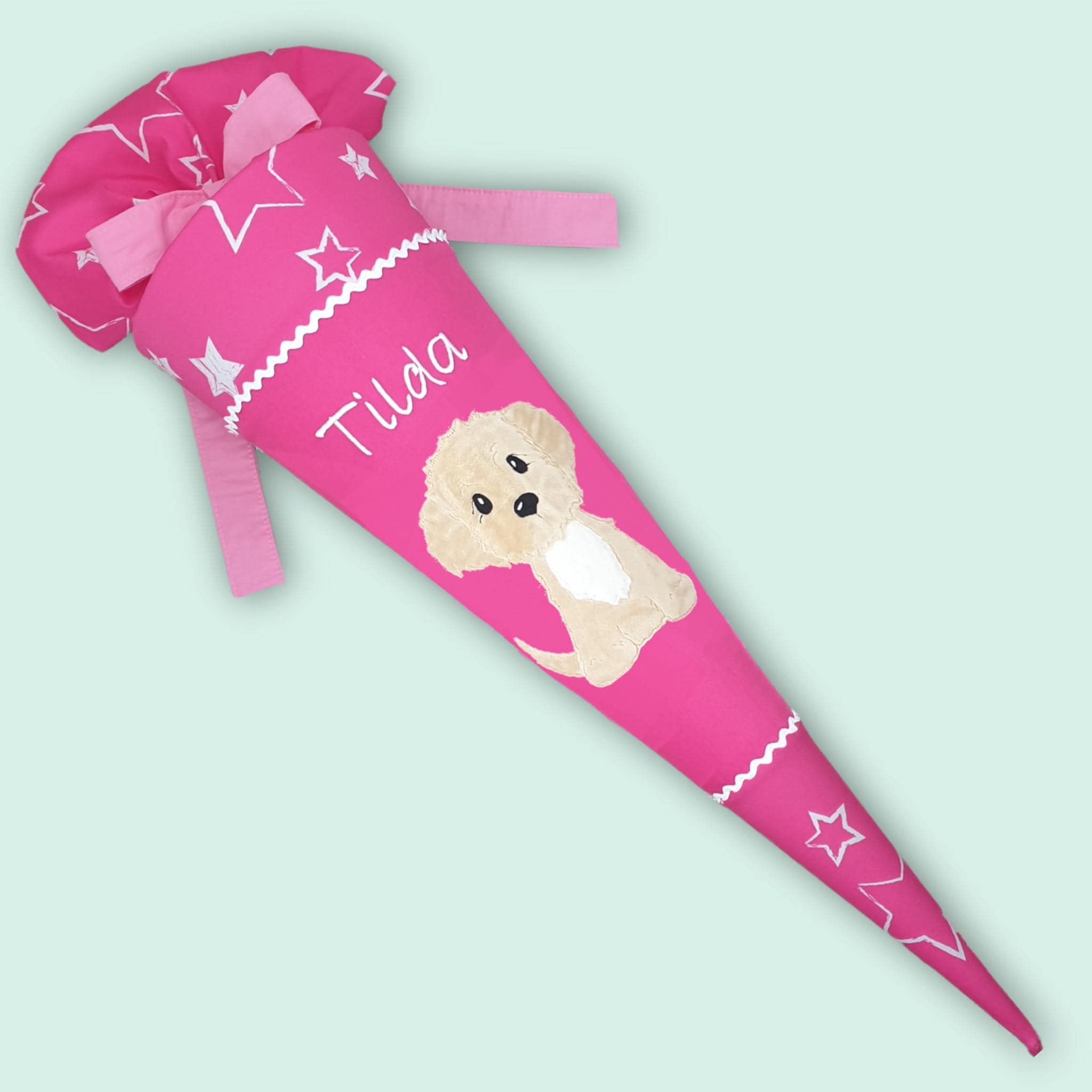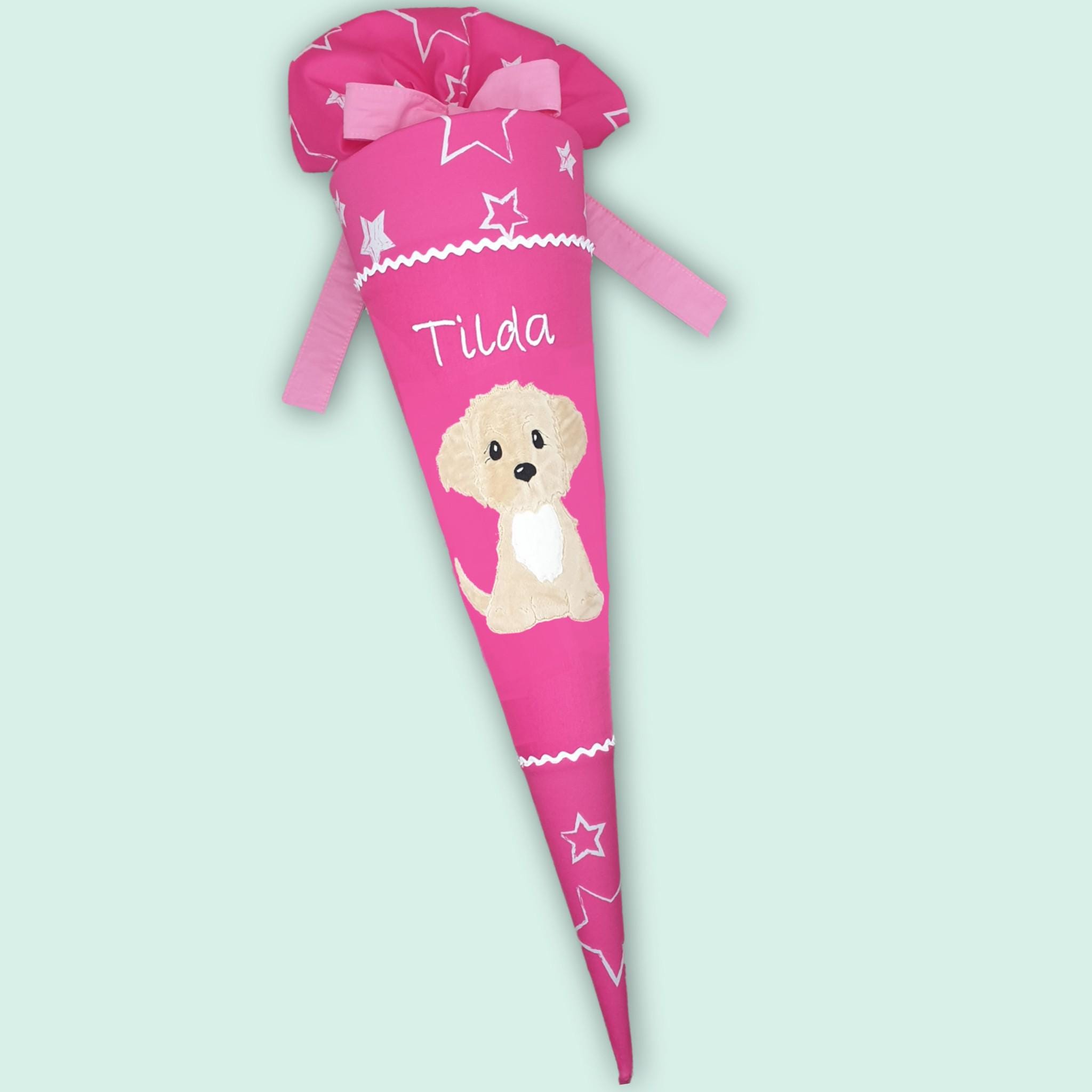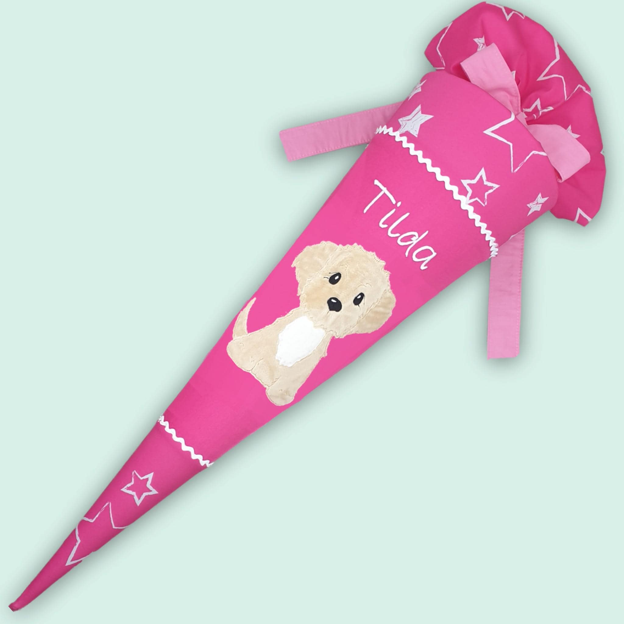 Schultüte mit Hund und Namen farblich auf den Ergobag Sternenzaubär Schulranzen abgestimmt.