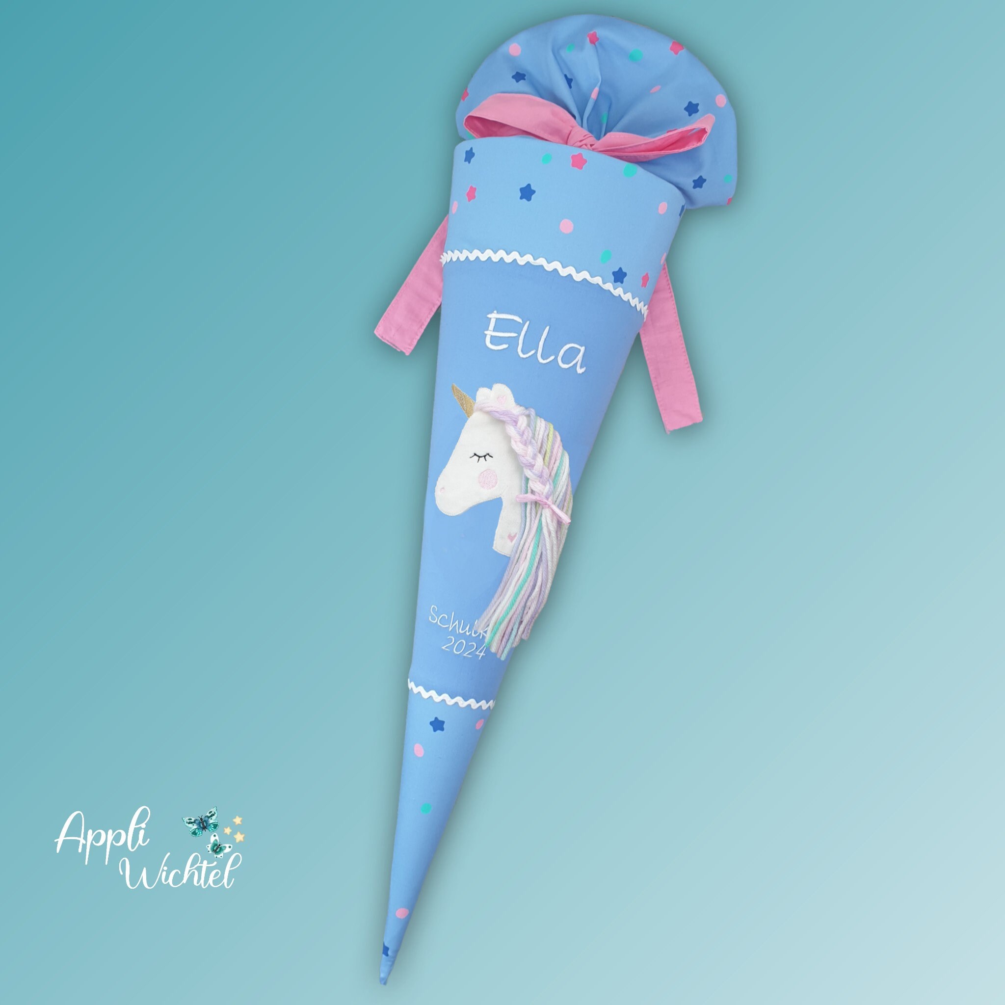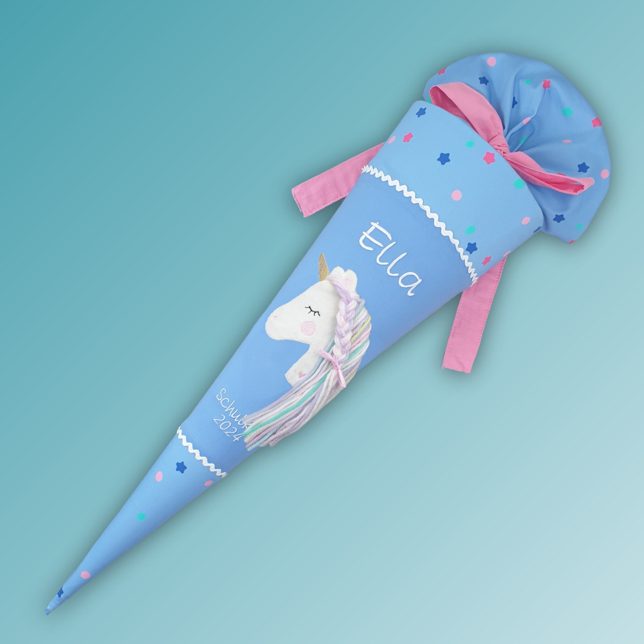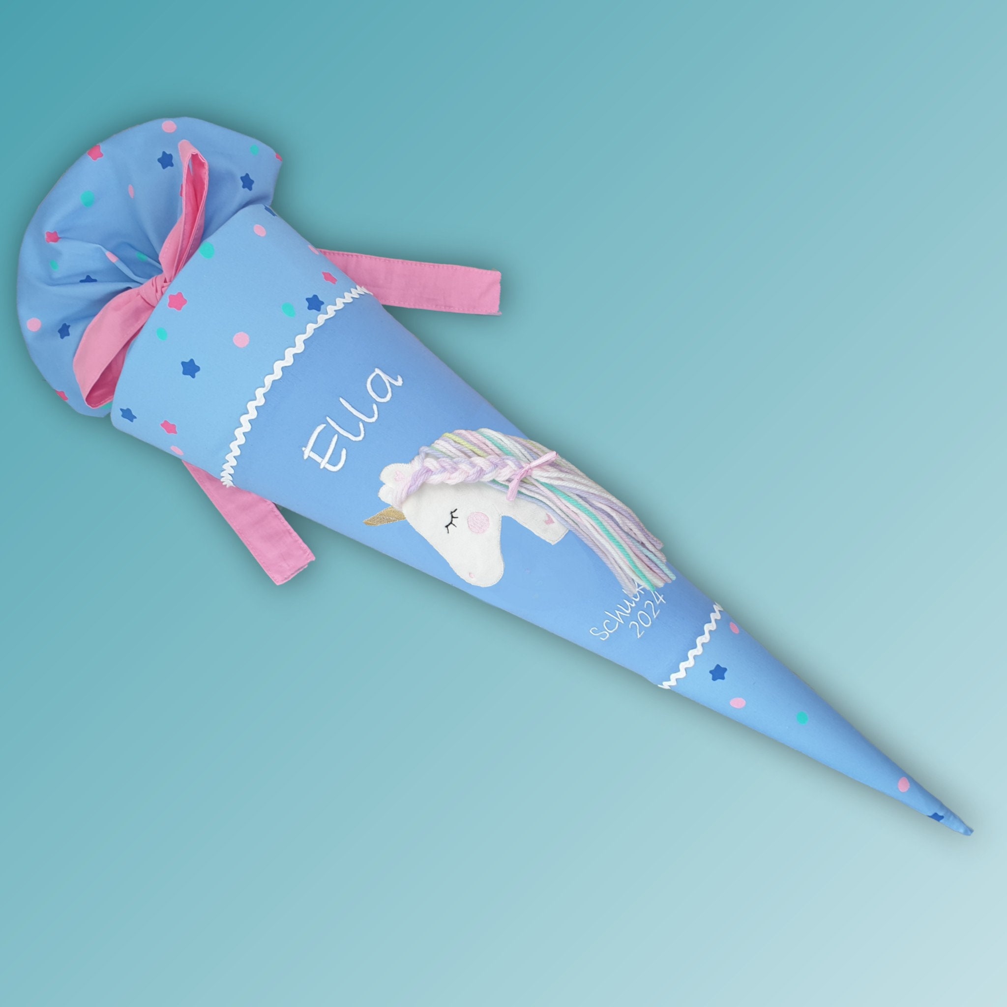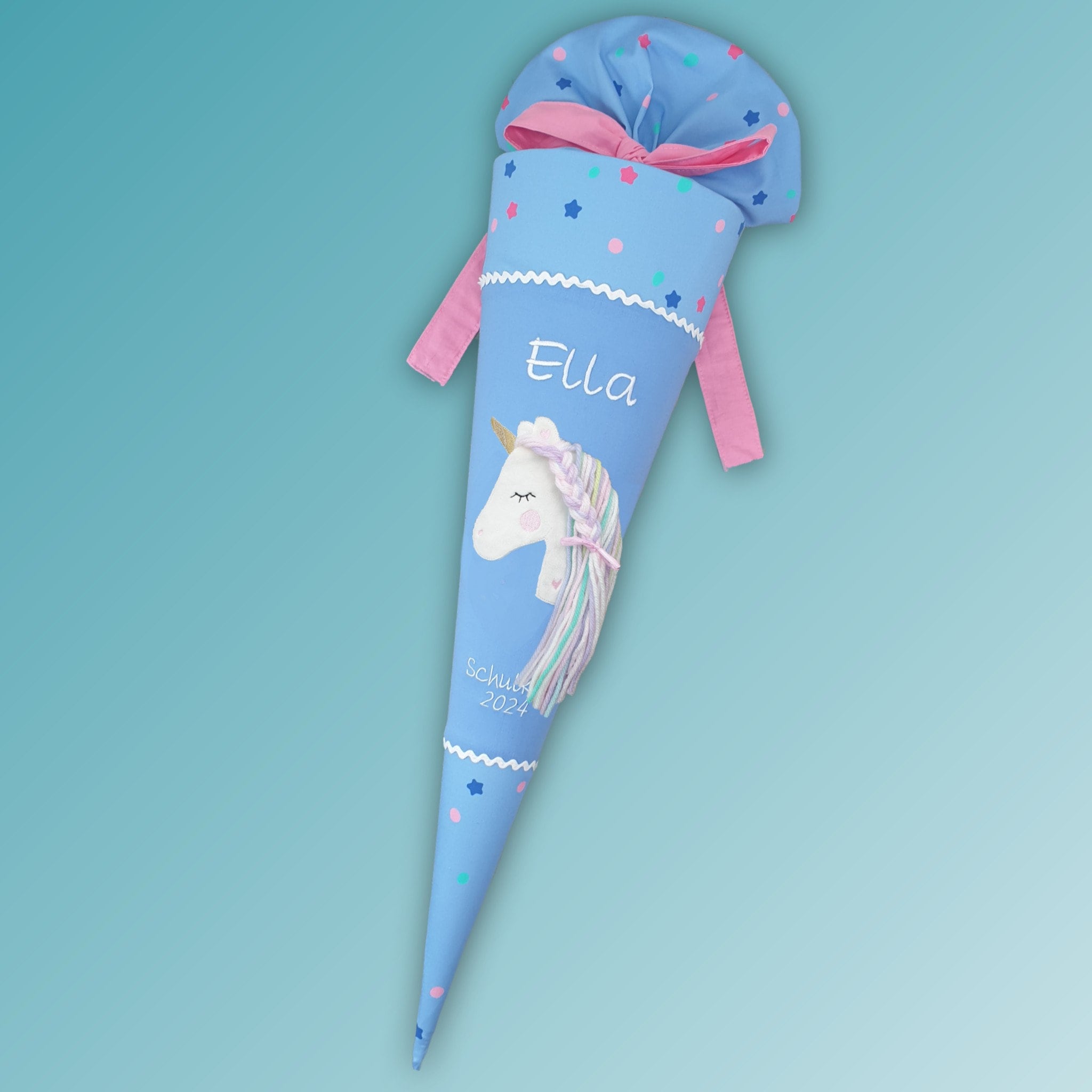 Schultüte mit Einhorn und Namen farblich auf den Ergobag Bärzaubernd Schulranzen abgestimmt.