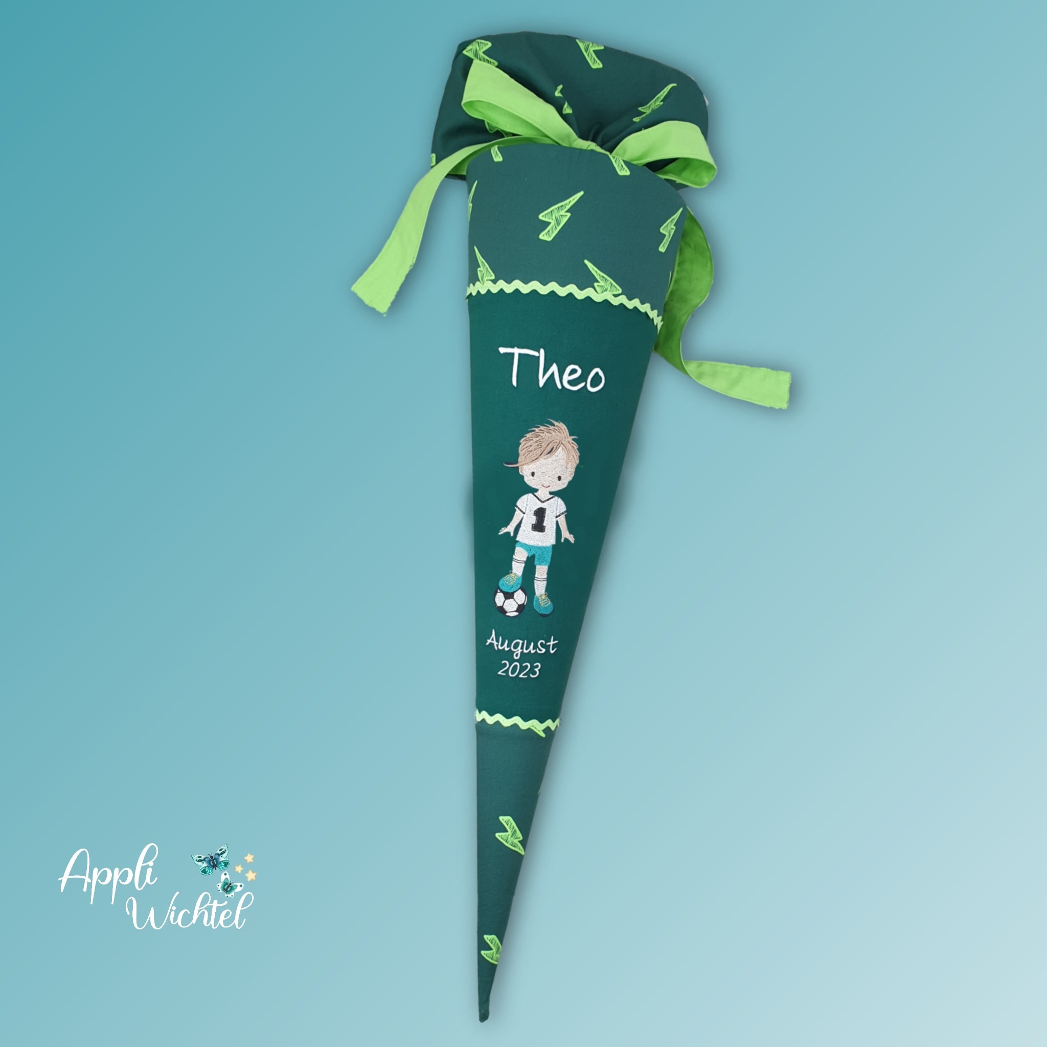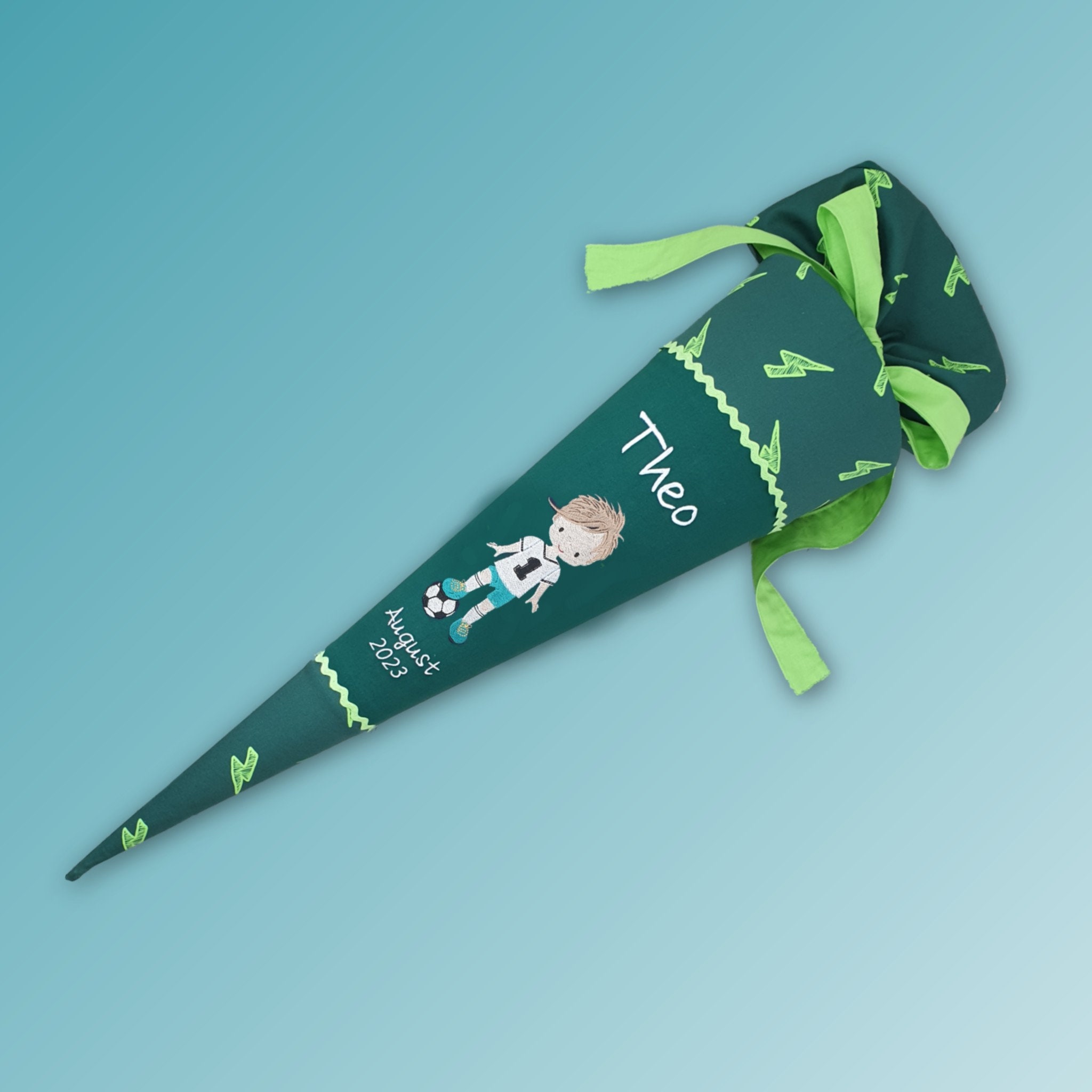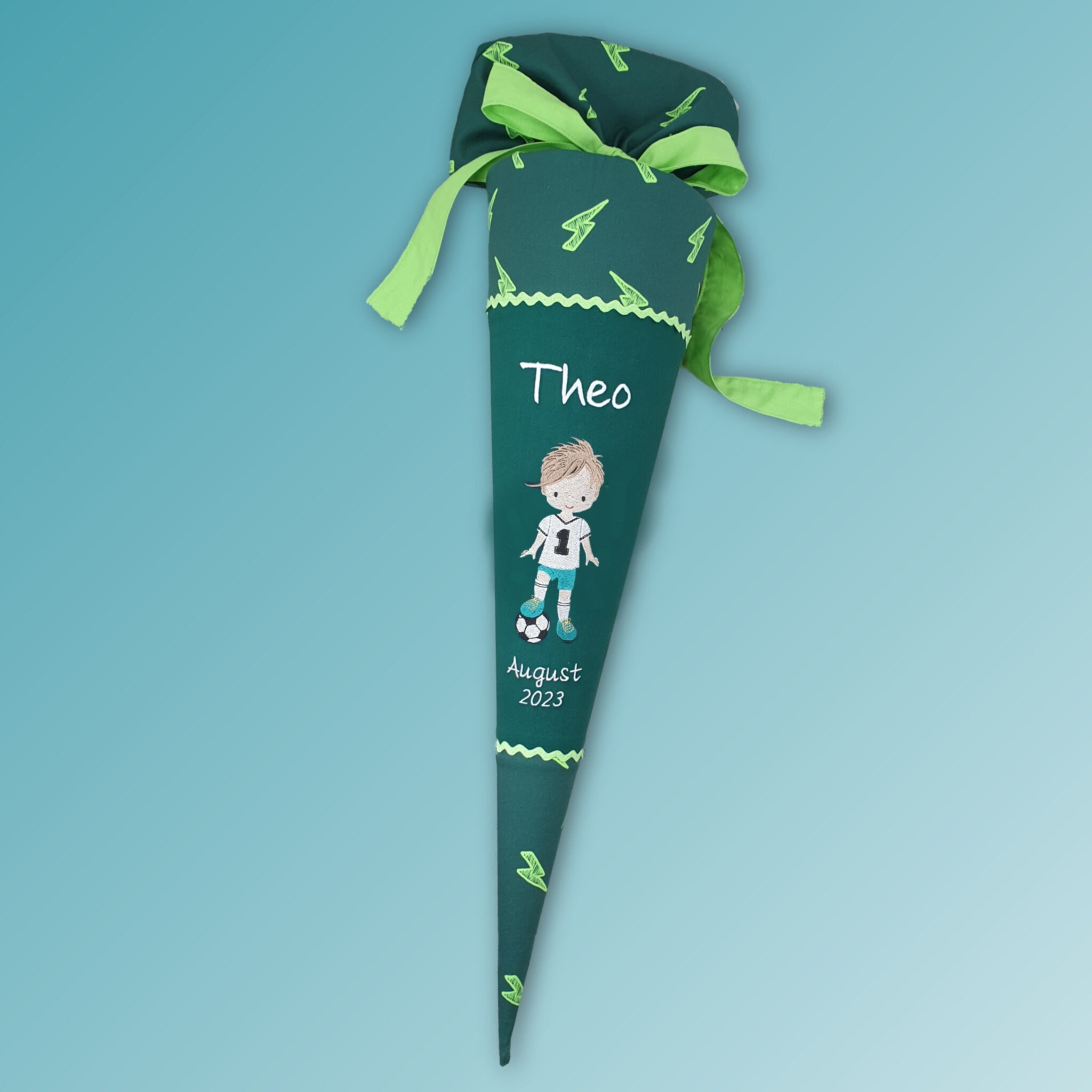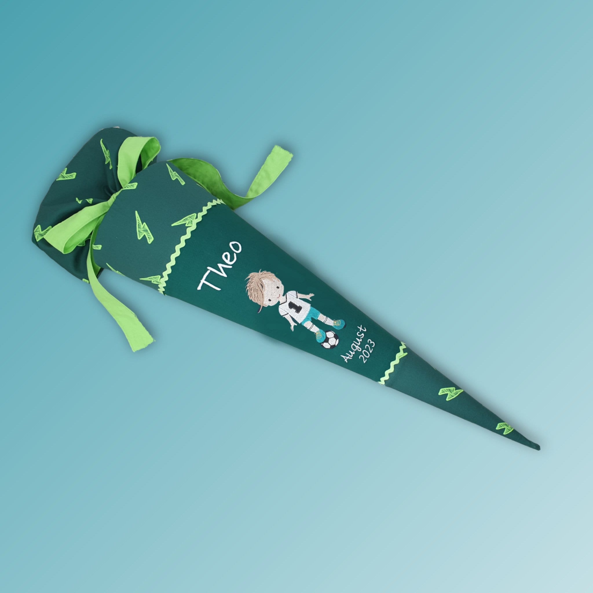 Schultüte mit Fusballer und Namen farblich auf den Ergobag Bärtastisch Schulranzen abgestimmt.