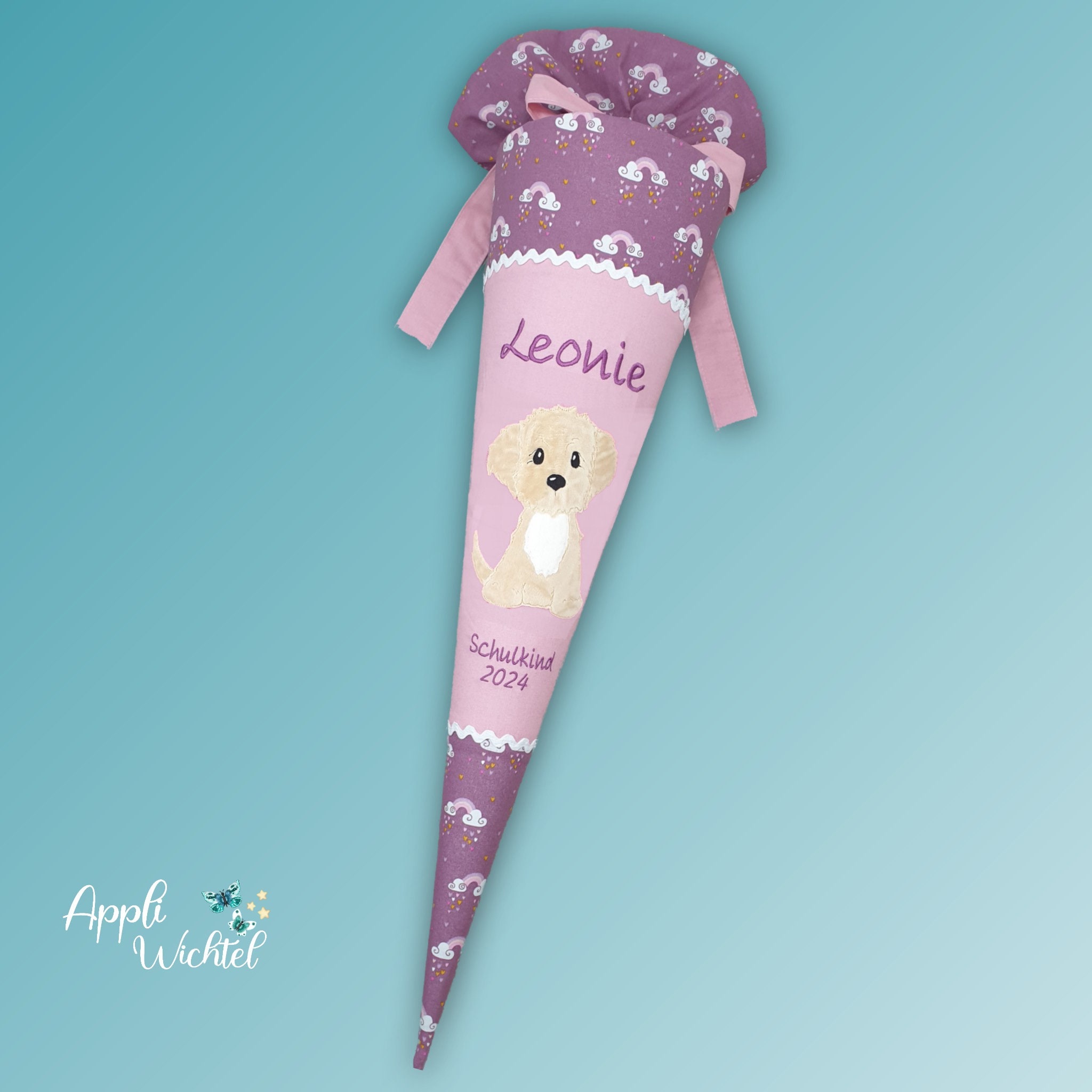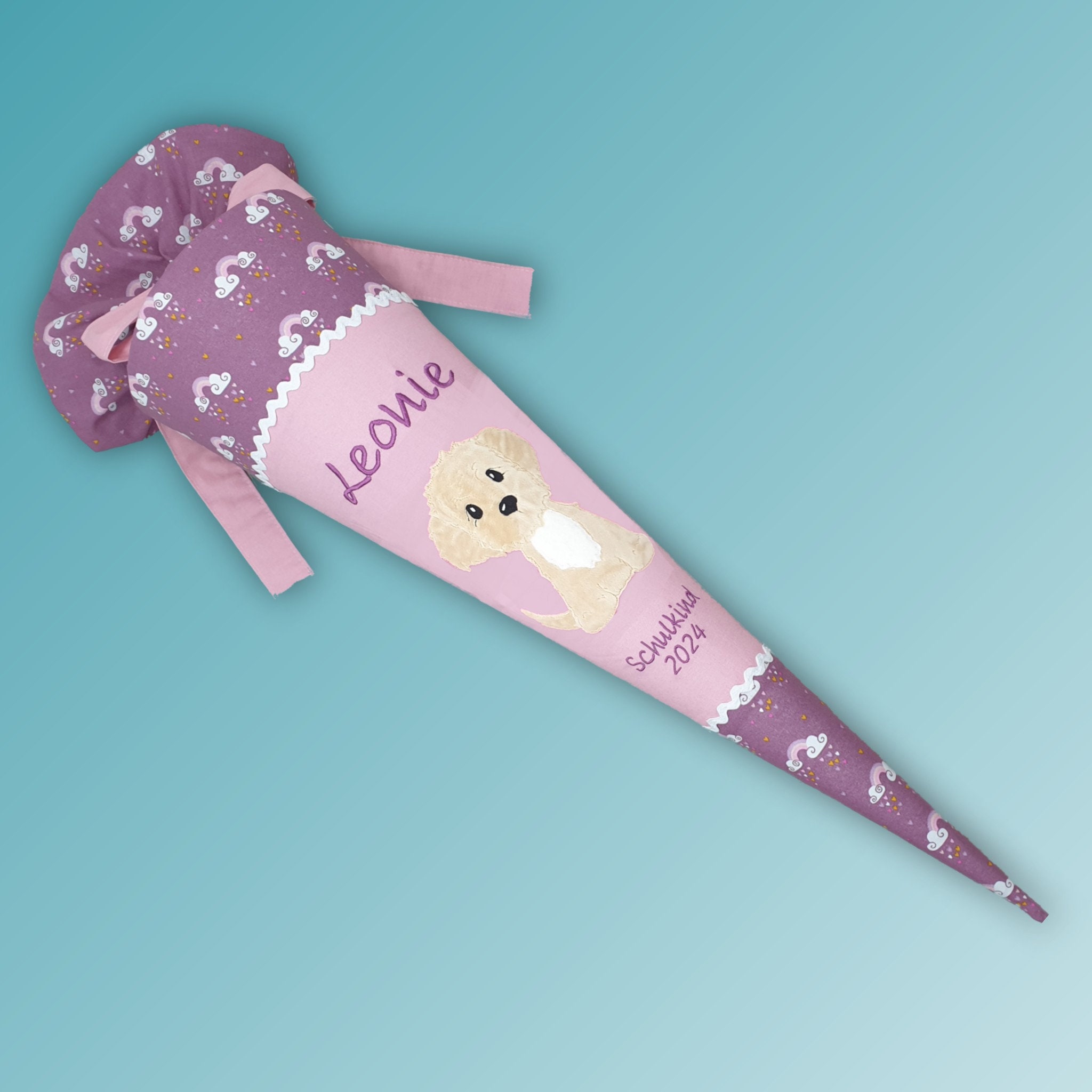 Jede Schultüte wird mit einem gestickten Motiv und dem Namen deines Kindes individuell gestaltet. Auf Wunsch fügen wir auch das Datum des ersten Schultages hinzu.