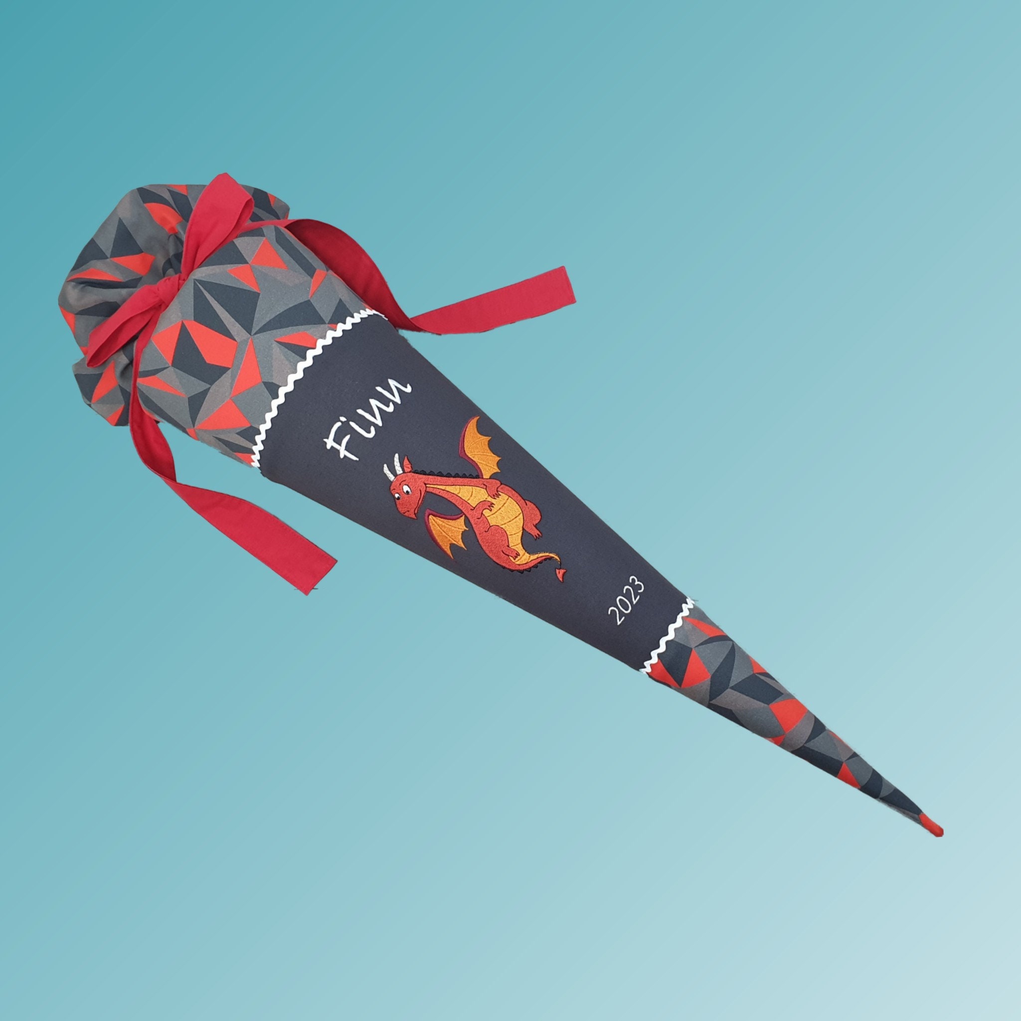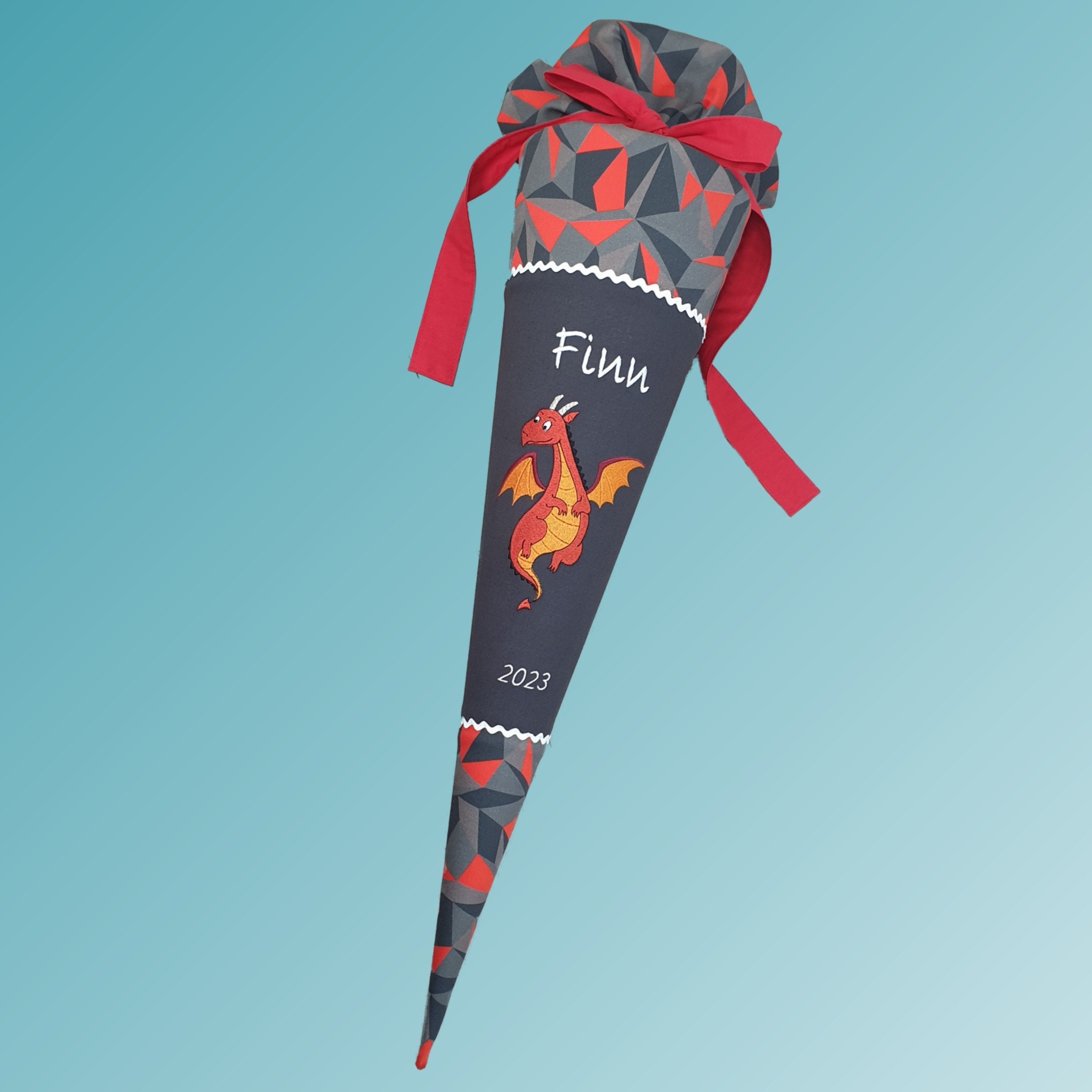 Die Schultüte ist mit Zackenlitze aus Baumwolle verziert und wird mit einem genähten Baumwollband sicher verschlossen.