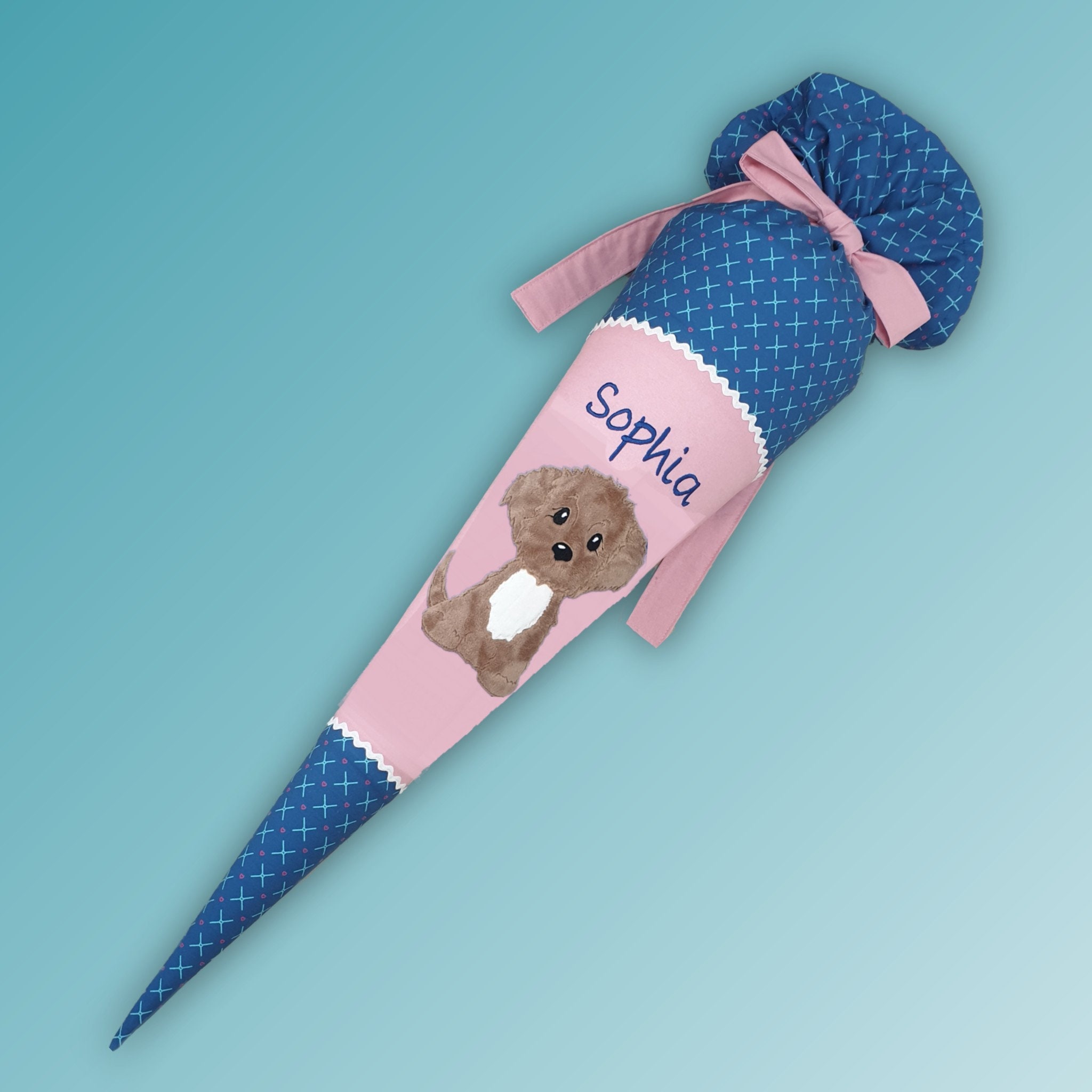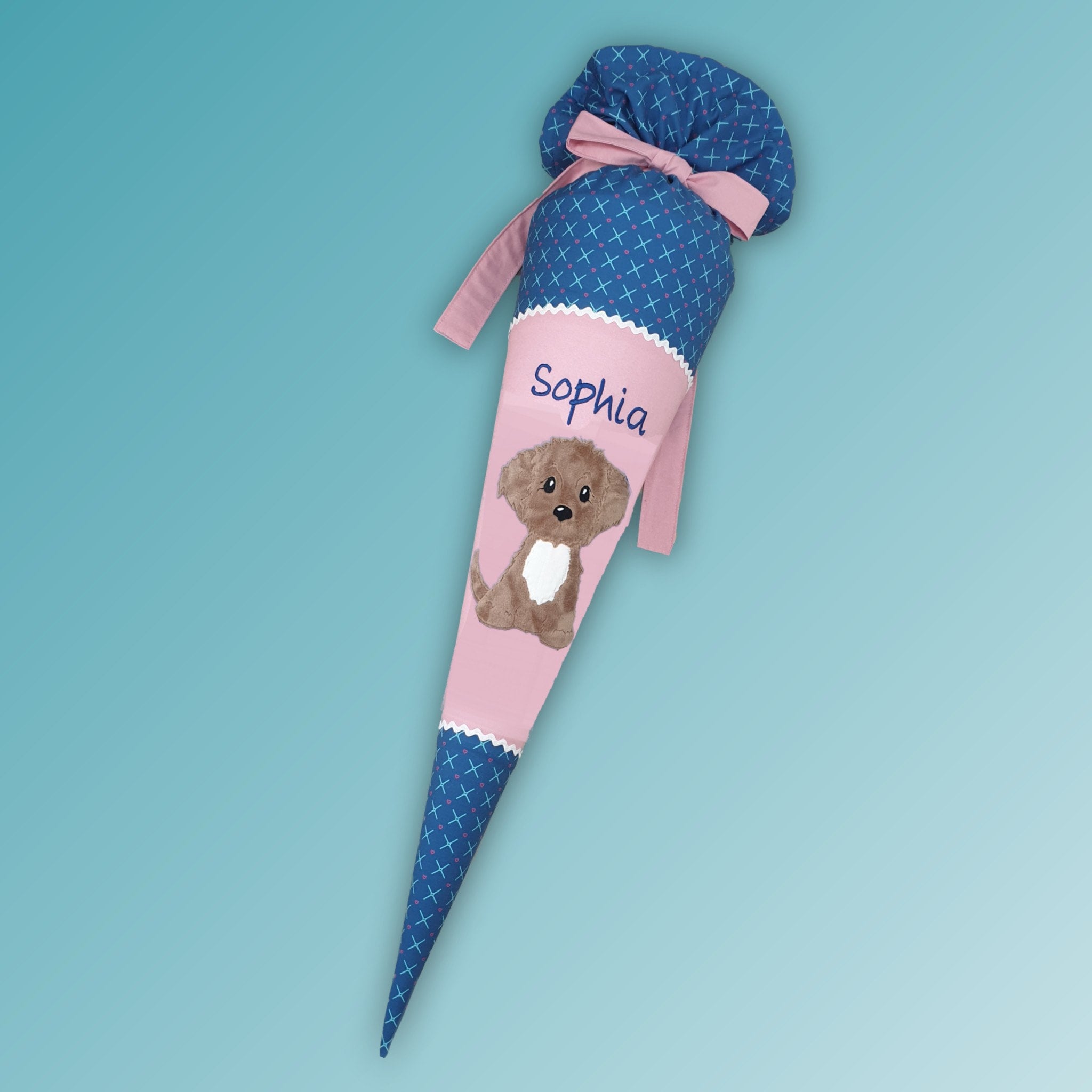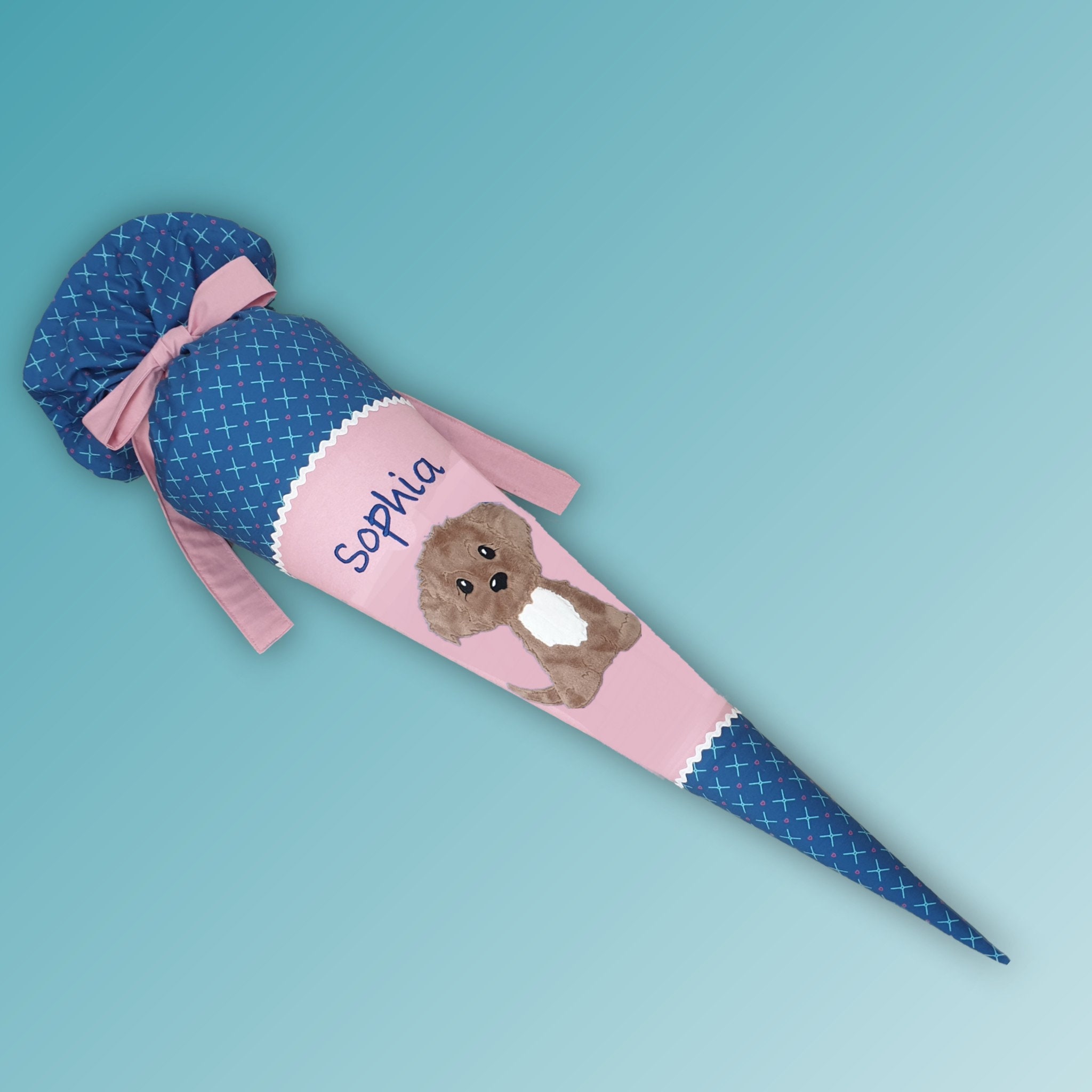 Schultüte mit Hund und Namen farblich auf den Mila Schulranzen abgestimmt.