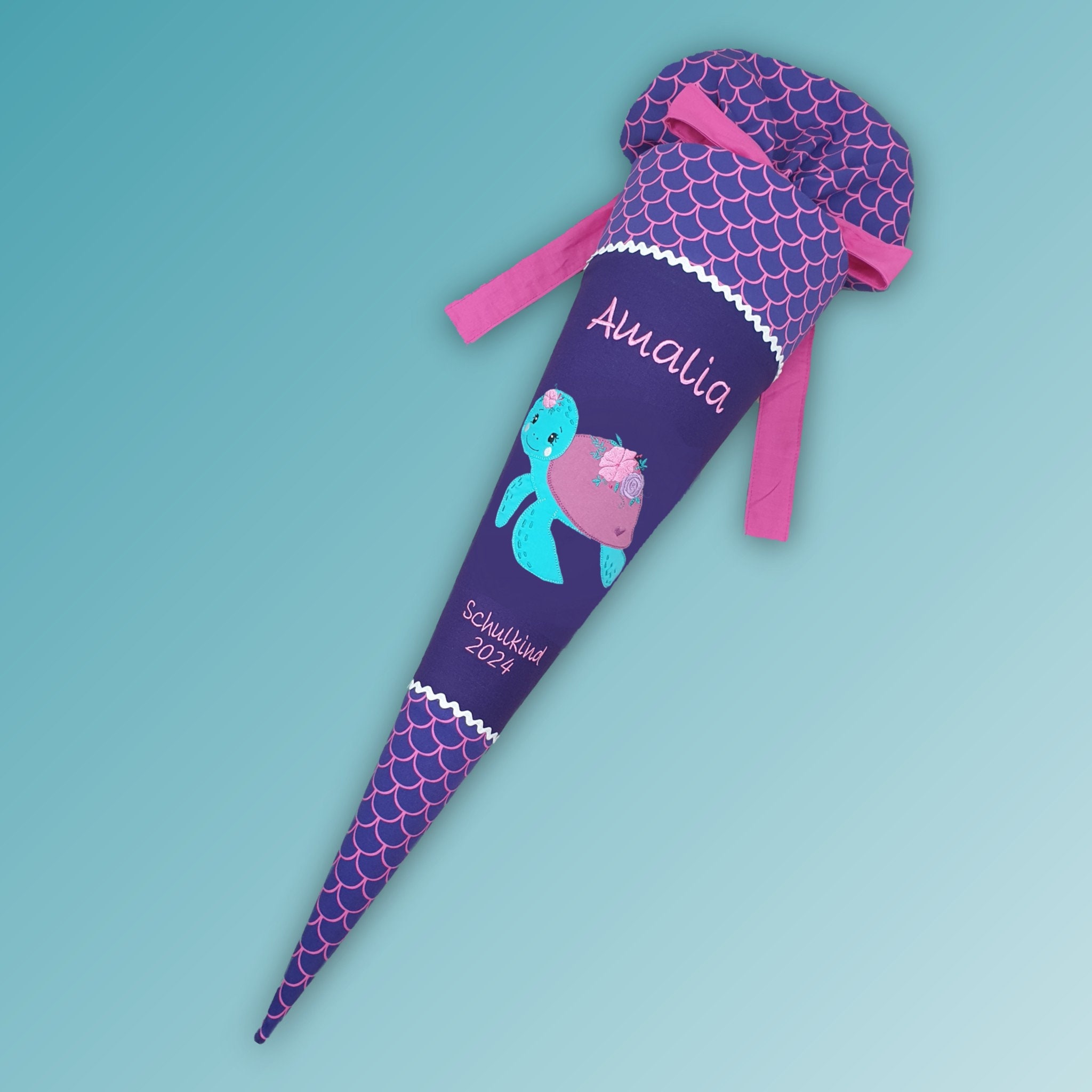 Schultüte mit Schildkröte und Namen farblich auf den Ergobag Perlentauchbär Schulranzen abgestimmt.