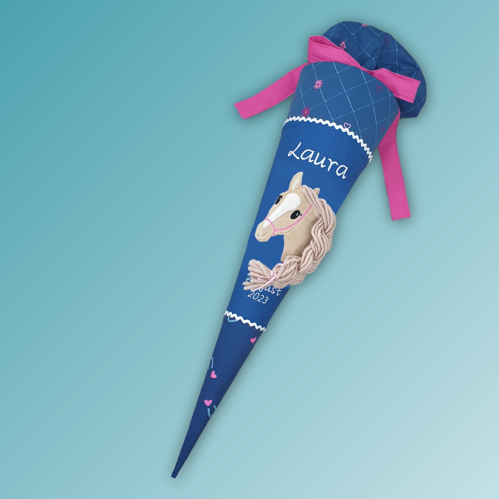 Schultüte mit 3D Pferdekopf und Namen farblich auf den Step by Step Horse Lima Schulranzen abgestimmt.