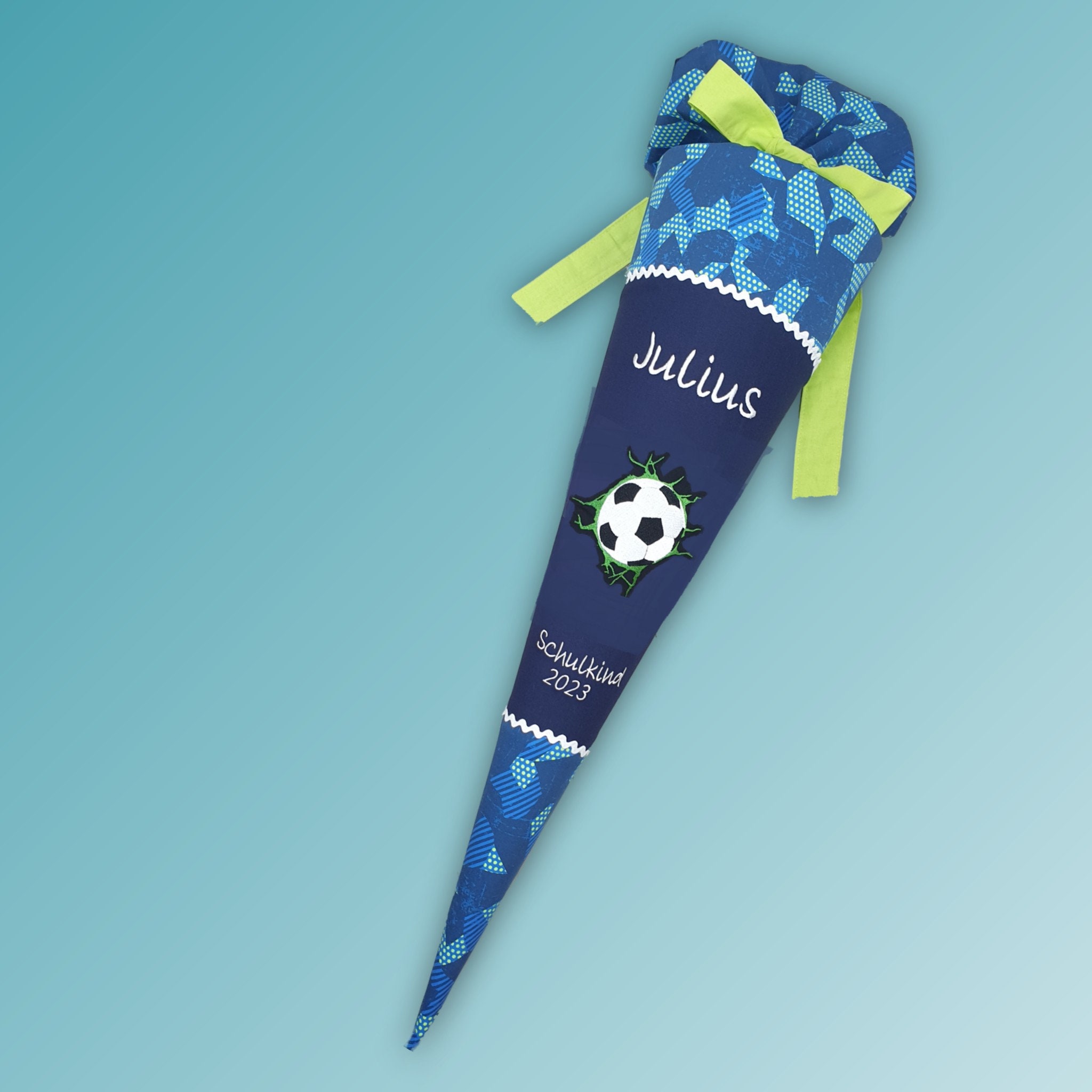 Jede Schultüte wird mit einem gestickten Motiv und dem Namen deines Kindes individuell gestaltet. Auf Wunsch fügen wir auch das Datum des ersten Schultages hinzu.