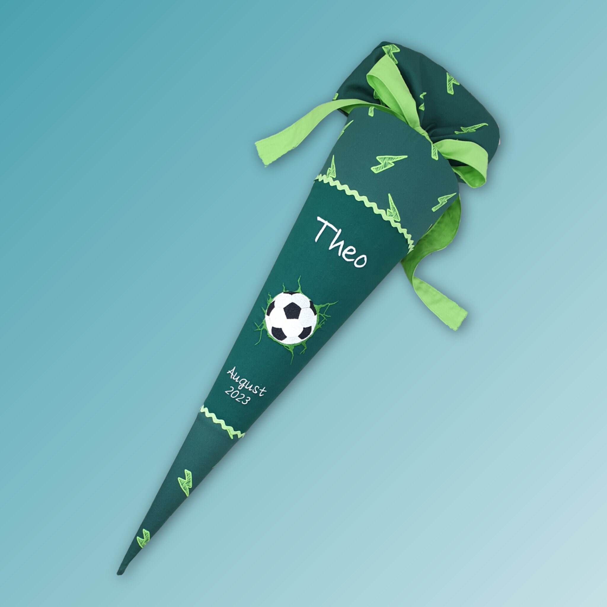 Schultüte mit Fusball und Namen farblich auf den Ergobag Bärtastisch Schulranzen abgestimmt.