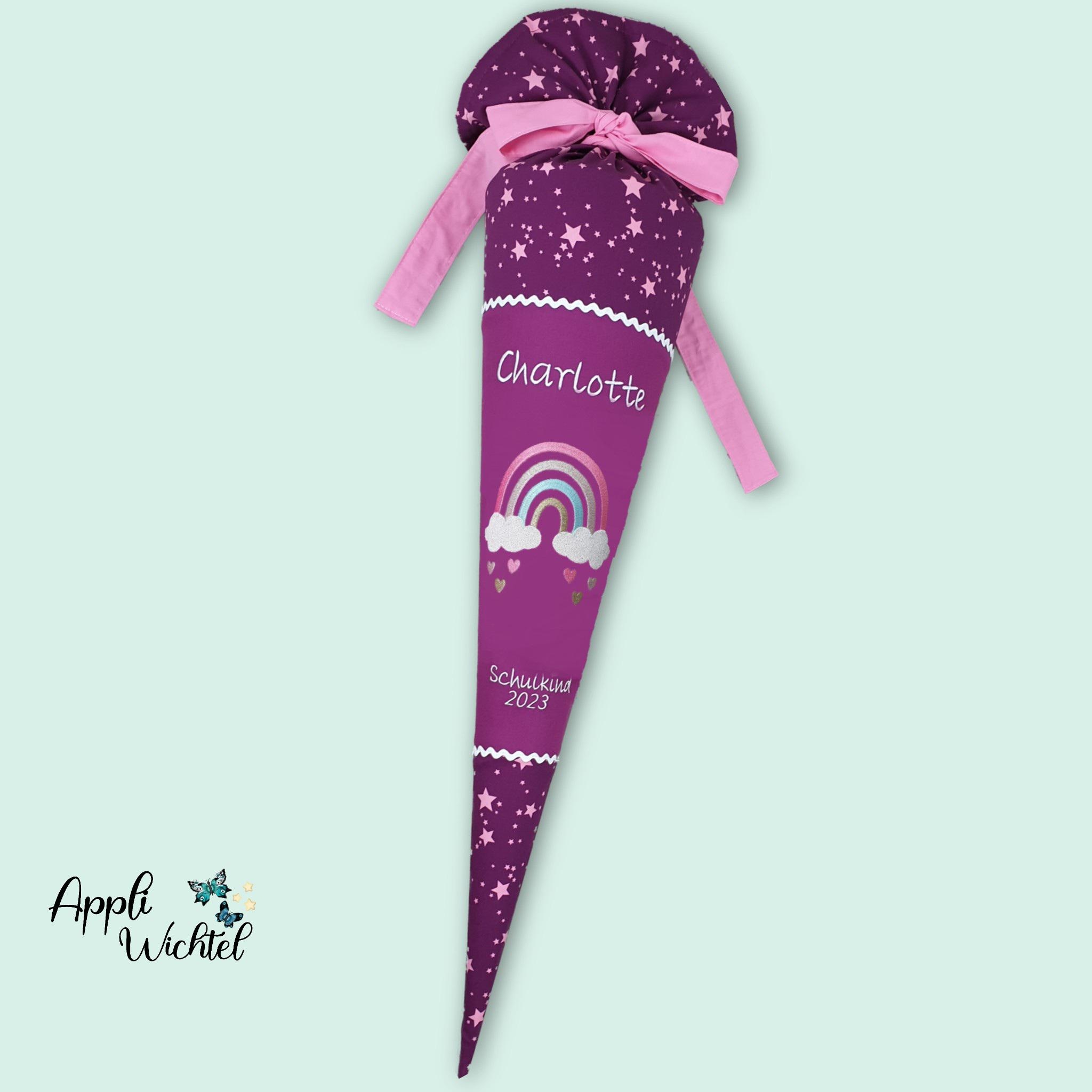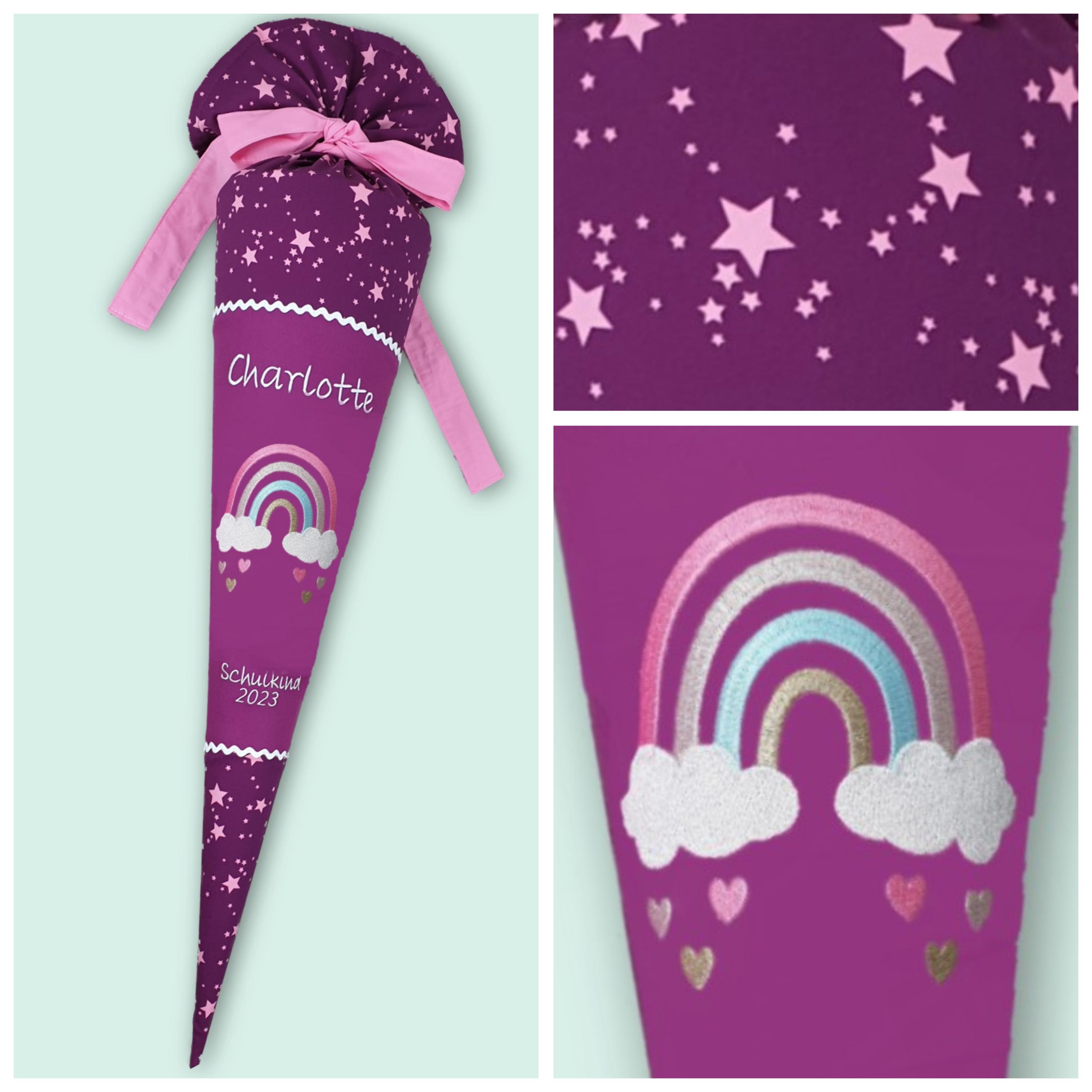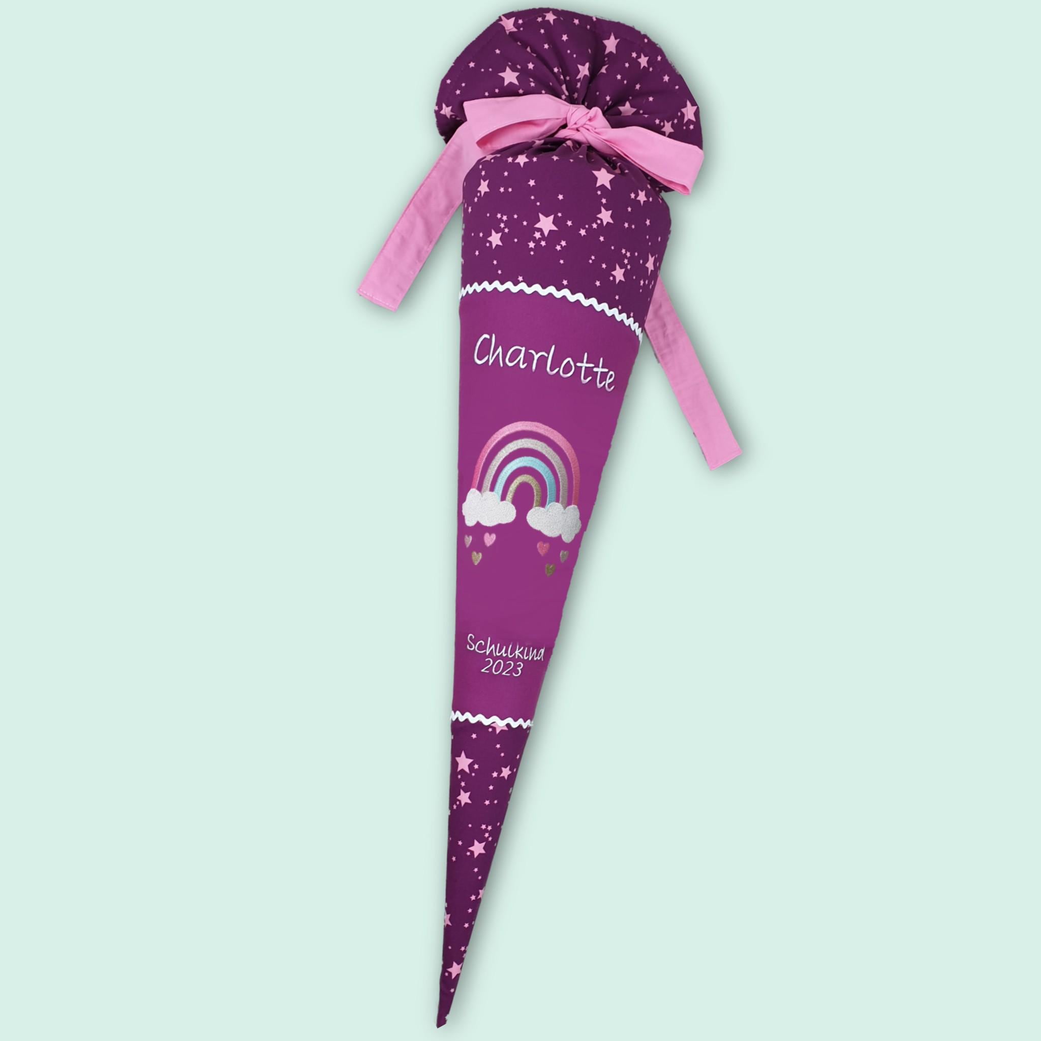Jede Schultüte wird mit einem gestickten Motiv und dem Namen deines Kindes individuell gestaltet. Auf Wunsch fügen wir auch das Datum des ersten Schultages hinzu.