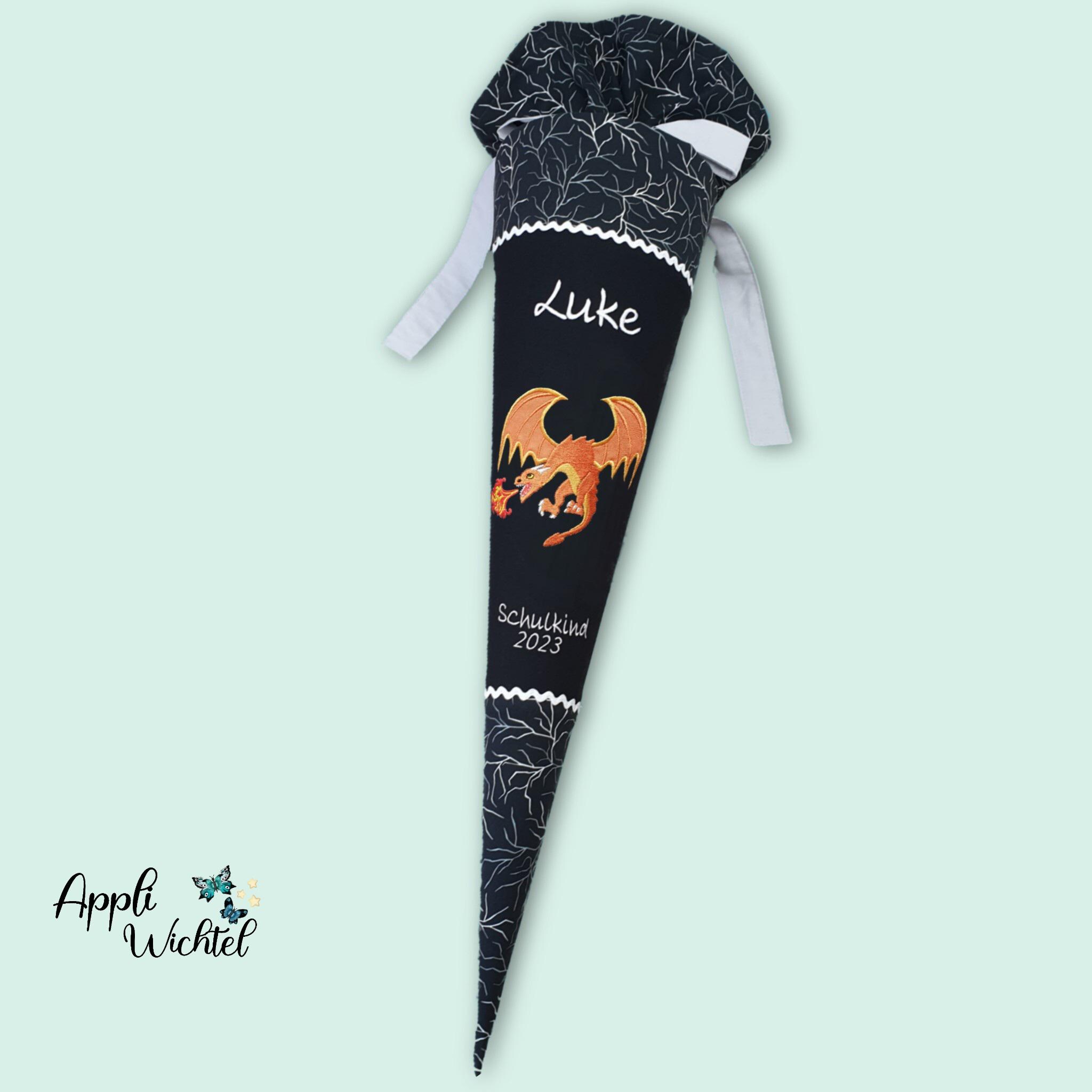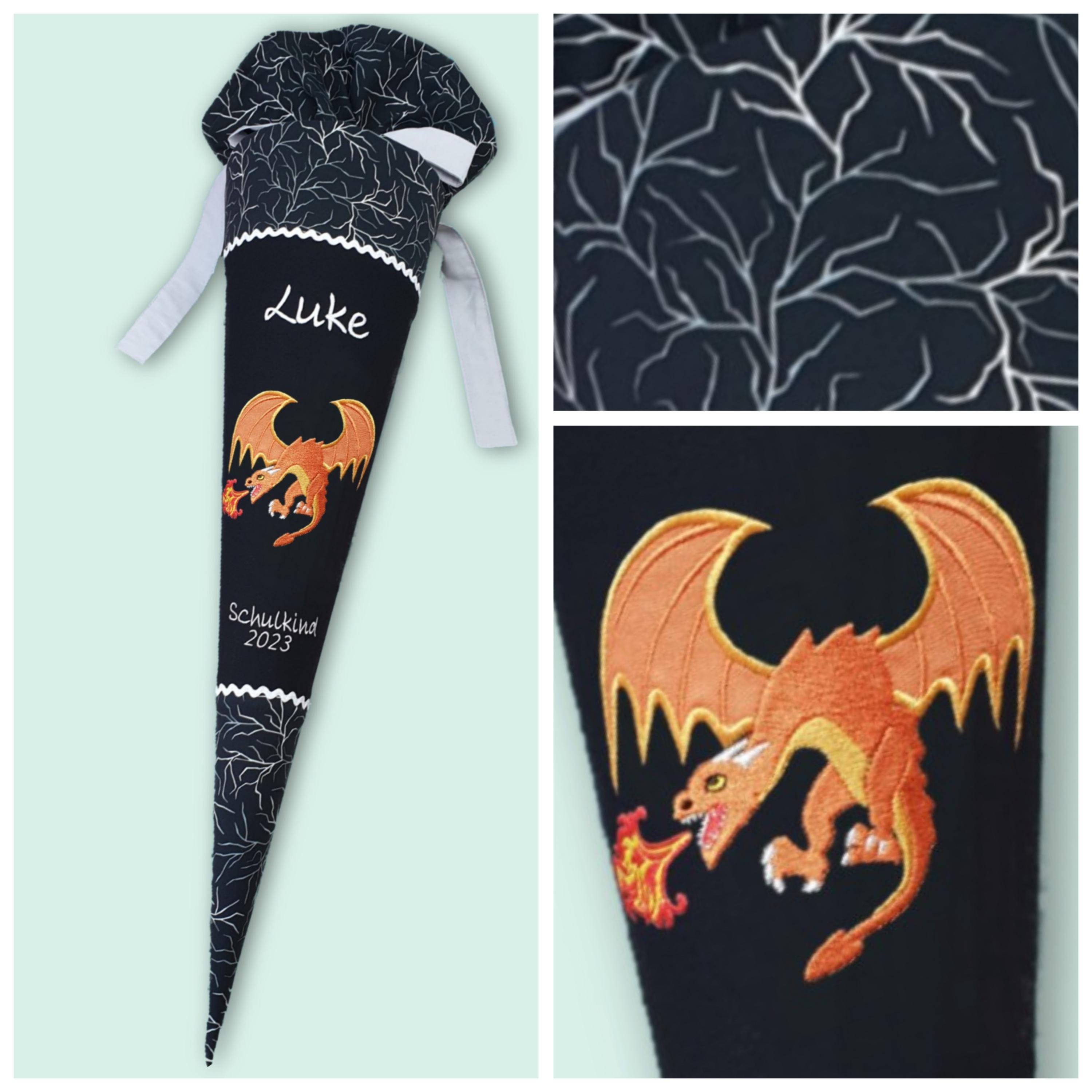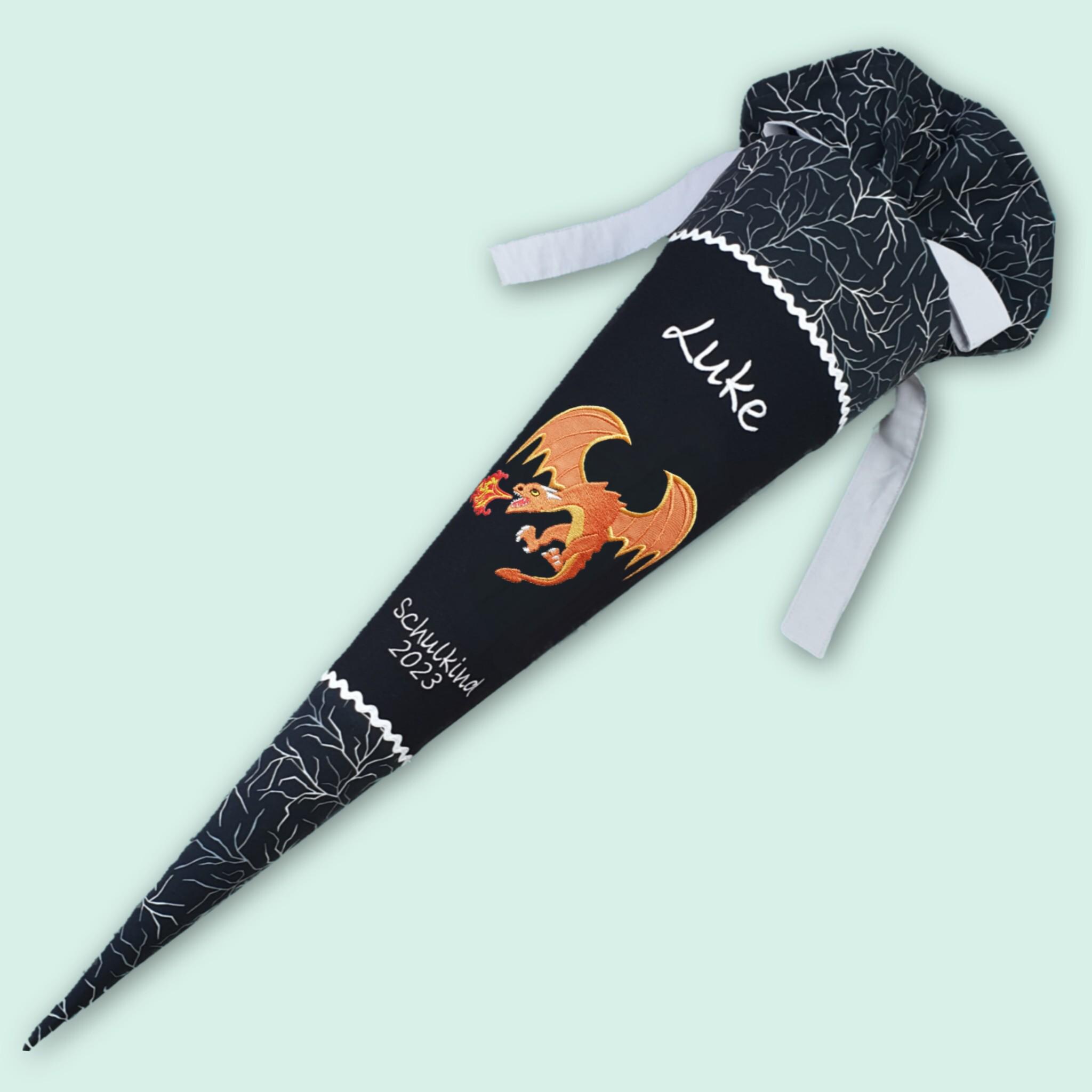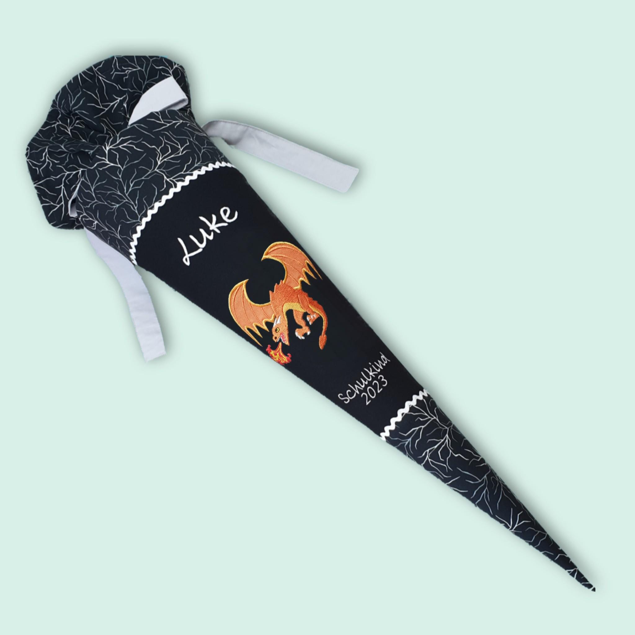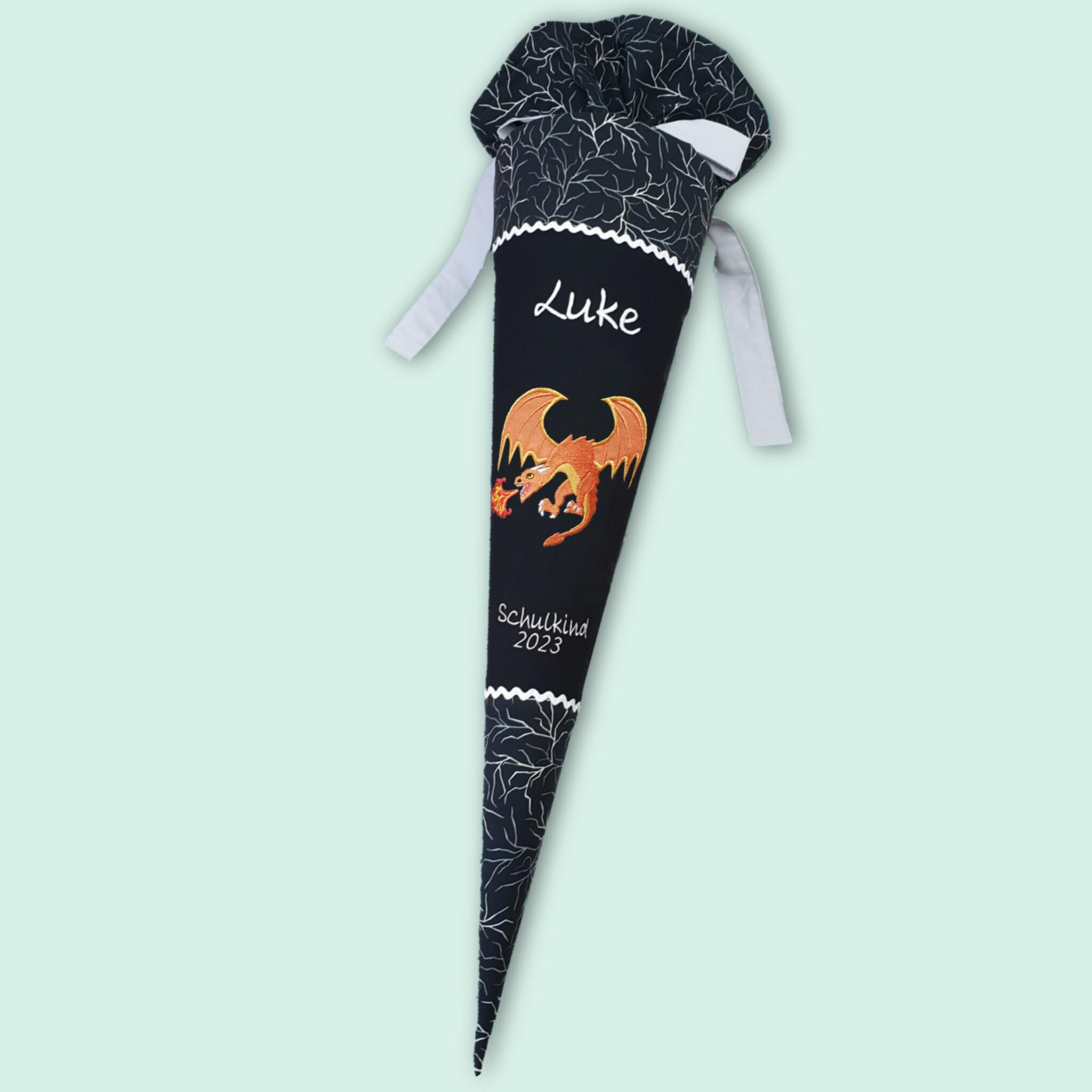 Schultüte mit Drache und Namen farblich auf den Ergobag Super ReflektBär Glow Schulranzen abgestimmt.
