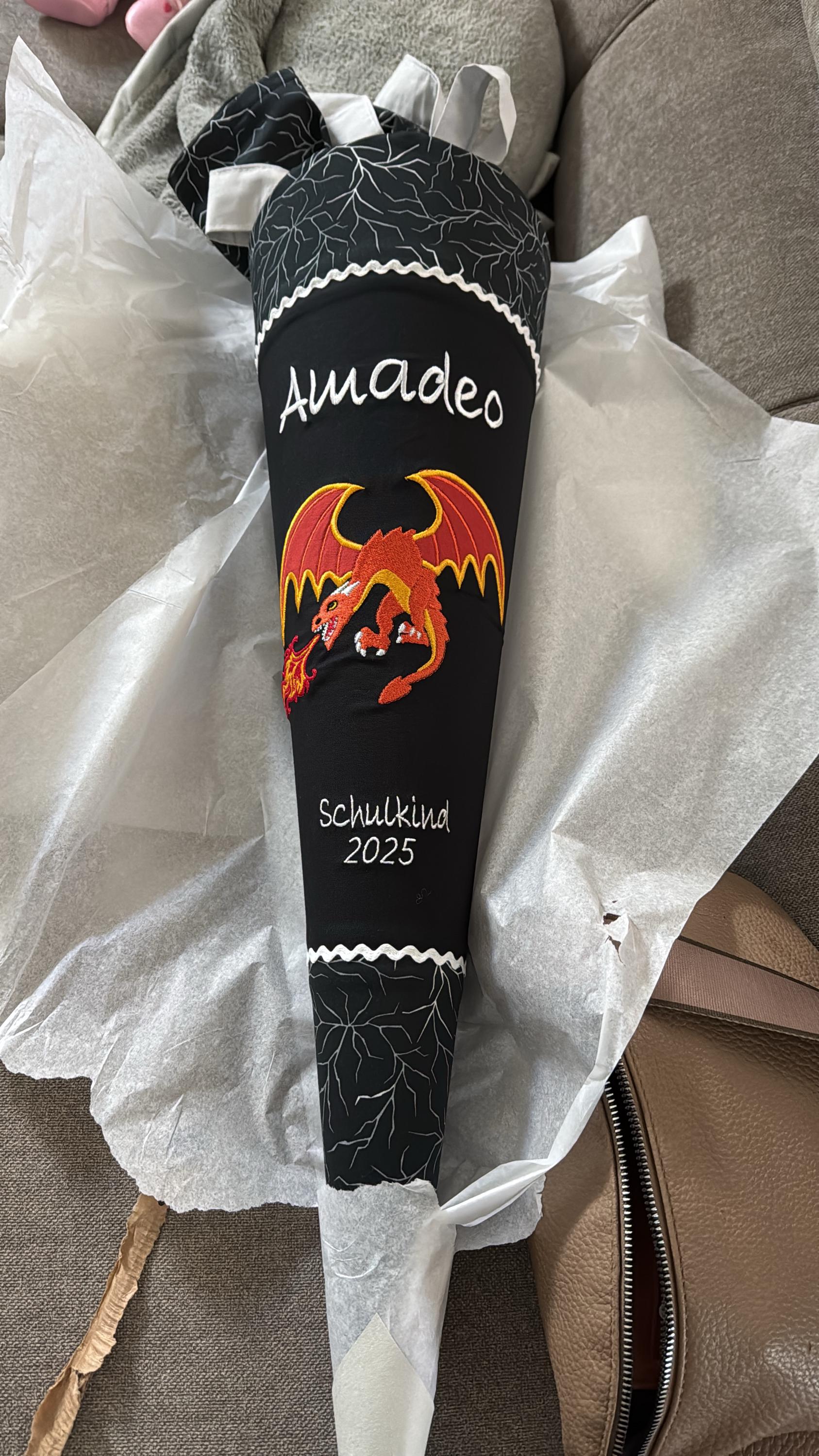 Jede Schultüte wird mit einem gestickten Motiv und dem Namen deines Kindes individuell gestaltet. Auf Wunsch fügen wir auch das Datum des ersten Schultages hinzu.