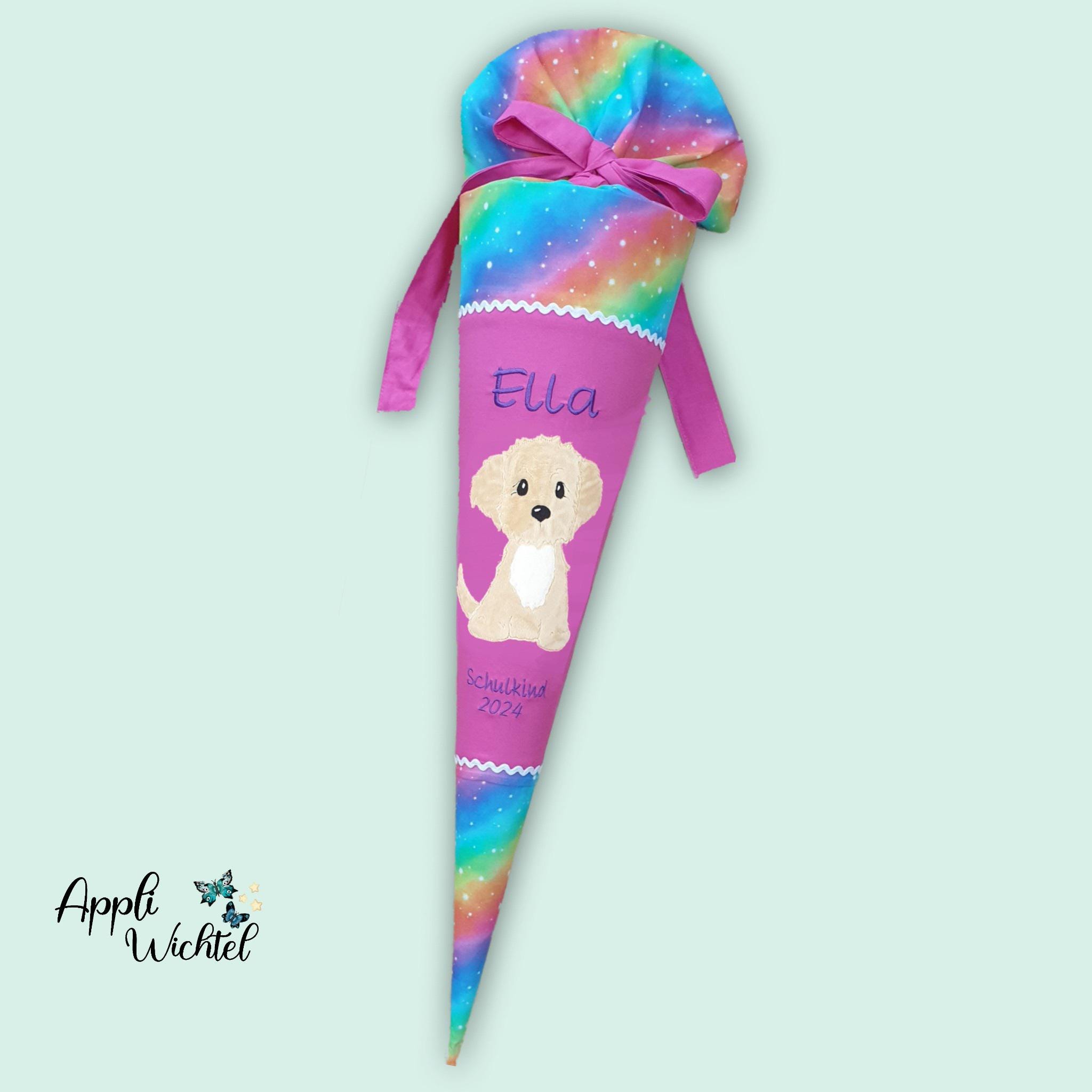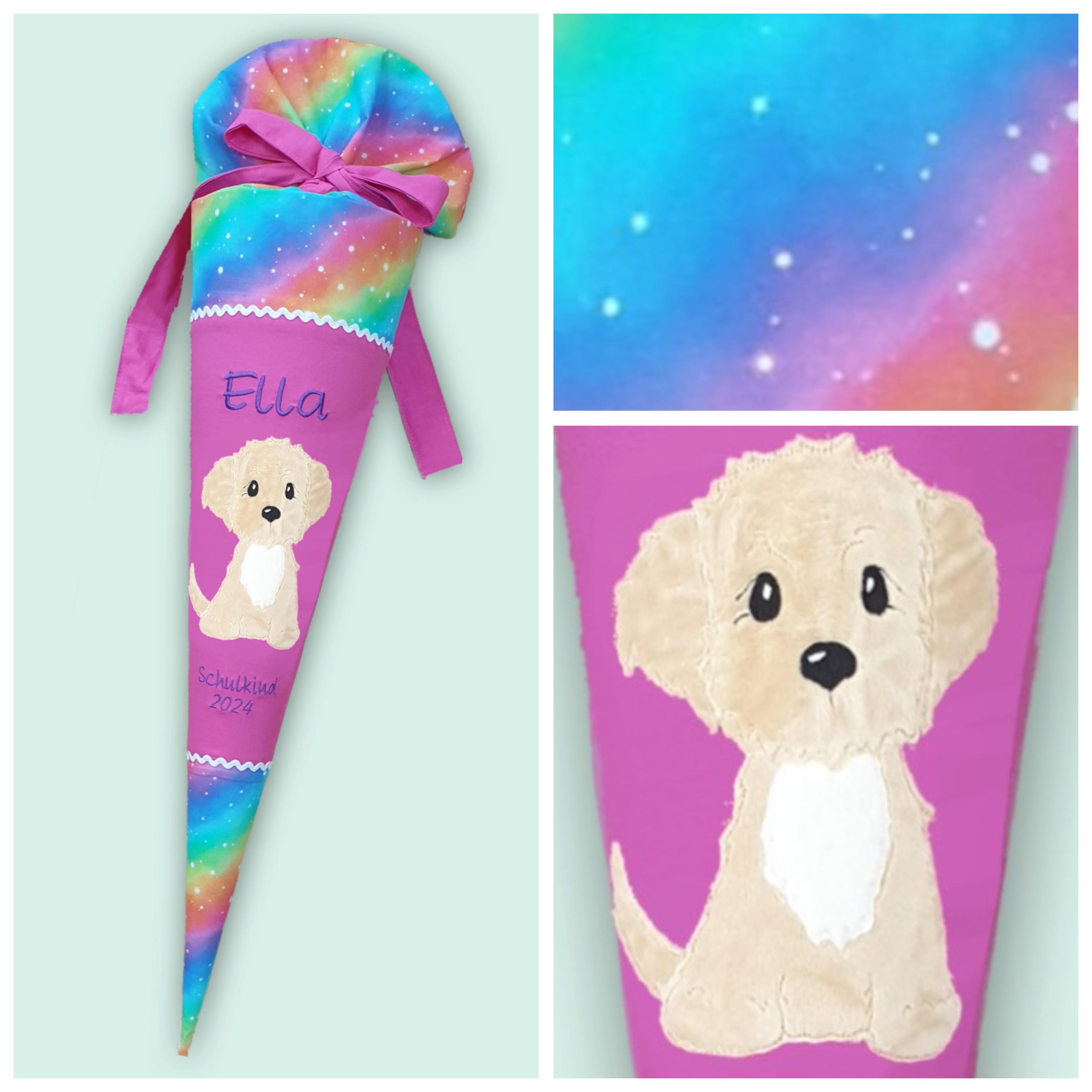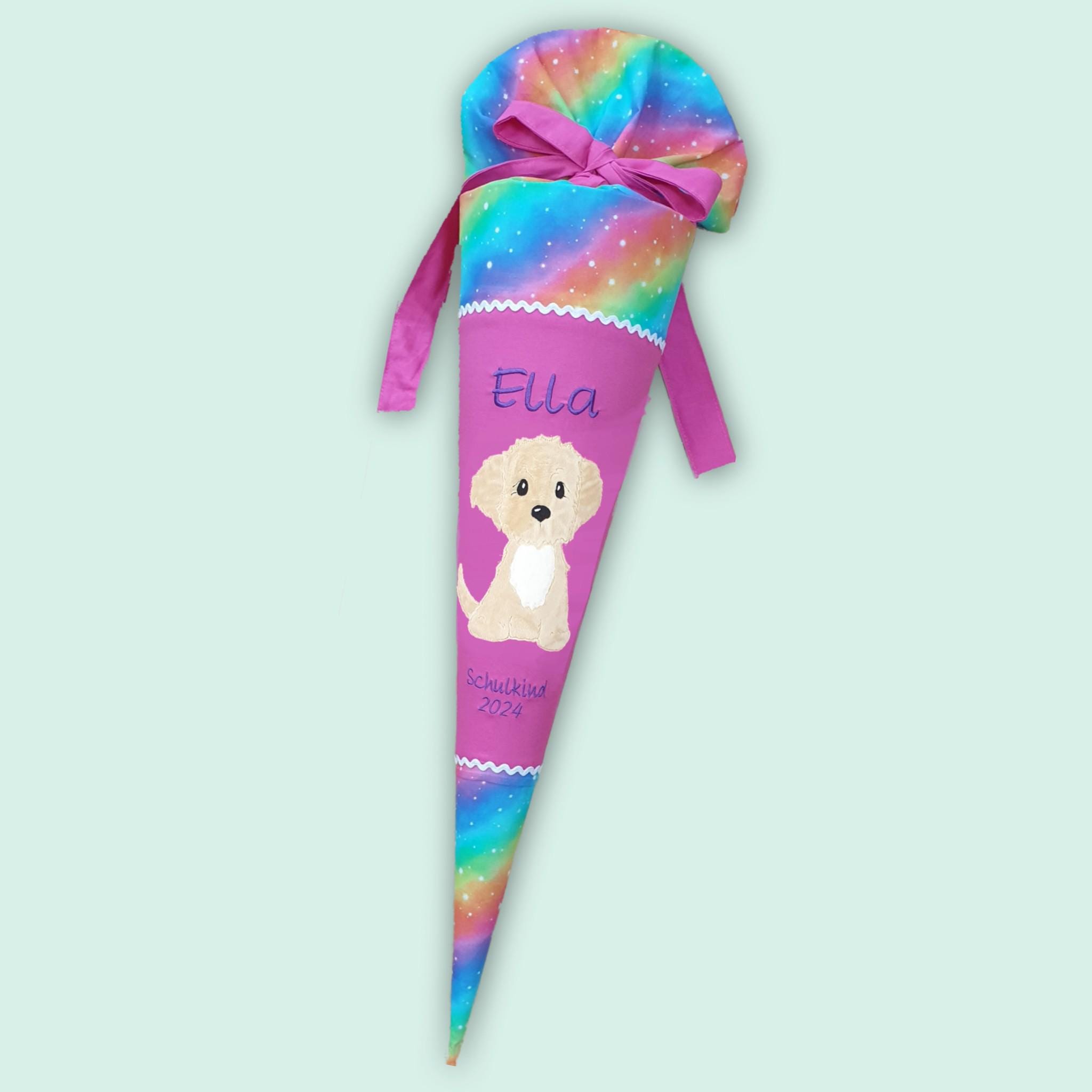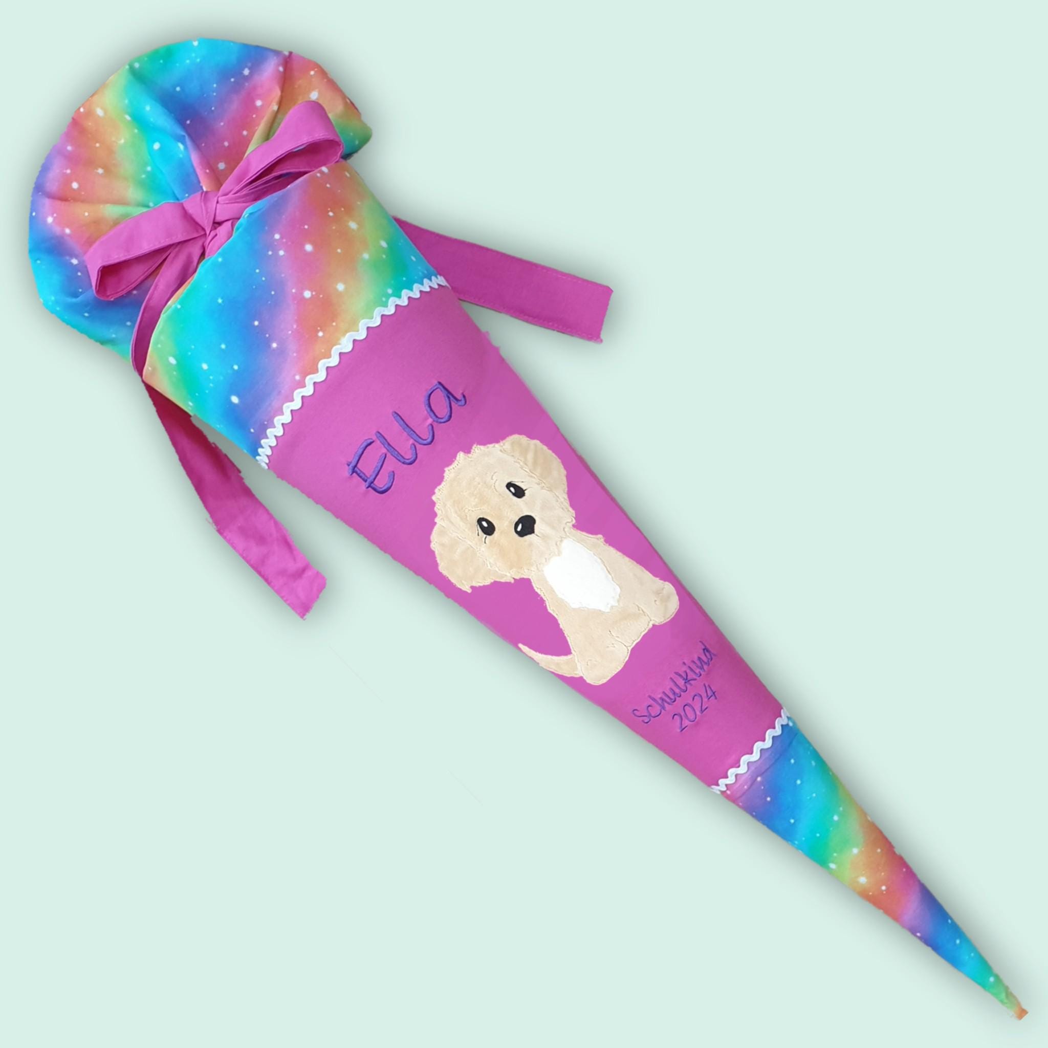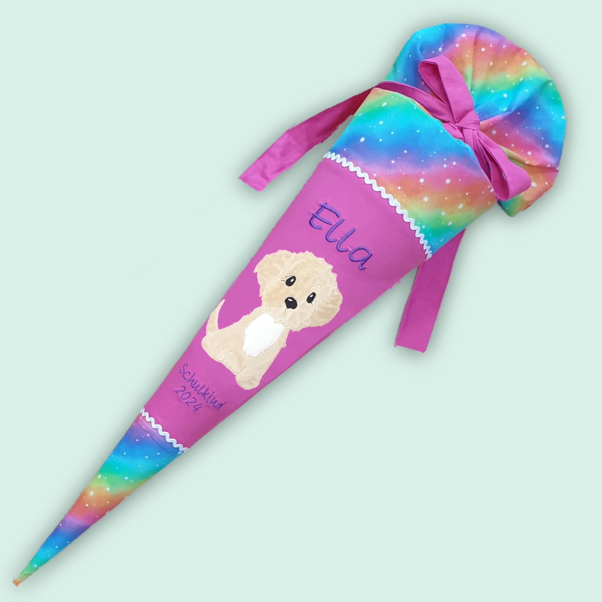 Schultüte mit Hund und Namen in Regenbogenfarben